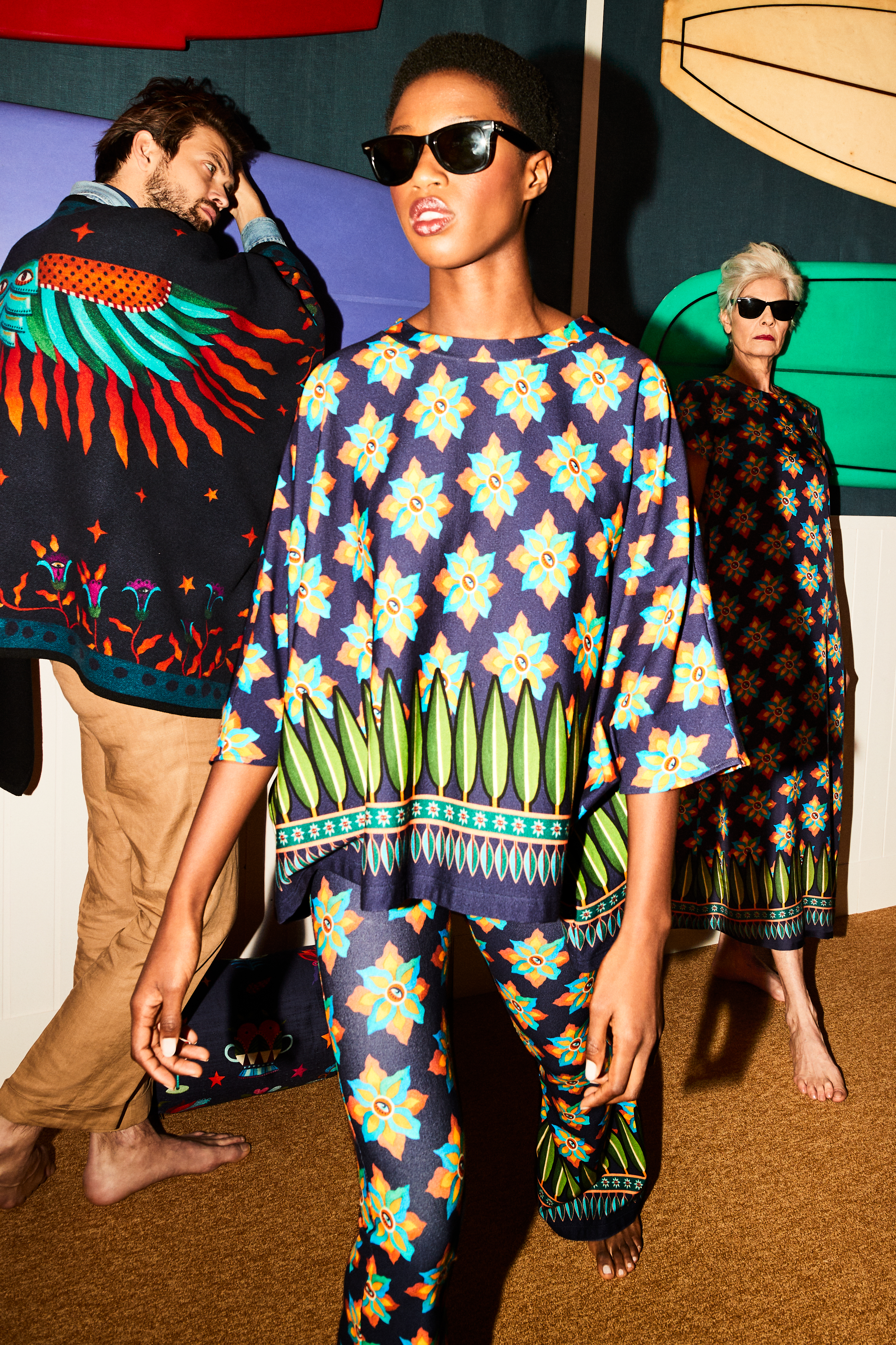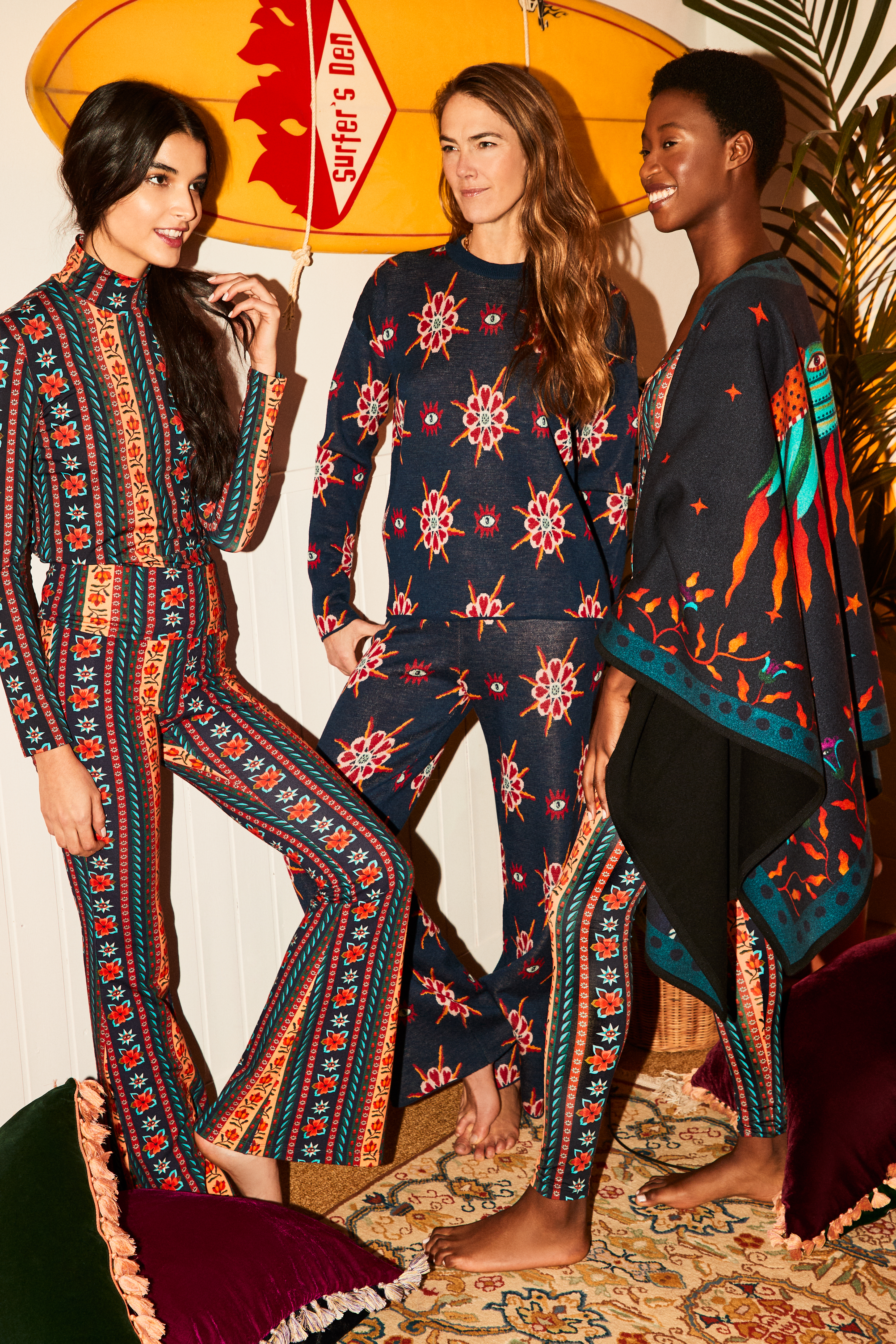 Designed for sun salutations and mimosa breakfasts alike, our soul-leisure kit comprises a 360 collection of separates, cut in Goddess-inspired original prints, created by Romanian artist, Heliana Aitch. The seventies make a comeback in these silhouettes, like the Jazzercize suit, bell bottom Meditation Pants, and matching Meditation poncho, all arriving in soft, stretchy jerseys for maximalist comfort. A chic Jumper, Pants, and Reversible Bomber set rounds out the Meditation Capsule in our sumptuous Jacquard wool-silk blend, perfect for heading to the plane straight from one’s practice.