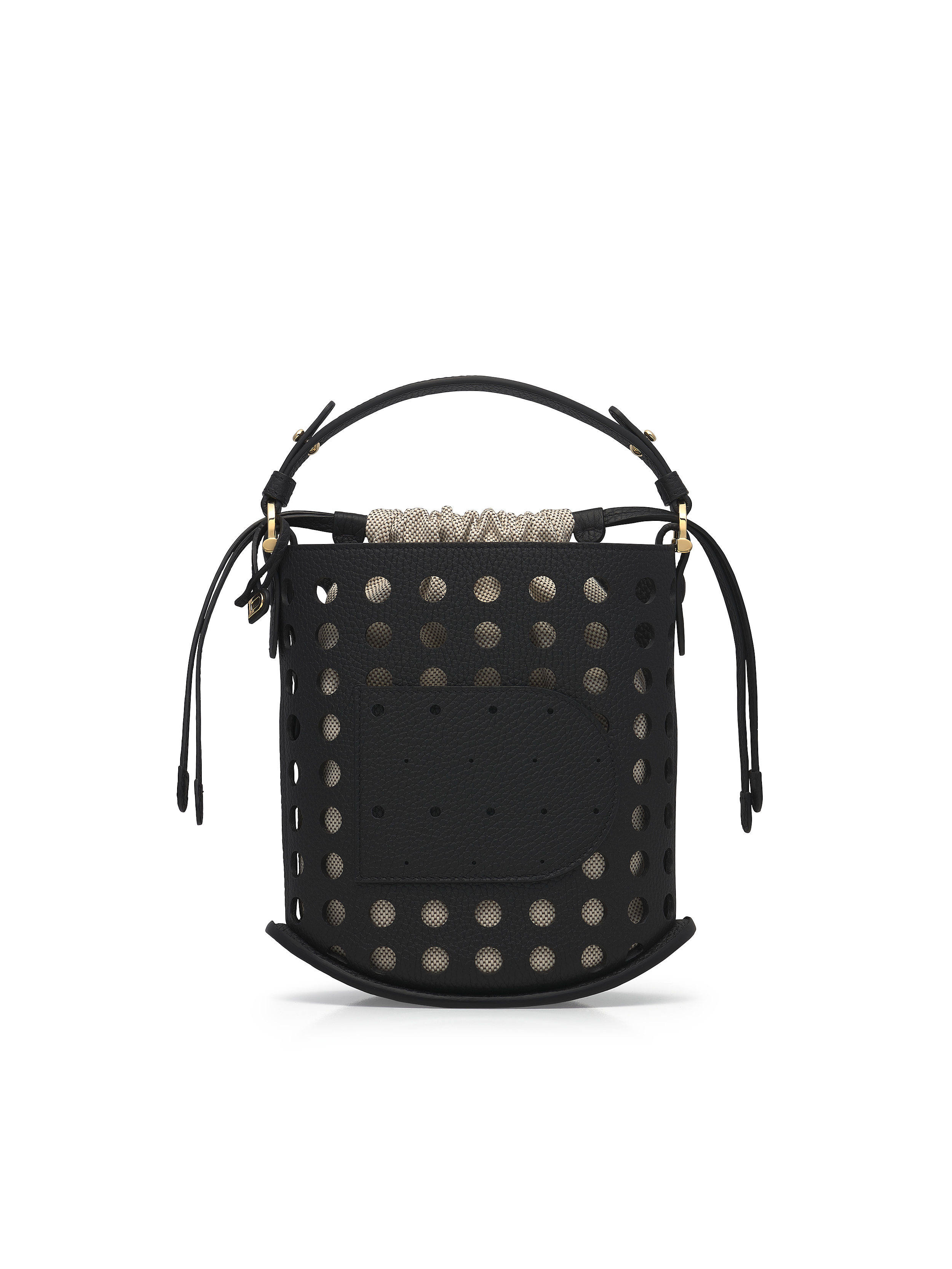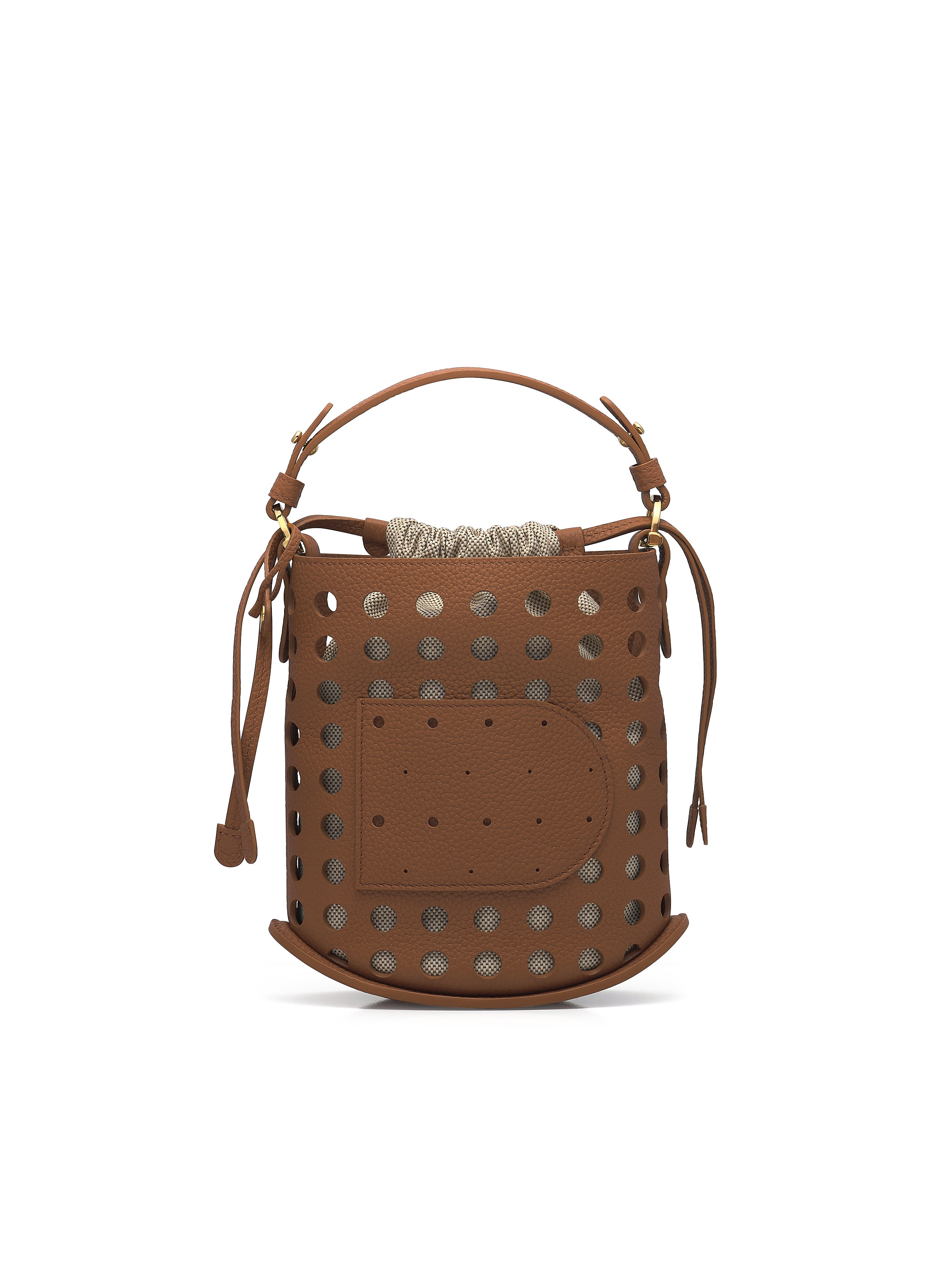 The Pin Airess signature is synonymous with airy ease. The bag draws inspiration from la Maison’s rich heritage, taking its cues from the 1946 Avia Airess suitcase and its interior metallic structure, which was pierced with holes to lighten the body and make it easier to carry. Today, these signature perforations add unprecedented weightlessness and flexibility to the Pin Mini Bucket’s silhouette, highlighting Delvaux’s leatherworking expertise and creative spirit.