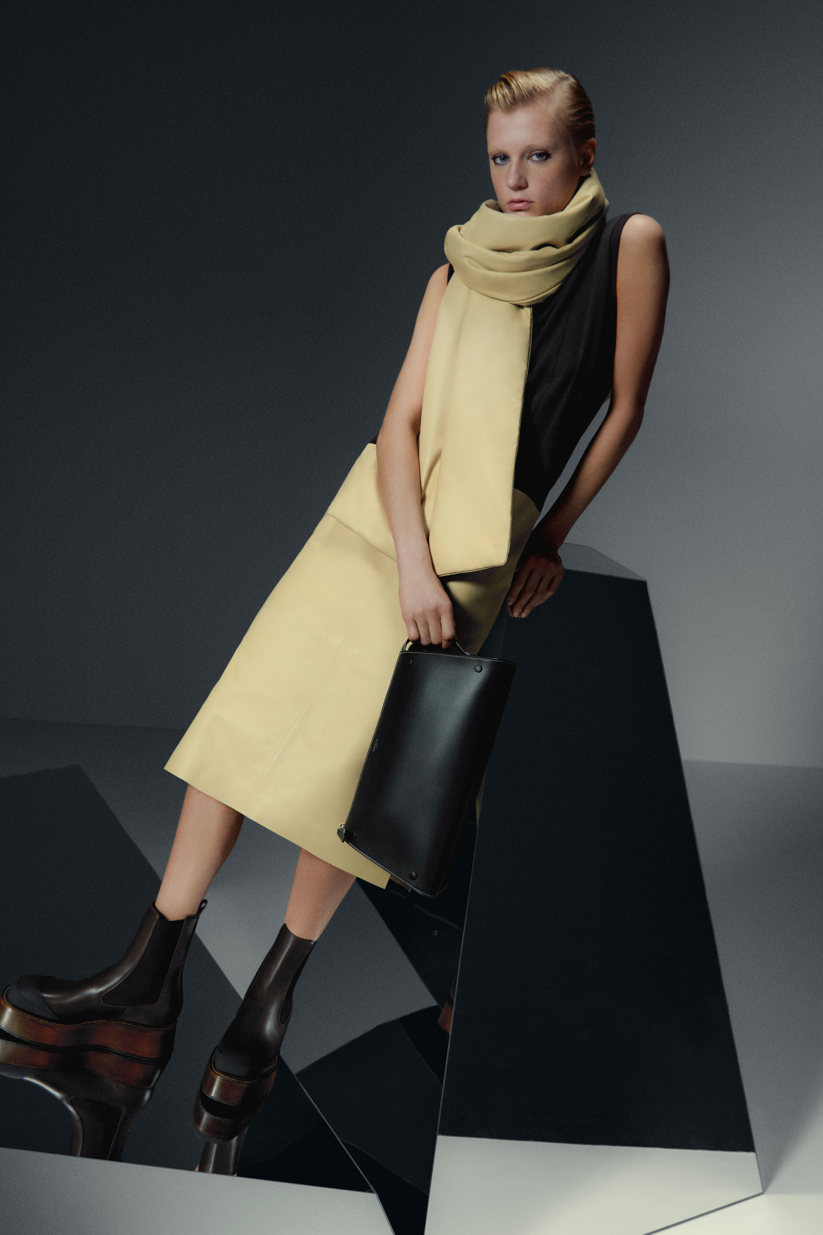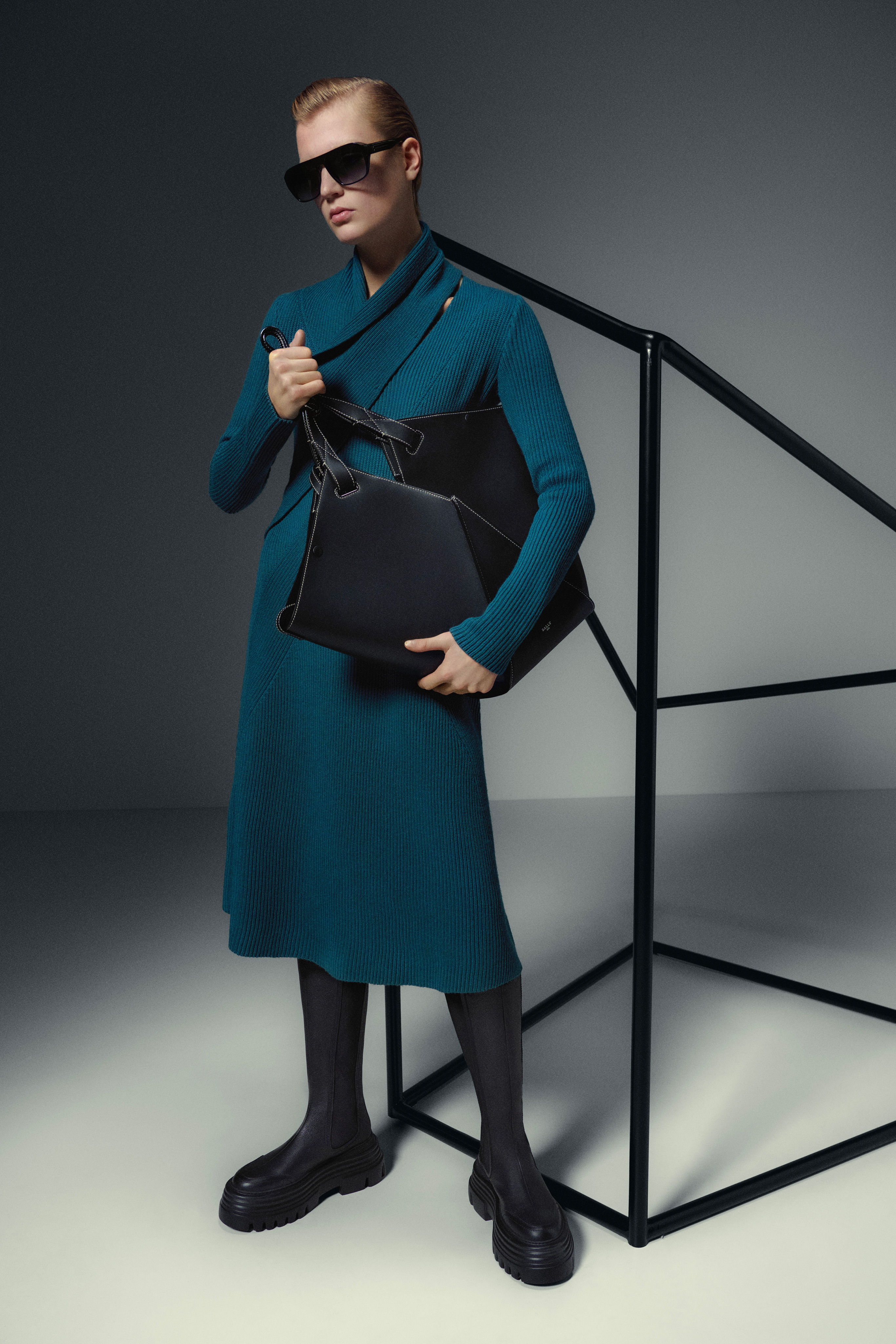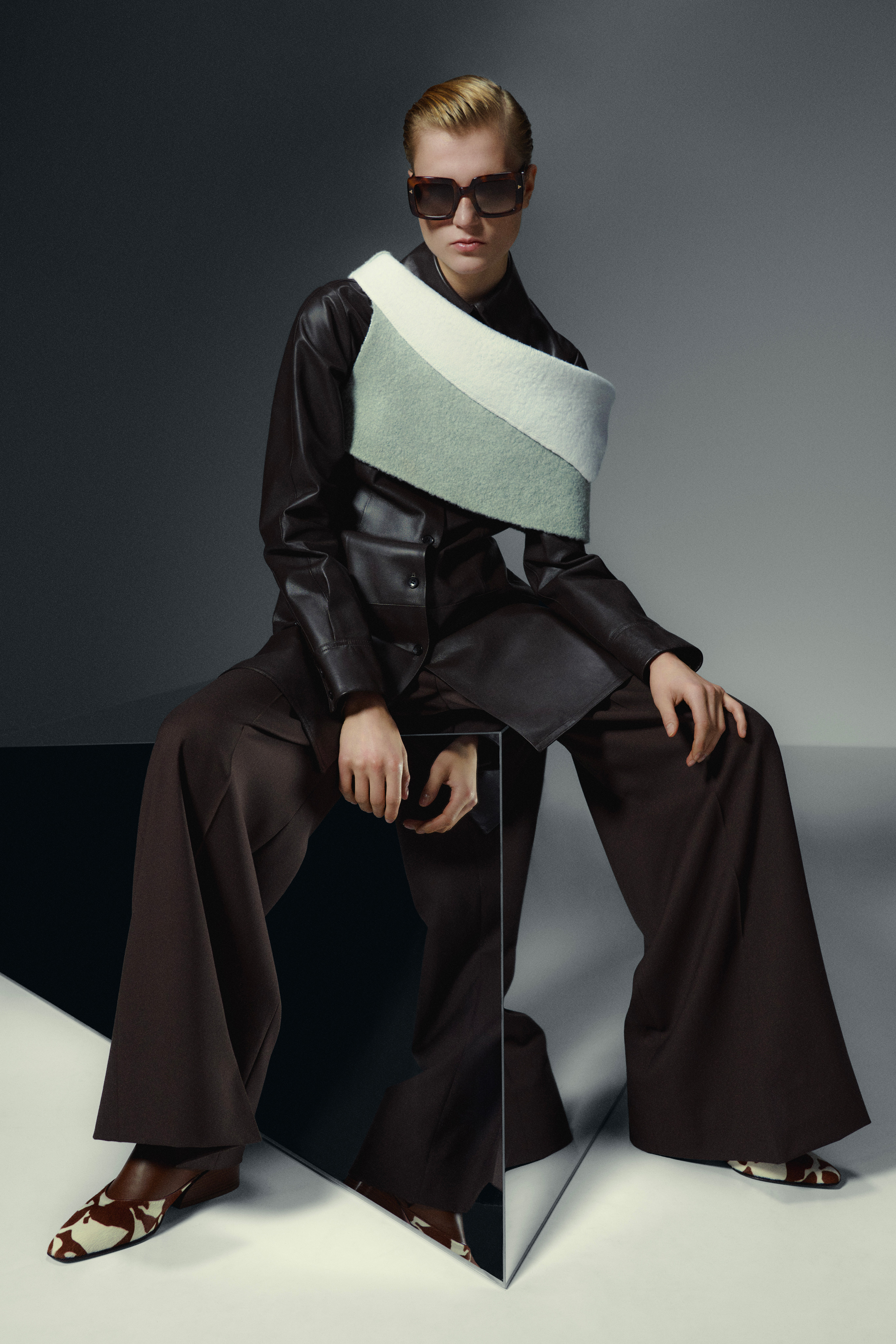 Furthering the modern wardrobe, loose, leather-crafted styles are layered alongside knitted silhouettes, or fully bonded together as contrast Heritage Red lining, playing with fundamental volume and proportions. Dark mineral denim-effect cotton suit jackets contrast soft leather trousers, while soft-ribbed knits and dresses with scarf details in ocean-inspired hues bring lightness and ethereal comfort. The season’s Alpine camouflage is streamlined into refined, recycled nylon joggers, designed with elegance and edge; soft-padded outwear, including a fossil trench with contrast cotton lining, boasts eco and cruelty-free insulation.