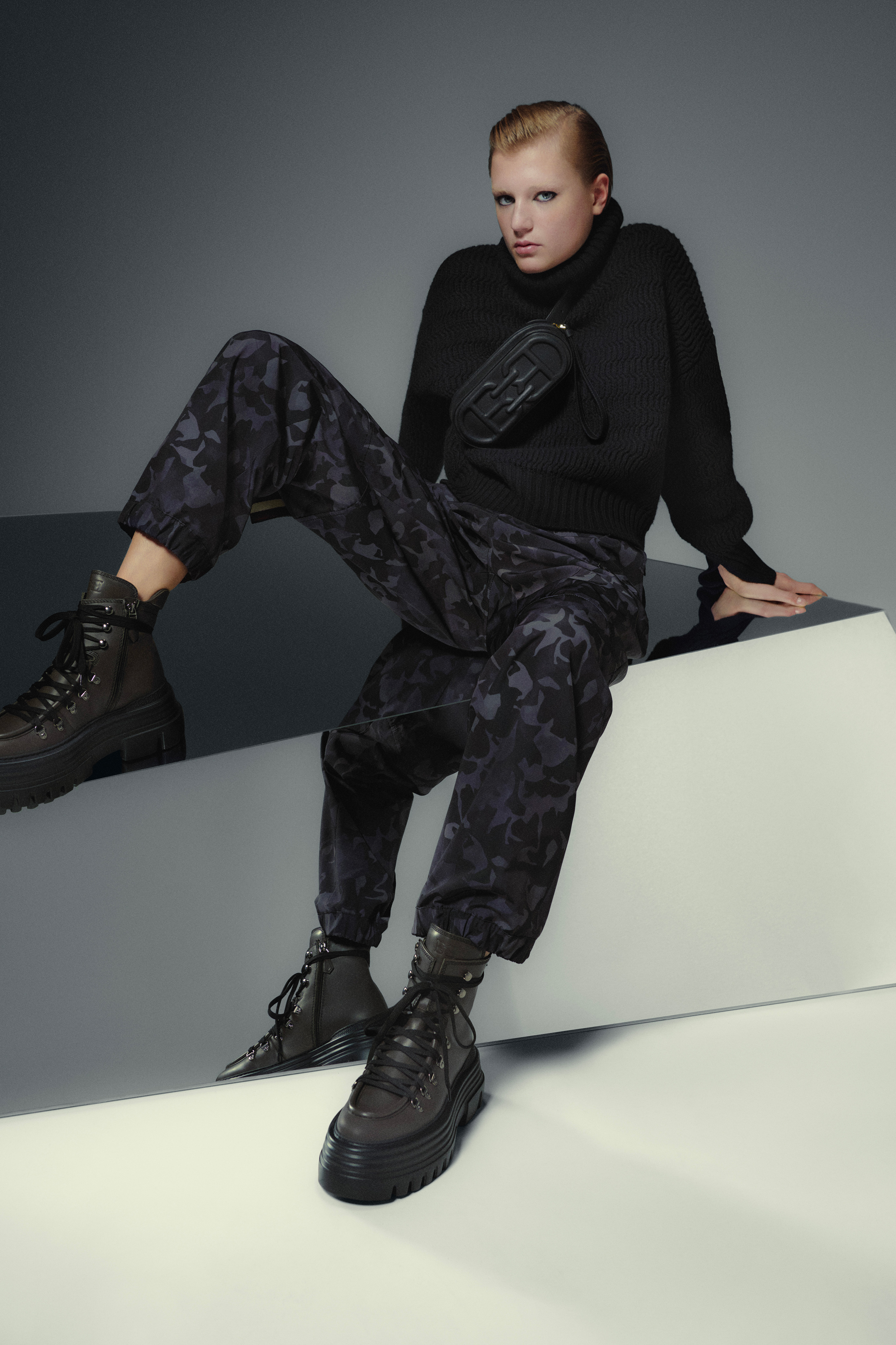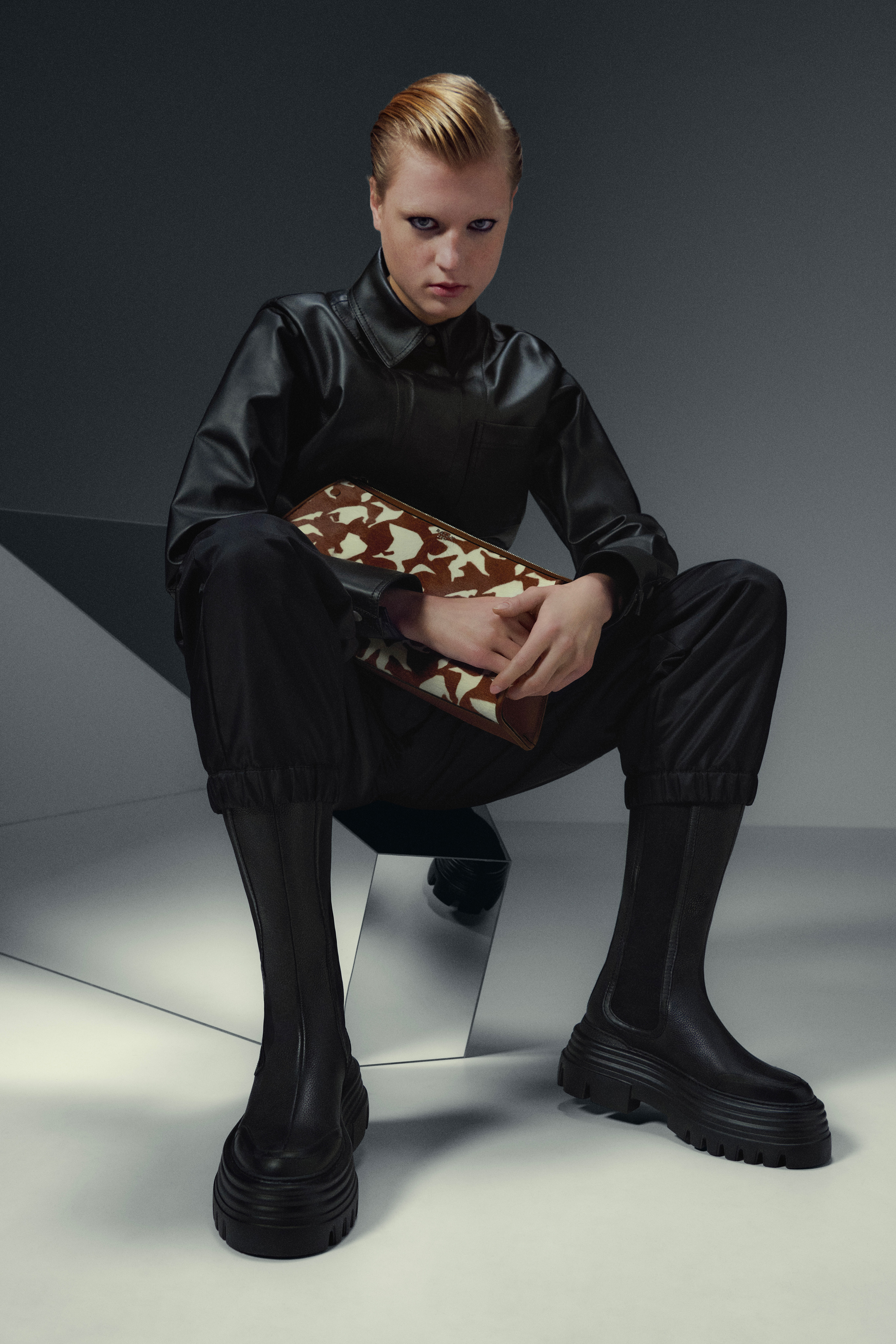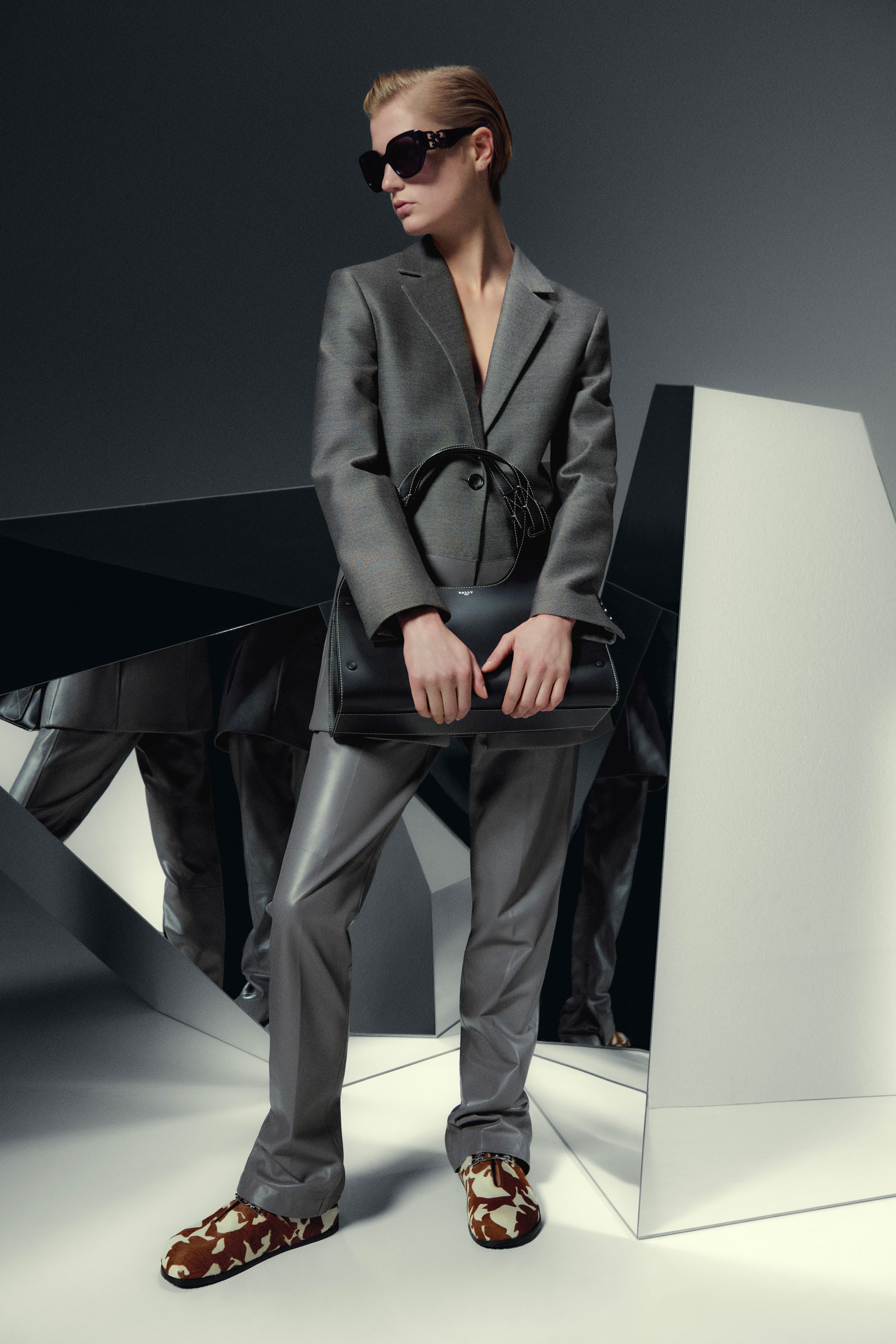 Recalling the brand’s Swiss origins, references to architecture and graphic design are articulated through origami-like structural handbags and curved, block-heels. Bally’s roots in the mountains are further honored by an organic palette including bone, fossil, tide and midnight. A play on the environment’s chromatic elegance, a new Alpine camouflage debuts, revealing a disguised dialogue among the shapes of nature.