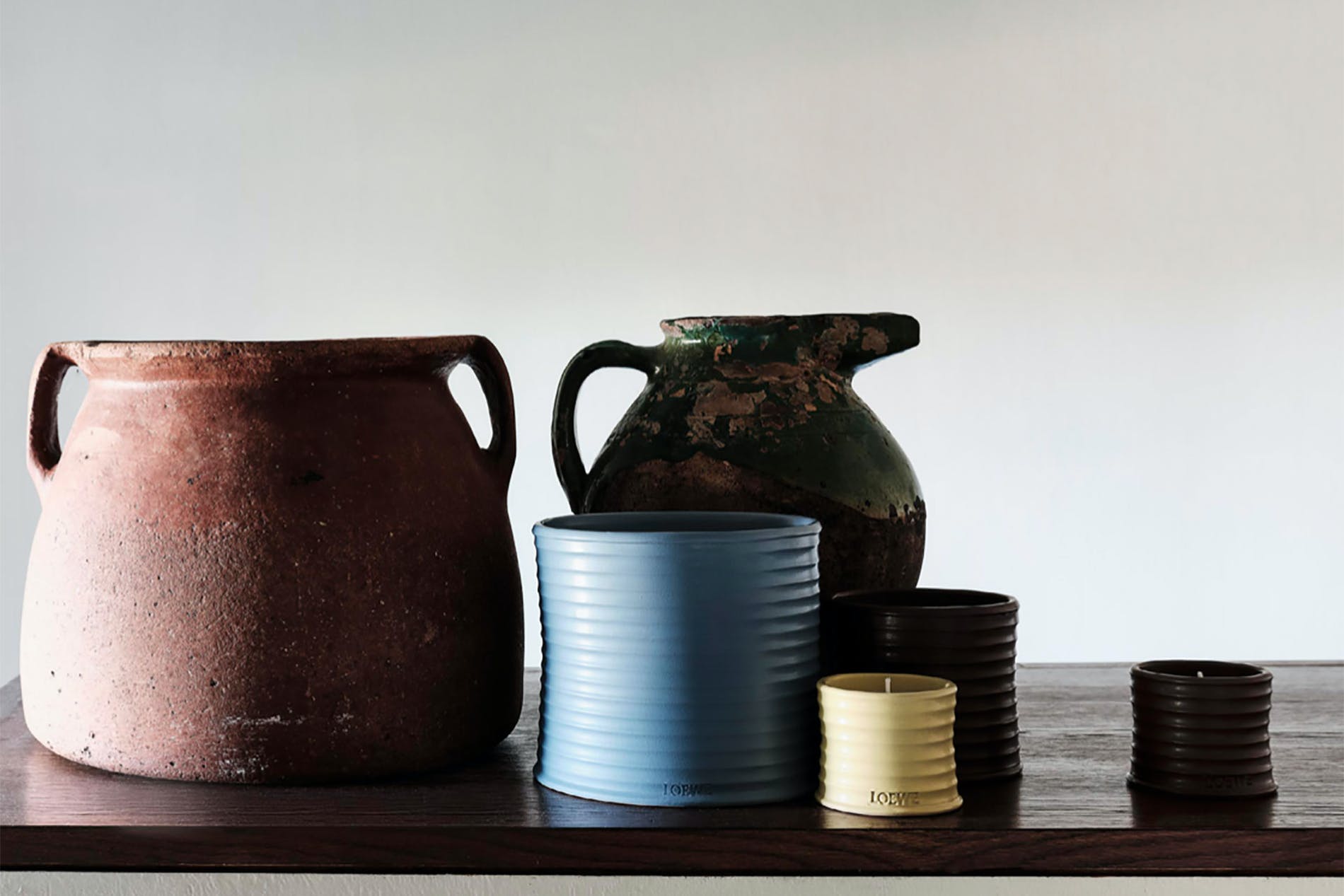 Tactility is key for me, as LOEWE’s ongoing engagement with the art of ceramics testifies. The ribbed terracotta pot that holds our candles is based on a 5th century BC Greek mug I bought at an auction several years ago. In the rhythmic purity of this incredibly old object, I find unquestionable modernity, and function: it offered the perfect template as a container for our candles, which come in three different sizes. A classic Louis XIV-era French ambeau informs the geometry of the other candle base: craft knows no historic border for me. Speaking of which, candles are made with wax derived purely from natural ingredients, and embossed with the LOEWE monogram and the message ‘Made in Spain’.
