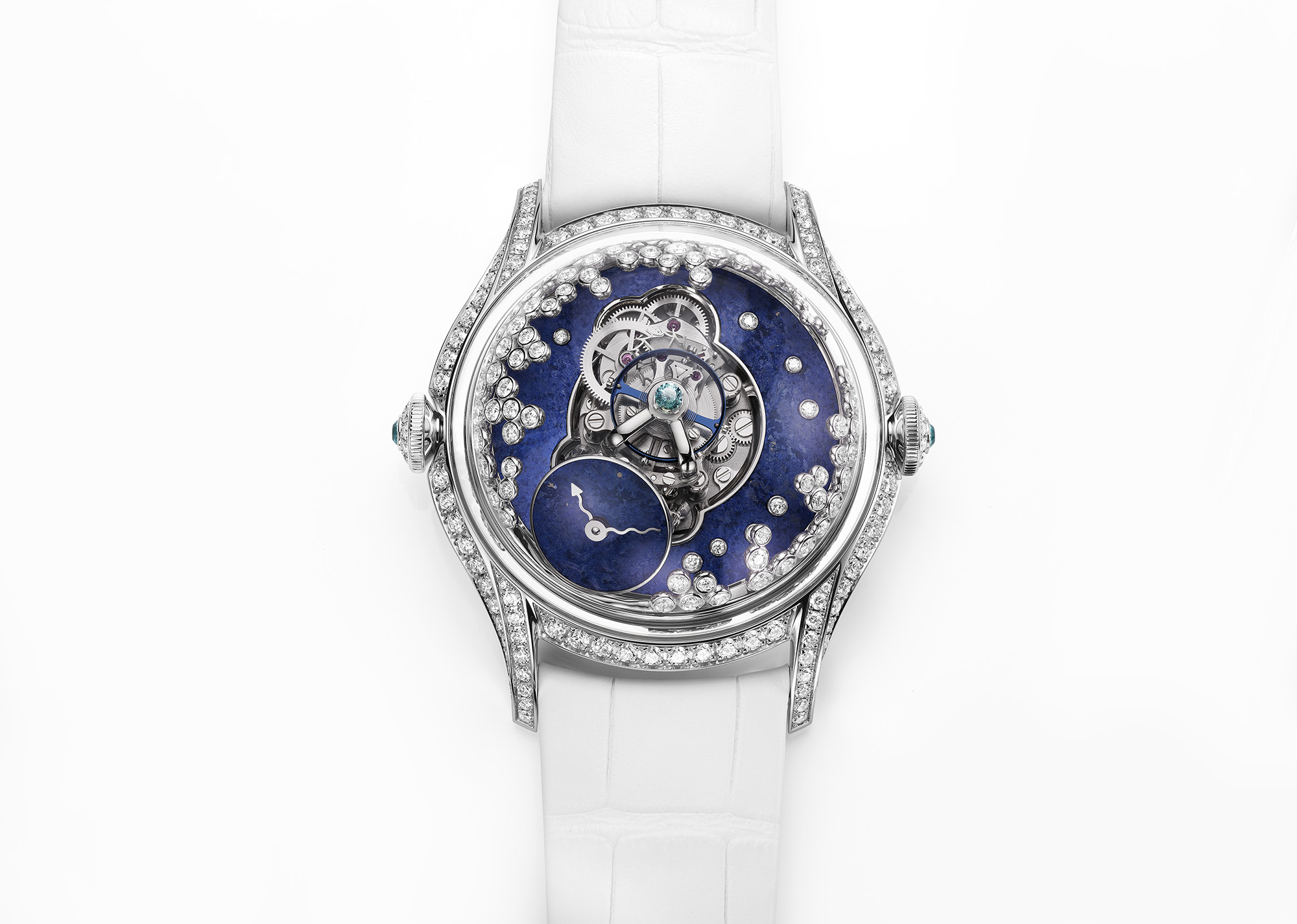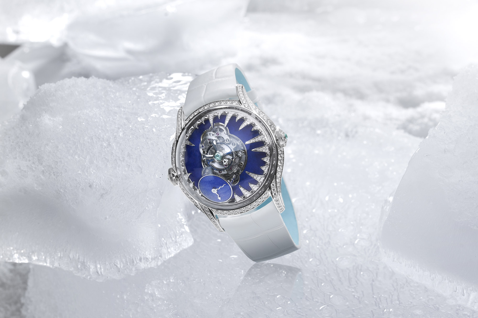 The first model, called Ice, features asymmetrical diamond-set stalagmites that encroach on the sapphire crystal dome and the movement. Each icy stalagmite is different, replicating the randomness of nature. Tarpin took his inspiration from a trip to Lake Baïkal in Southern Siberia, where in winter the lake freezes from the edge inwards until it is totally frozen. The claws of the diamond stalagmites have not quite claimed the movement and the matt lapis lazuli dial, leaving the beauty of the mechanism and the time visible to the eye.