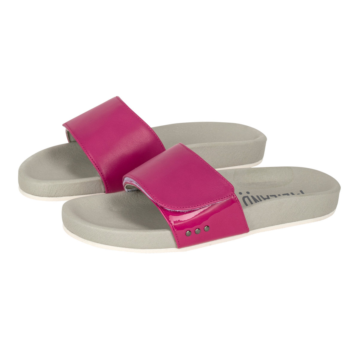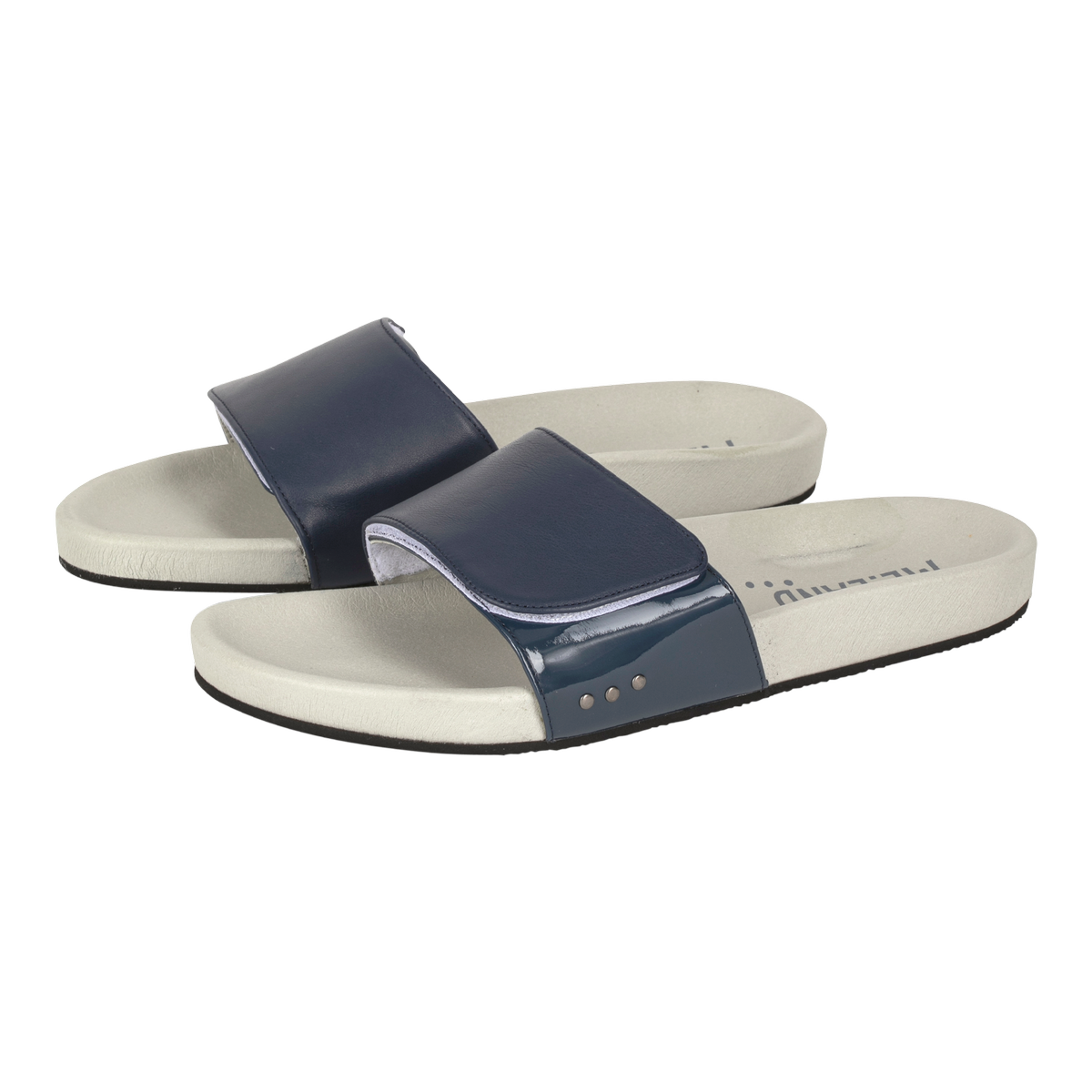 This sandal is made of patent calfskin with an ergonomic sole covered with recycled marine nylon.