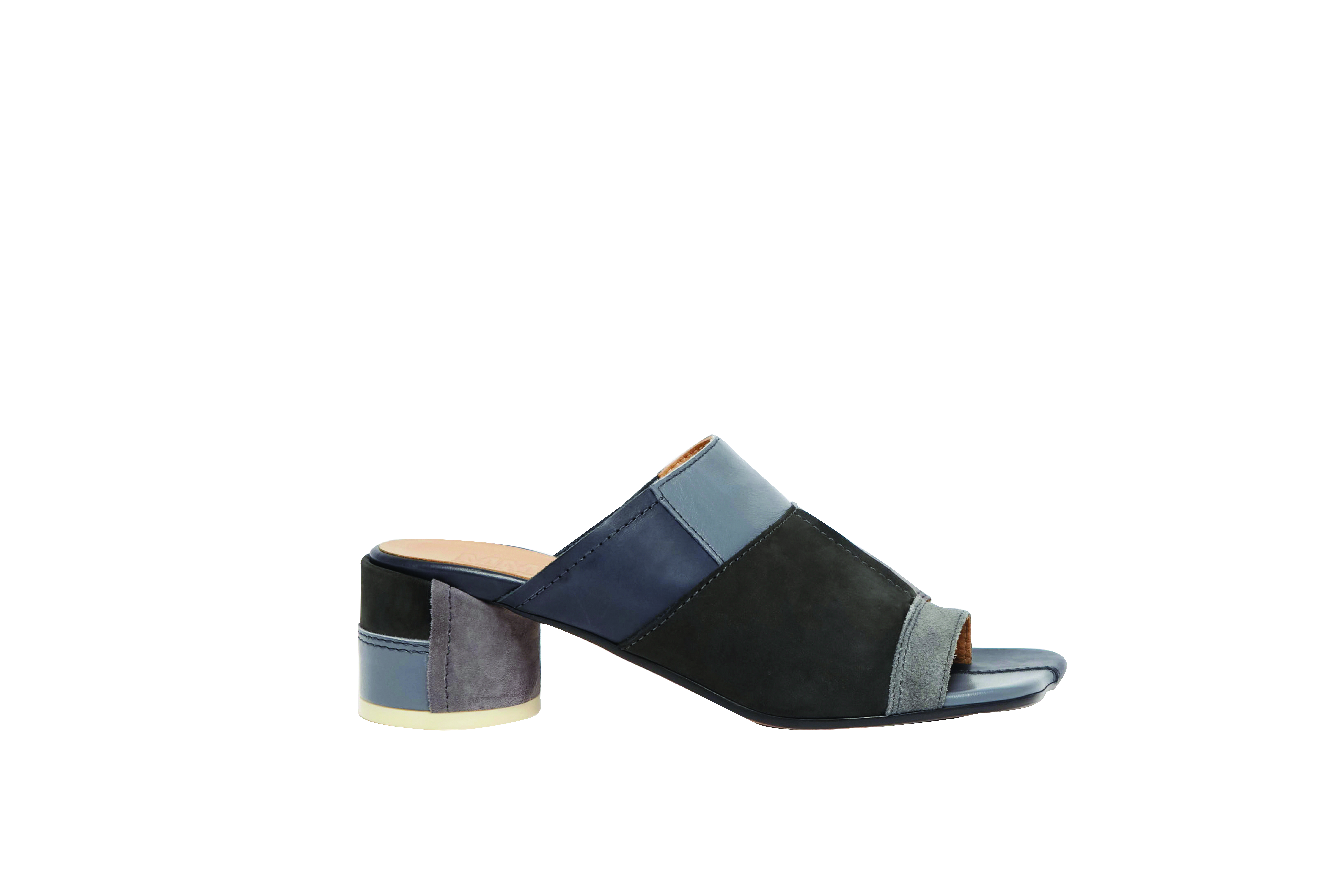 Oblong patches of nubuck, nappa, suede and calf leather in tones spanning alabaster and chestnut brown become an open-toed mule, a flat slider and the previously mentioned 6-heel boot. Each silhouette is also interpreted in stony hues, with a similar fabric composition in graphites, grays and blacks.