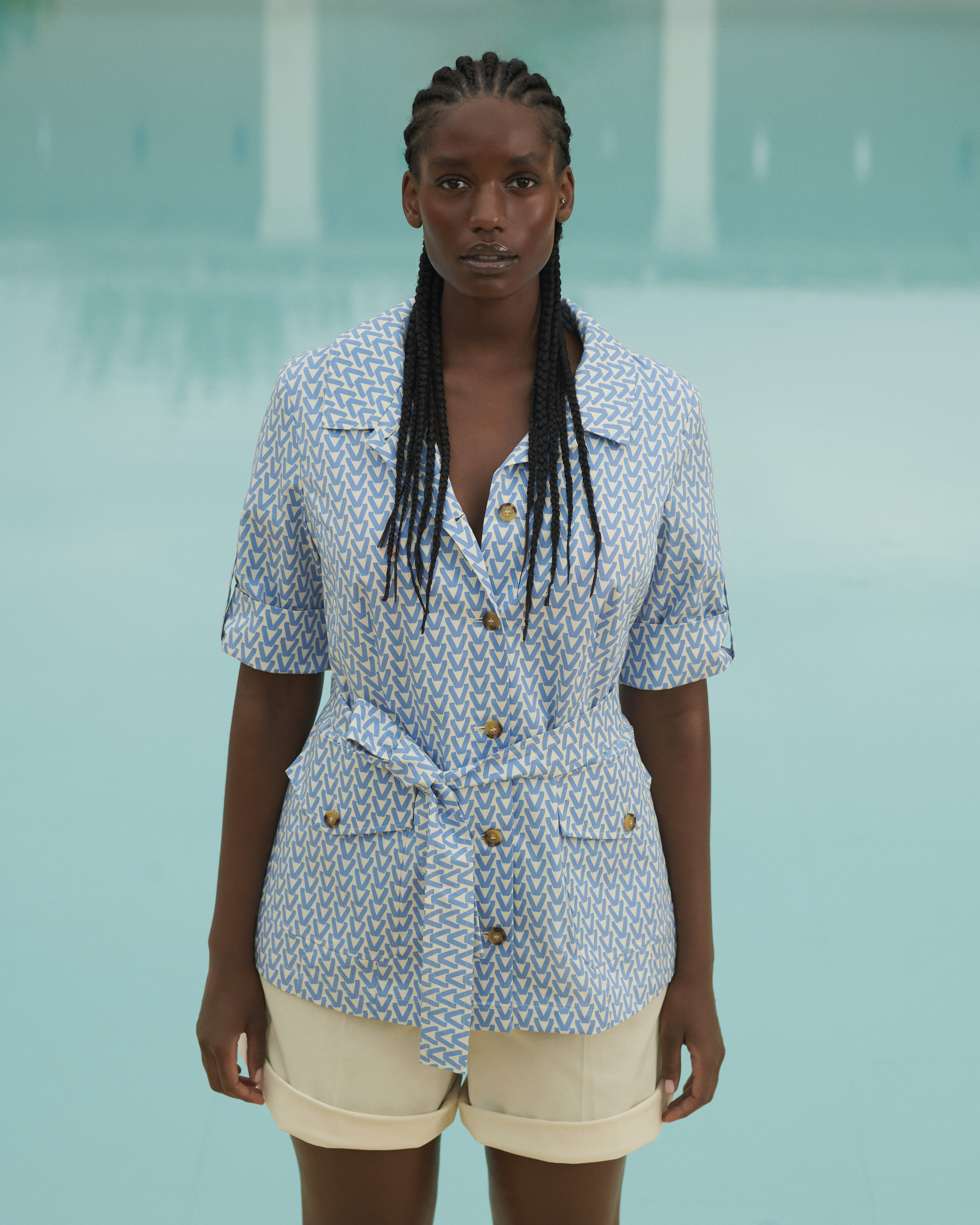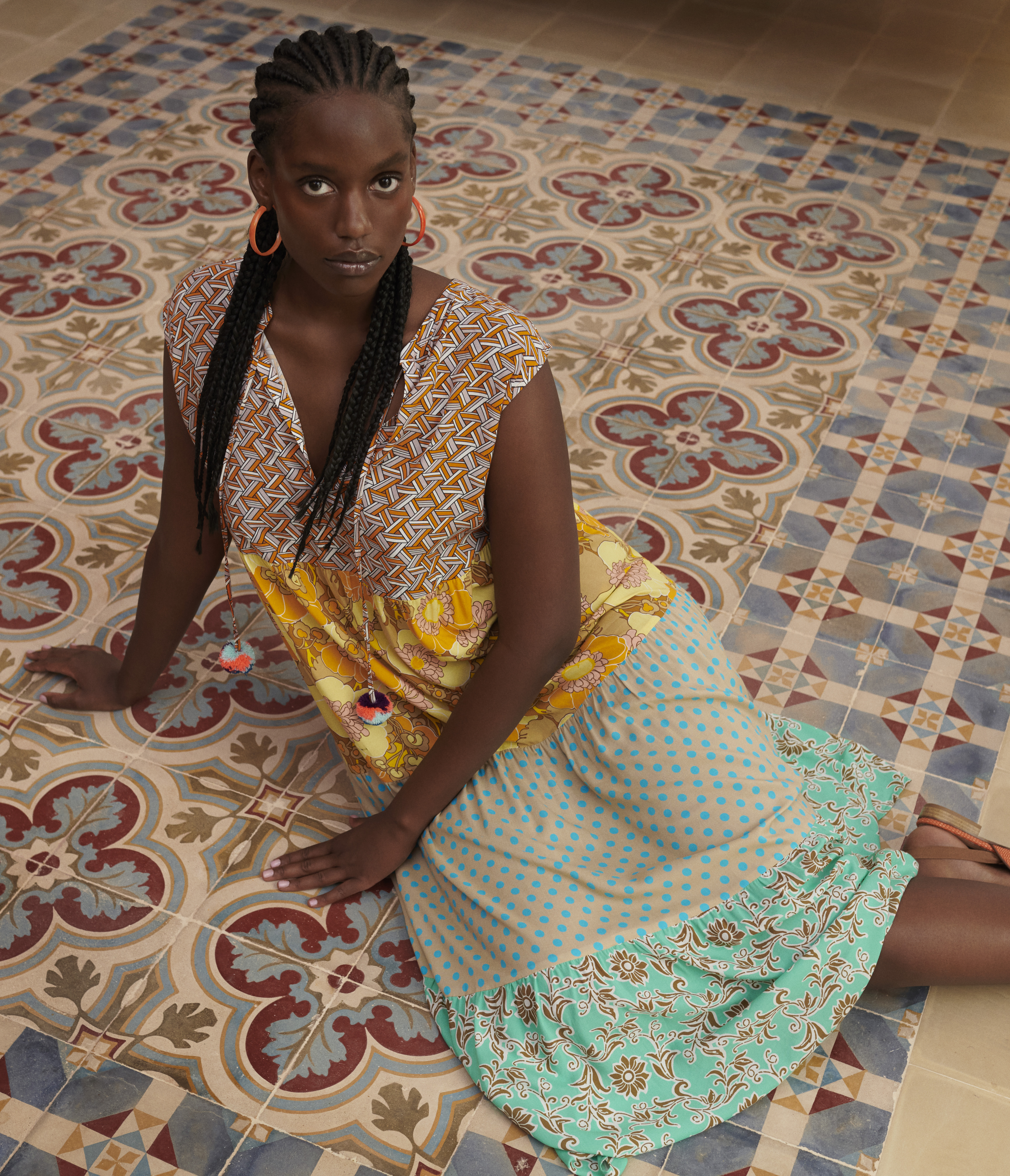 Caftans with long bell sleeves or short sleeves that stop before the elbow bring a sense of total freedom and are embellished with elegant, decorative embroidery. Ankle-length skirts move elegantly thanks to their floaty frills and boast multicoloured striped waistbands. The motifs blend intricate geometric patterns and large floral prints. The surprising mixtures, which combine all-over decorations and solid colours, bring these motifs to life.