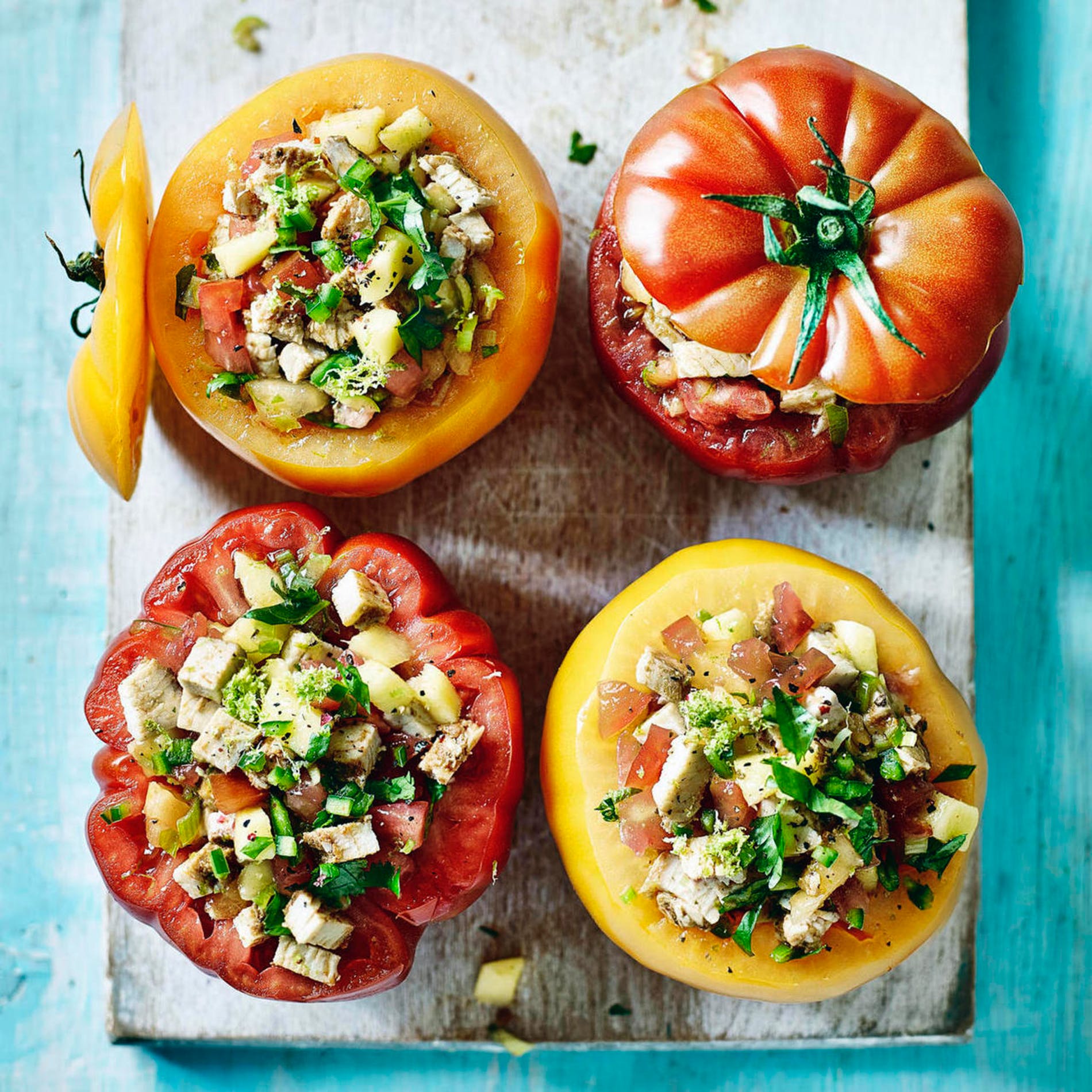 - Divide the mixture among the hollowed-out tomatoes, packing it in, and top with the tomato lids.