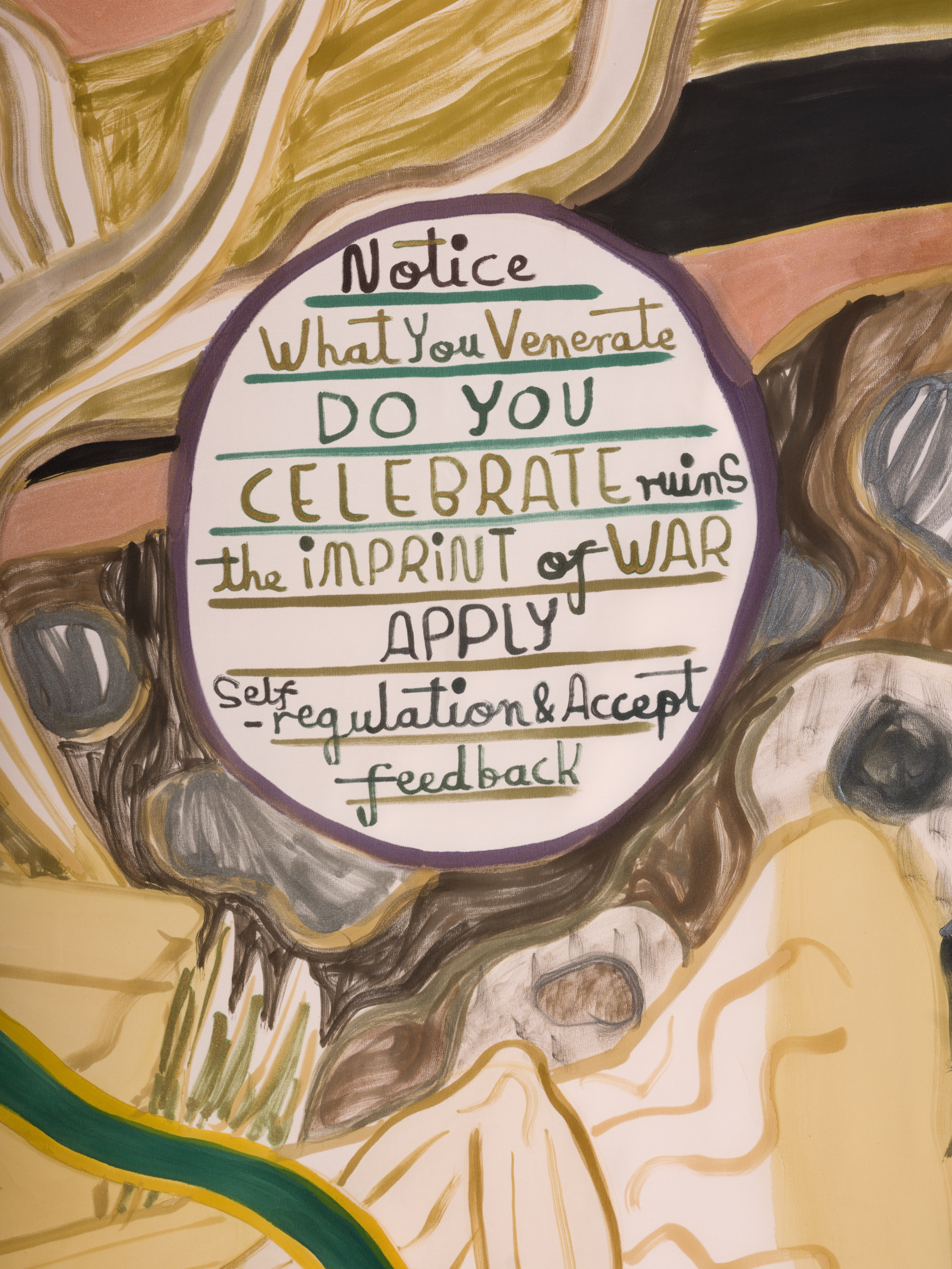 The Age/L’Età also features two large-scale hanging silk works, hand-painted to depict near-future volatile landscapes of ruins and volcanic terrain which the central figure explores and inhabits. As with much of her work, Talbot has inscribed the silk with text addressing the themes of the show and invites viewers to question their own perceptions head-on. The subject matter of the silk works is informed by Talbot’s trips across Sicily, where she explored the volcanic landscape, ancient ruins, and studied the principles of permaculture at the Casa di Paglia Felcerossa. On the occasion of a collateral visit to Como, she learnt about practices of silk recycling with Mantero Seta, the first Italian company to produce 100% recycled silk. Talbot’s incorporation of recycled fabrics and use of sustainable resources within her practice imbues the work with questions about life cycles, renewal and agelessness.