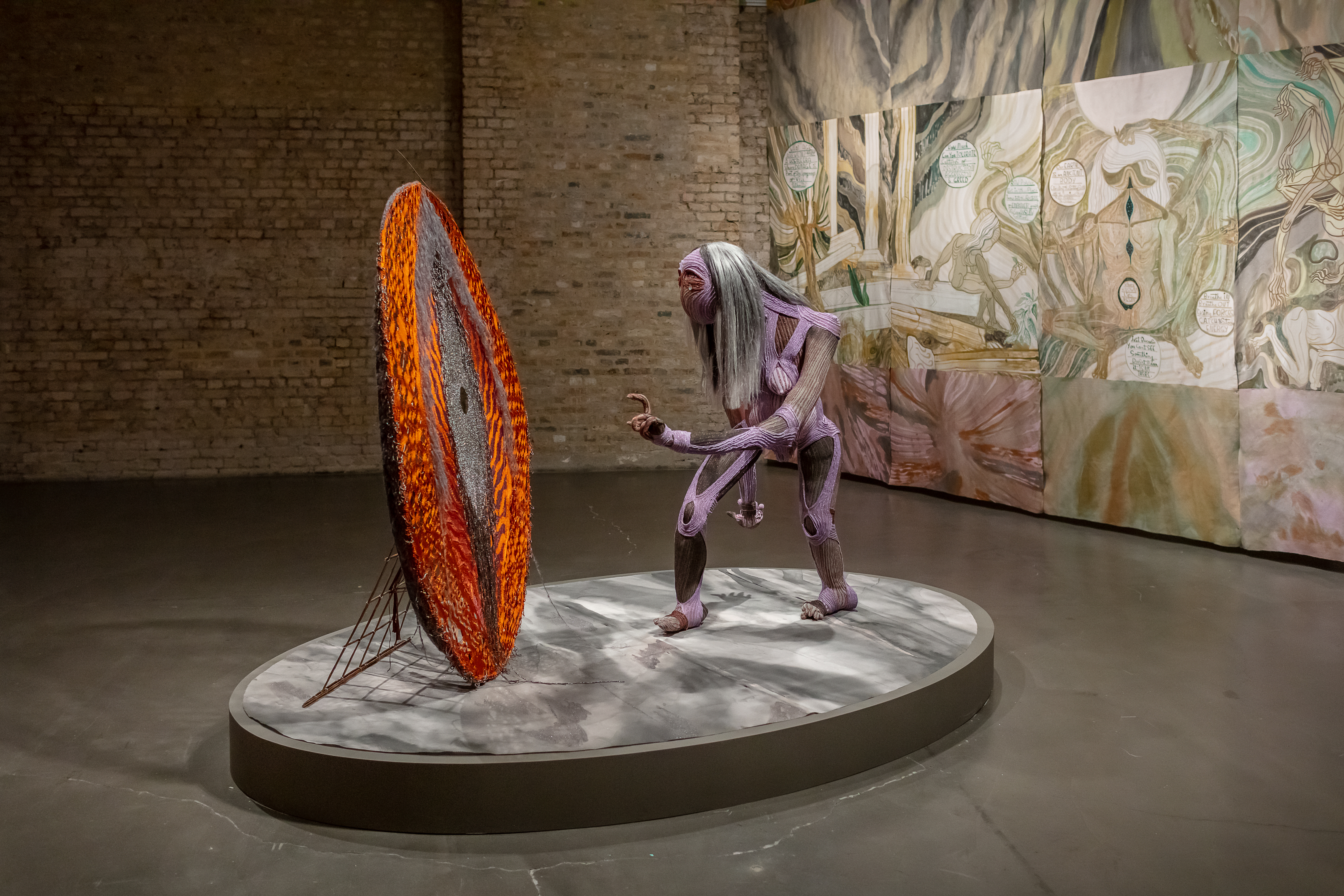 The final element of The Age/L’Età is a physical manifestation of the central elderly figure, in the form of a life-size sculpture made from stuffed soft fabrics. Materials designed by the artist in collaboration with IMAX Max Mara’s knitwear division were used to create the figure’s thick elderly outer skin, which resembles wrinkles and armour. Inspired by depictions of Hercules and scenes found on ancient Etruscan pottery, Talbot’s figure reaches towards the centre of a portal or net, produced by the artist in collaboration with Modateca Deanna, one of the most important Italian knitwear archives, through which she appears to approach a new world, alternative energies and a new way of being.