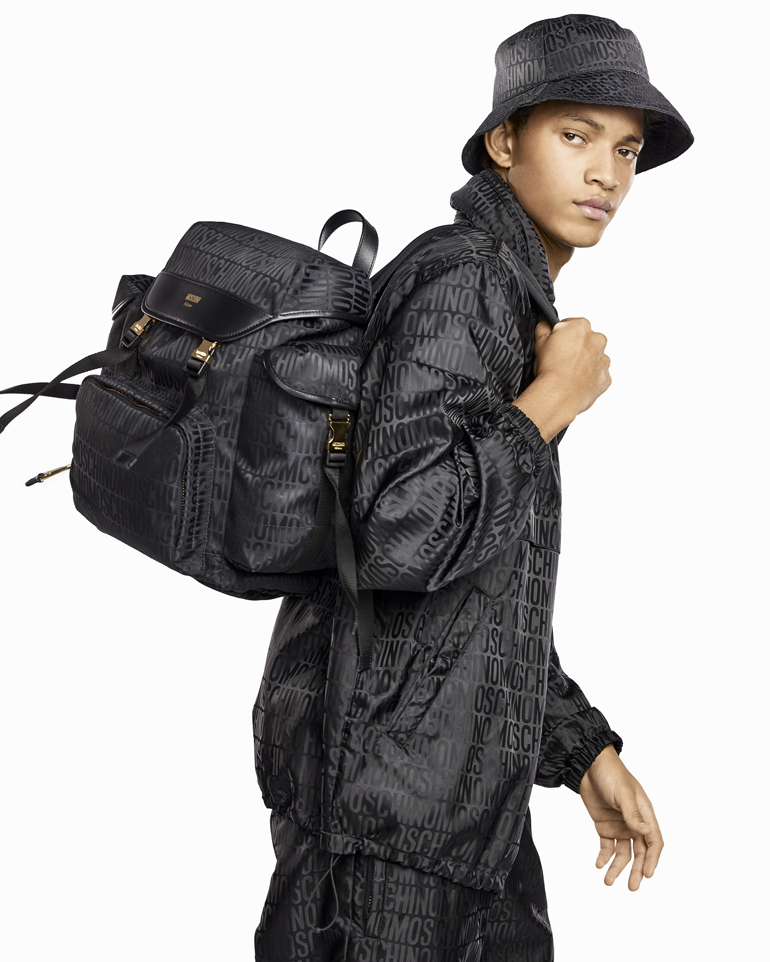 The collection features a range of items in both womenswear and menswear categories: from puffer jackets to satin loungewear, matching tracksuits, button down and knit sets, a range of luxury travel accessories; laptop cases, backpacks, luggage to small denim, nylon and leather goods and jacquard “MOSCHINO” lettering.