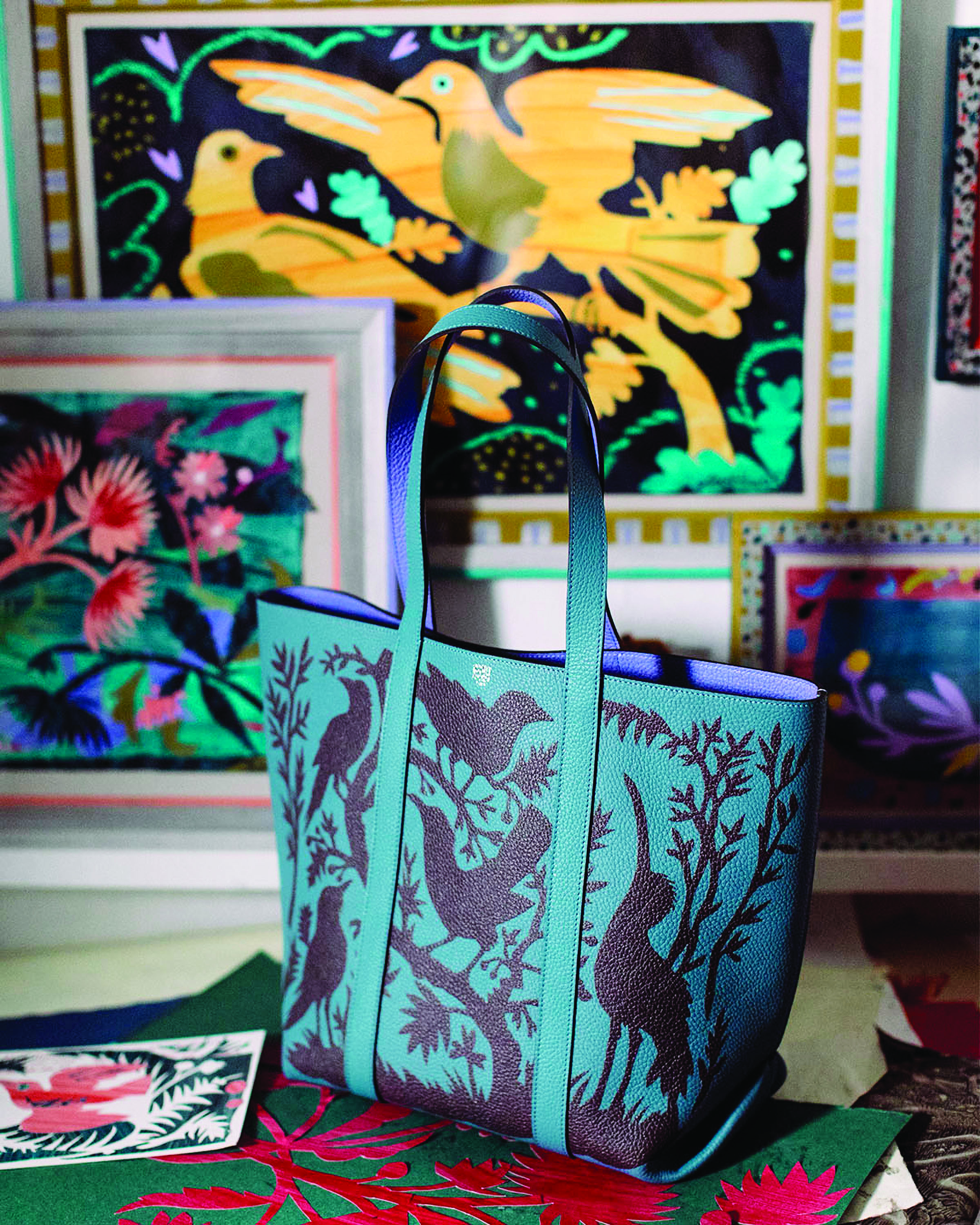 Mark is a prolific Artist designer from York who creates wildly imaginative and riotous works inspired by the flora and fauna of the British countryside. A maverick unbounded by his medium, he works across collage, painting and printmaking as well as ceramics, wallpaper and textile design. In this special collaboration, Mark’s paper-cut designs are enlivened in exquisite leathers using Maison Moynat’s leather marquetry technique. For both crafts, a single cut to the material reveals a profusion of creative possibilities. Seemingly spontaneous shapes connect to form enchanting artworks. Nature becomes the muse and inspires a collection of limited-edition bags and small leather goods, where birds soar through boundless skies, perch serenely on branches and dance jubilantly amongst the trees. They dream of distant horizons and faraway lands, with silhouettes as elusive as the canopies they command.