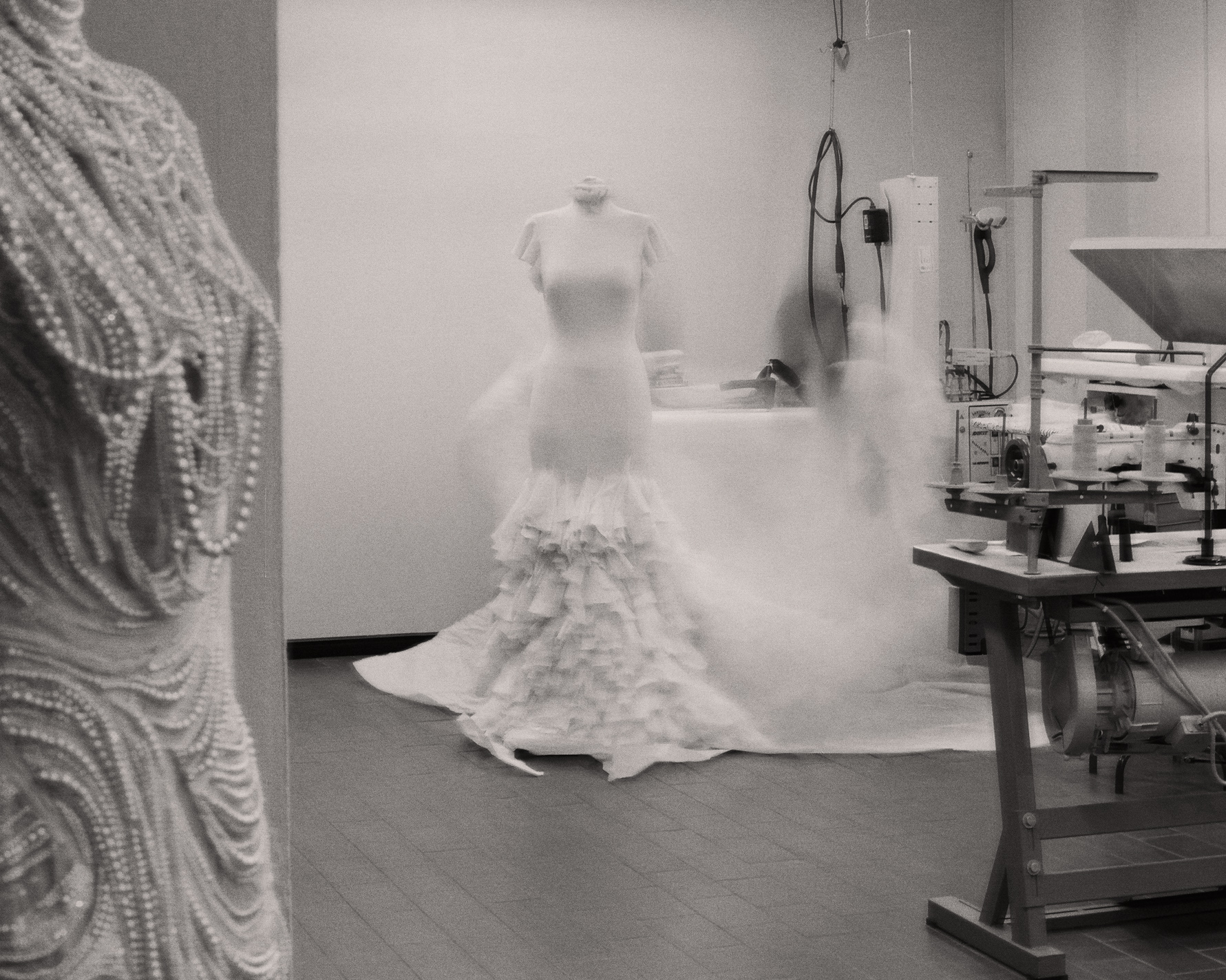 · Dress 2: The chandelier pearl gown is adorned with thousands of cascading strings of pearls. 30 artisans worked across 700 hours to hand embroider the gown with micro-pleats of silk tulle, tiny pearl embellishments, and Swarovski crystal.