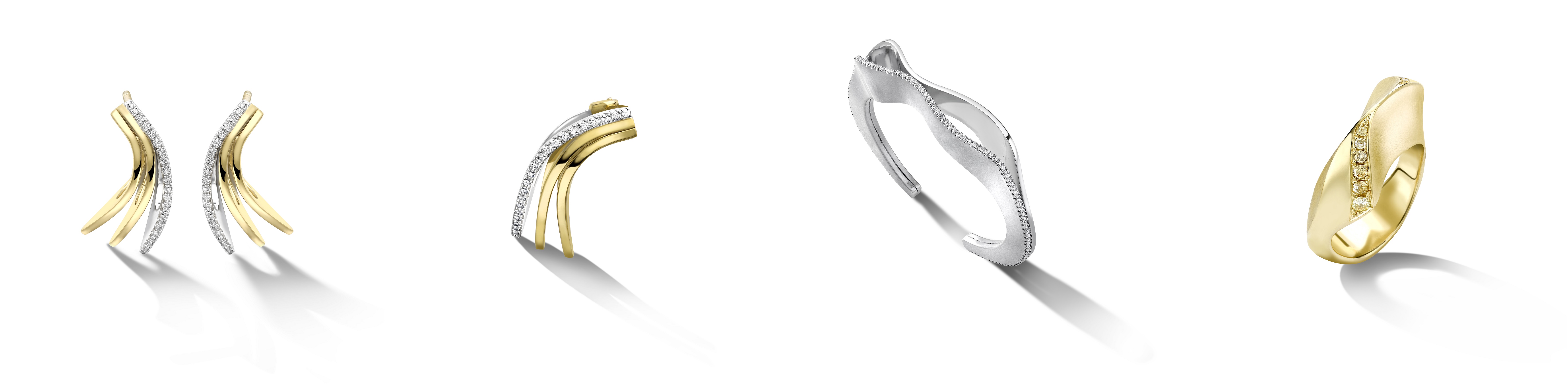 ‘In this series of Editions, I explore working the gold to give it the flow and lightness of fabric curving around the body. Textures of the brightest diamonds and satin hand textured gold add light and shade and bring a changing plain to the eyes.’