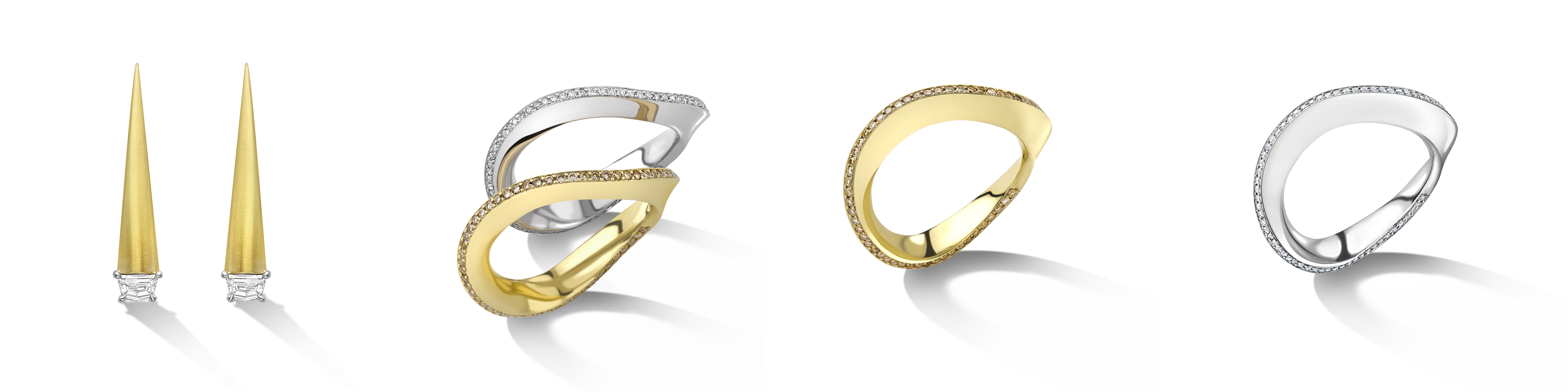 Dramatic when layered or worn alone, these rings curl around the finger, rising from a satintextured gold to a crest of handset diamonds - with a choice of cognac and champagne diamonds on the yellow gold ring and bright white diamonds on the white gold ring.