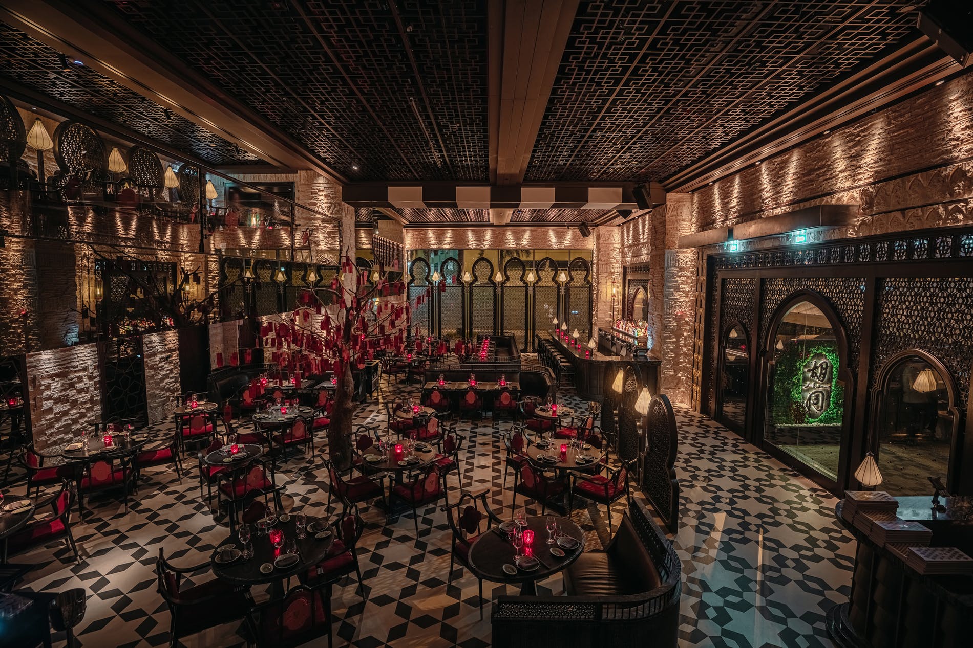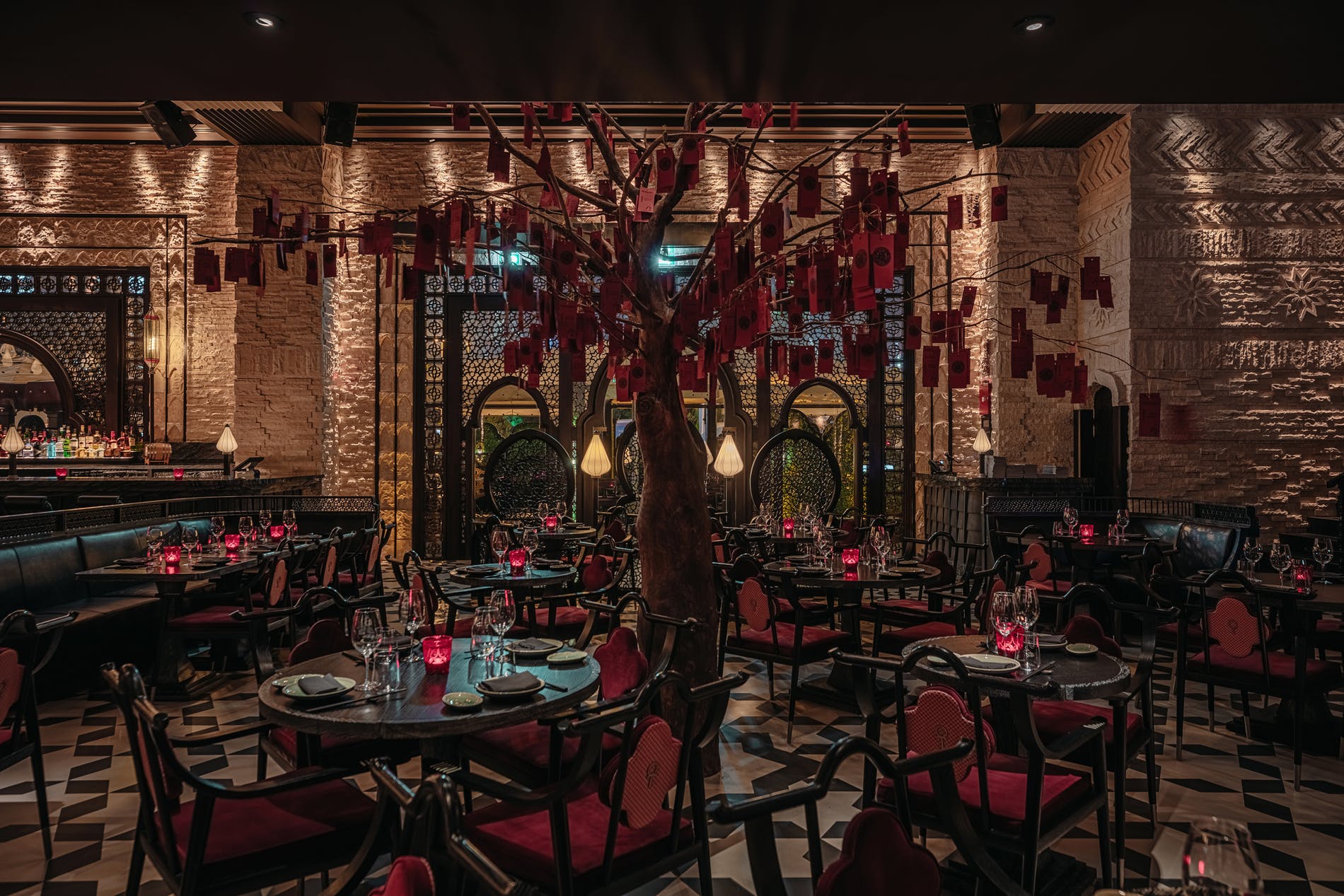 A distinctive component of the design is the handcrafted sandstone wall, inspired by the towering Emin Minaret from Urumqi in Xinjiang. Beautiful geometric patterns carved into the warm sandstone are dramatically highlighted with shafts of lights thrown across the surface. Upon arrival, guests also remark the intricate design of the towering 30-foot-high wooden screens surrounding the dining area, which have been hand carved in China and shaped in Arabic design, with delicate Chinese carvings on the interior representing clouds. Another unique element and focal point are the iconic and traditional Wishing Tree positioned in the centre of the restaurant, a striking element that is featured in both Hutong restaurants in London and Hong Kong. Guests are invited to make a wish on a red Lai See card and place it on the tree, with tradition suggesting the higher the wish is placed on the tree, the more likely it is to come true. With each layer of the space, a story unfolds; from the deep burgundy red representing luck and dashes of jade in the private dining rooms representing harmony to the Lotus bulb-shaped lamps, Hutong creates a seamless design in a dramatic yet inviting setting.