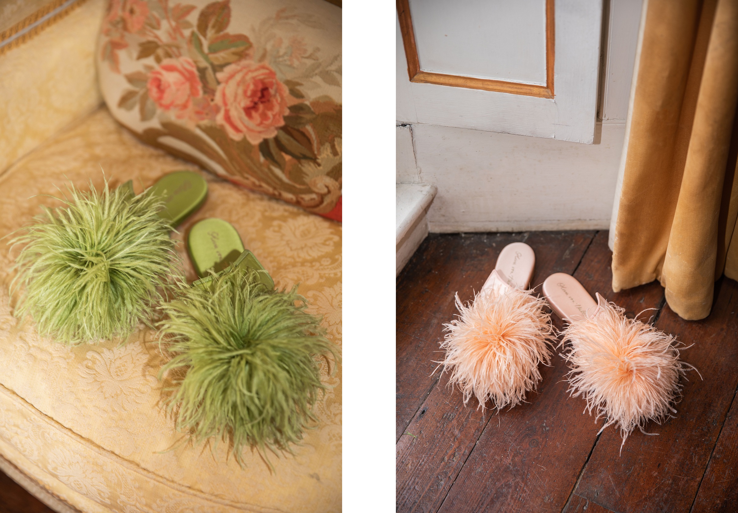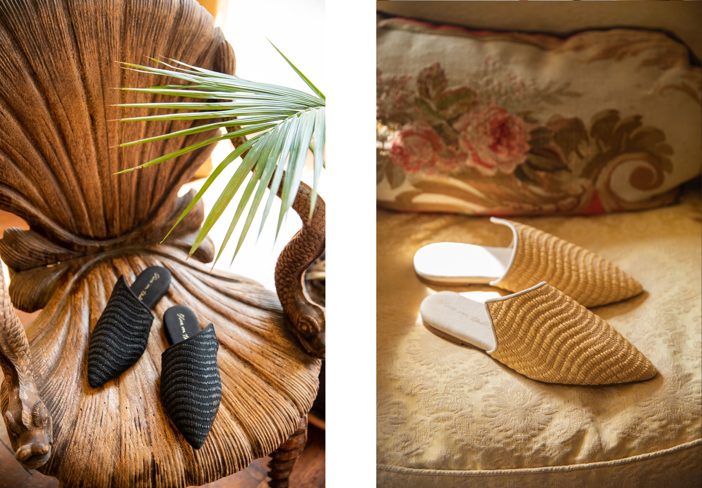 To recreate the Contessa slipper for Autumn / Winter 2022, Olivia von Halle sets the scene amid the bygone glamour of the 1960s jet set society of the Italian Riviera. Crafted from the finest natural materials, this season’s slippers see OvH’s signature silk pop in summer brights alongside playful ostrich feather pom-poms whilst artfully crafted natural palmyra palm raffia delivers a slipper that is perfect for high summer.