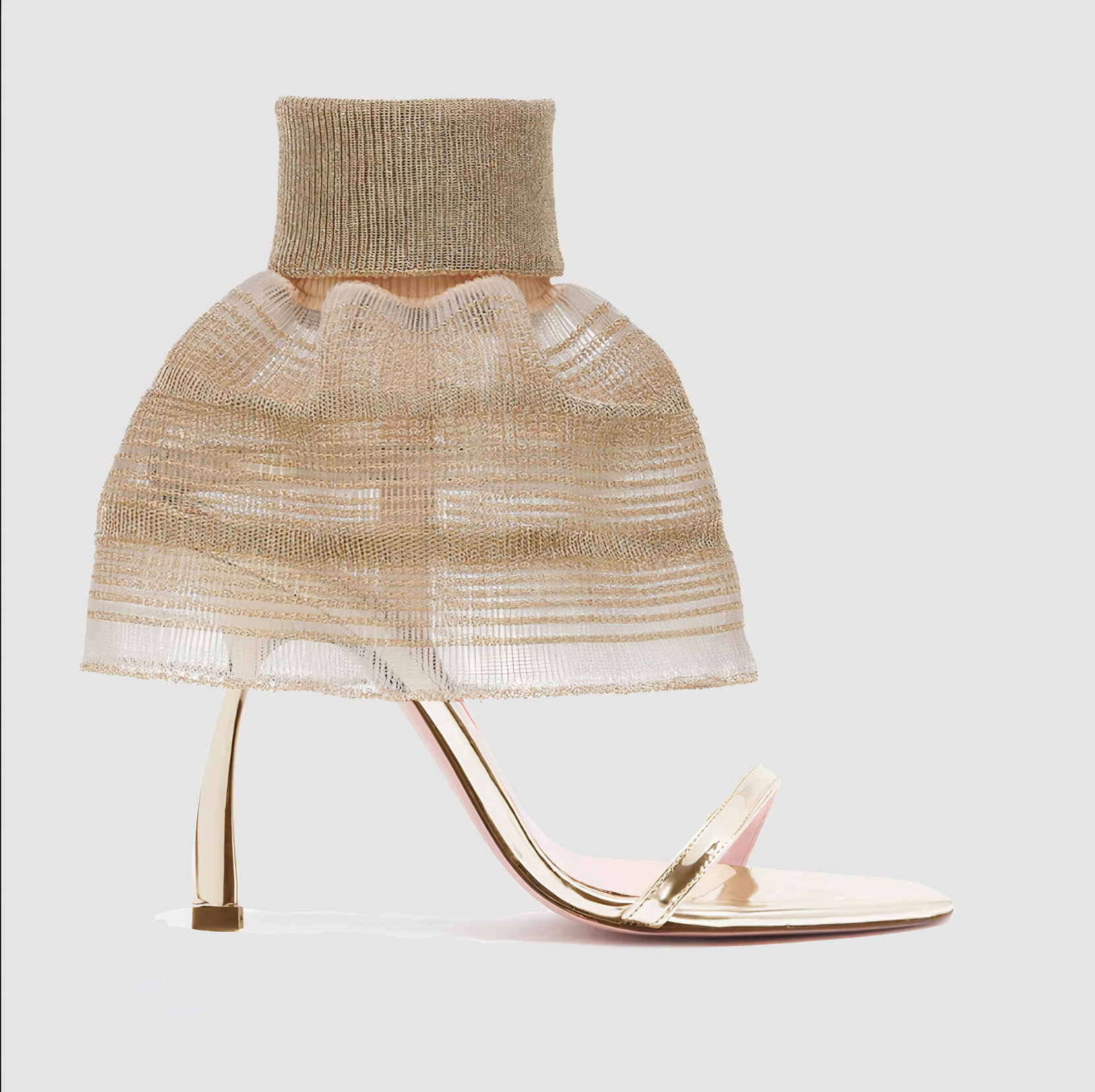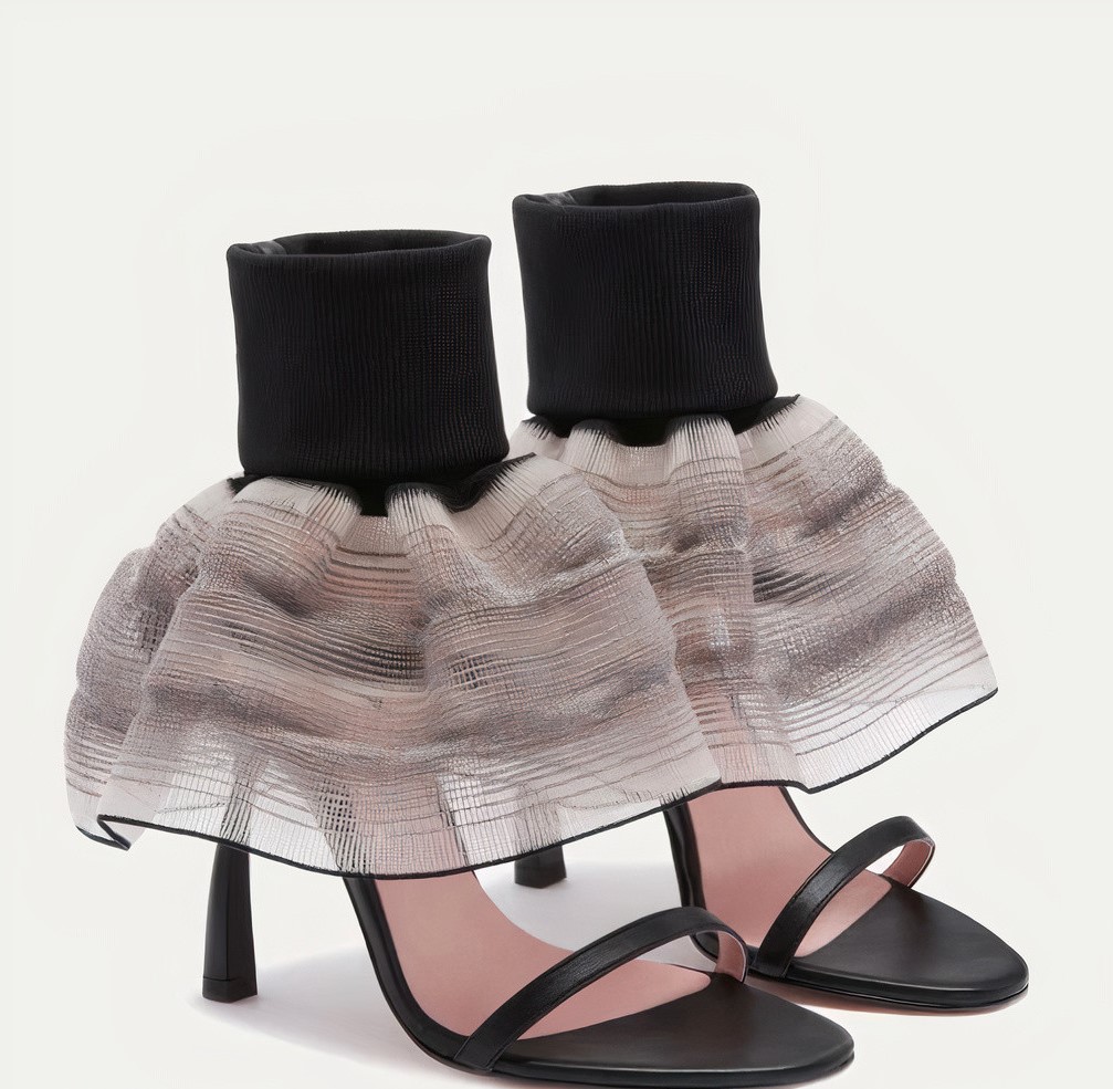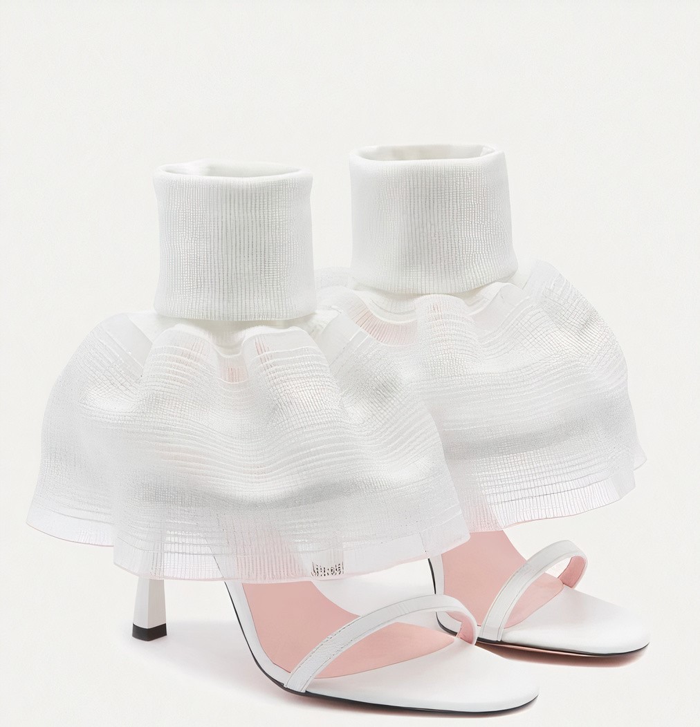 The soquette has been reimagined for 2022 with new lightness and sensuality. ‘Ginevra’ comes with a satin anklet, hand-knitted raffia frill, and a corset lace-up décolleté, which frame the ankles while enhancing the leg line.