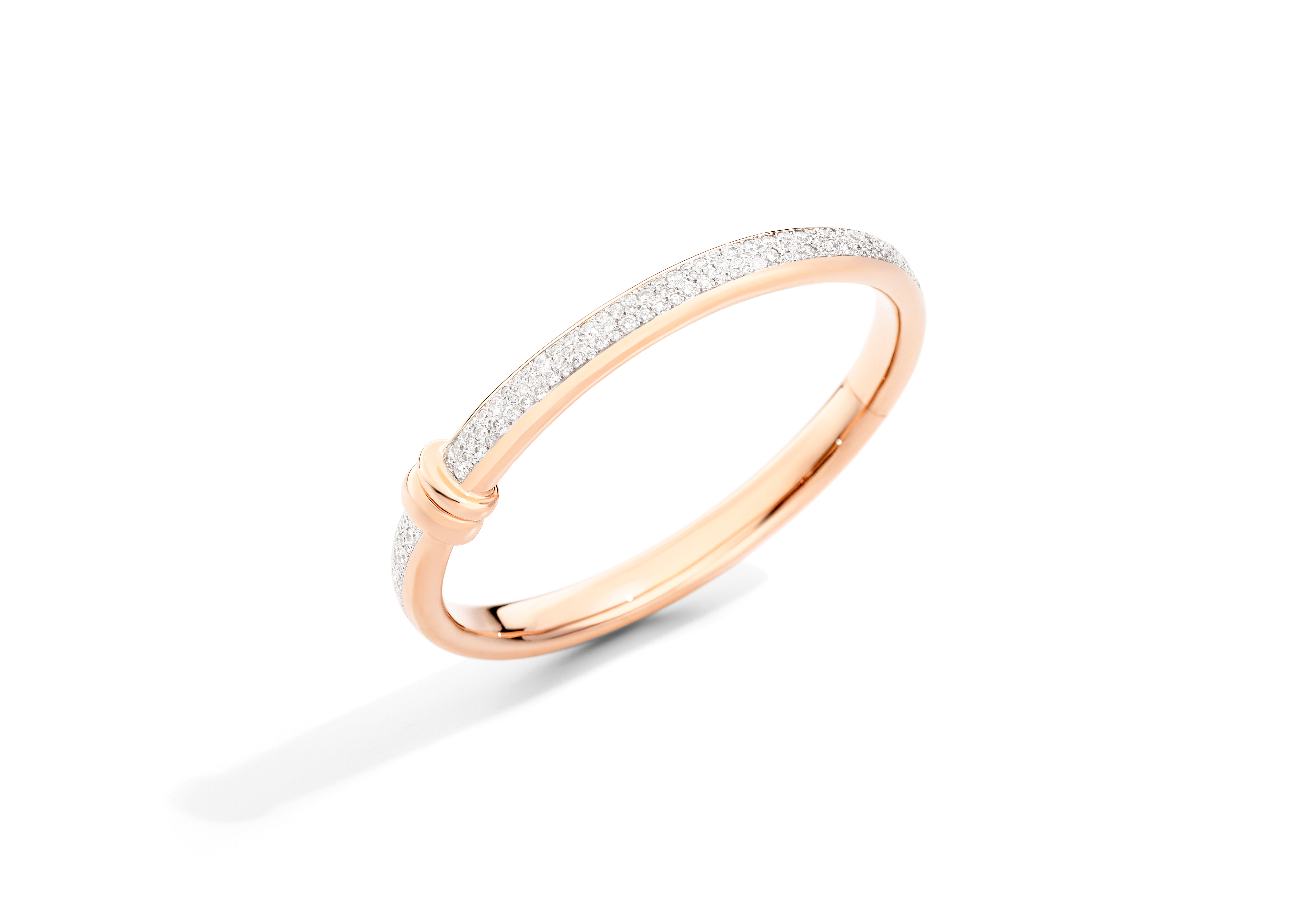 The chain reaction begins with rings comprised of two coils of rose or white gold, united by a transversal link based on the traditional ‘Schiava’ bangle. Echoing the design are four bangles that sparkle with different degrees of diamond pavé as well as a pair of lobe-hugging earrings. All but one of the new Iconica jewels are enhanced by a white or brown diamond pavé, painstakingly set by hand using Pomellato’s time-honoured artisanal methods.