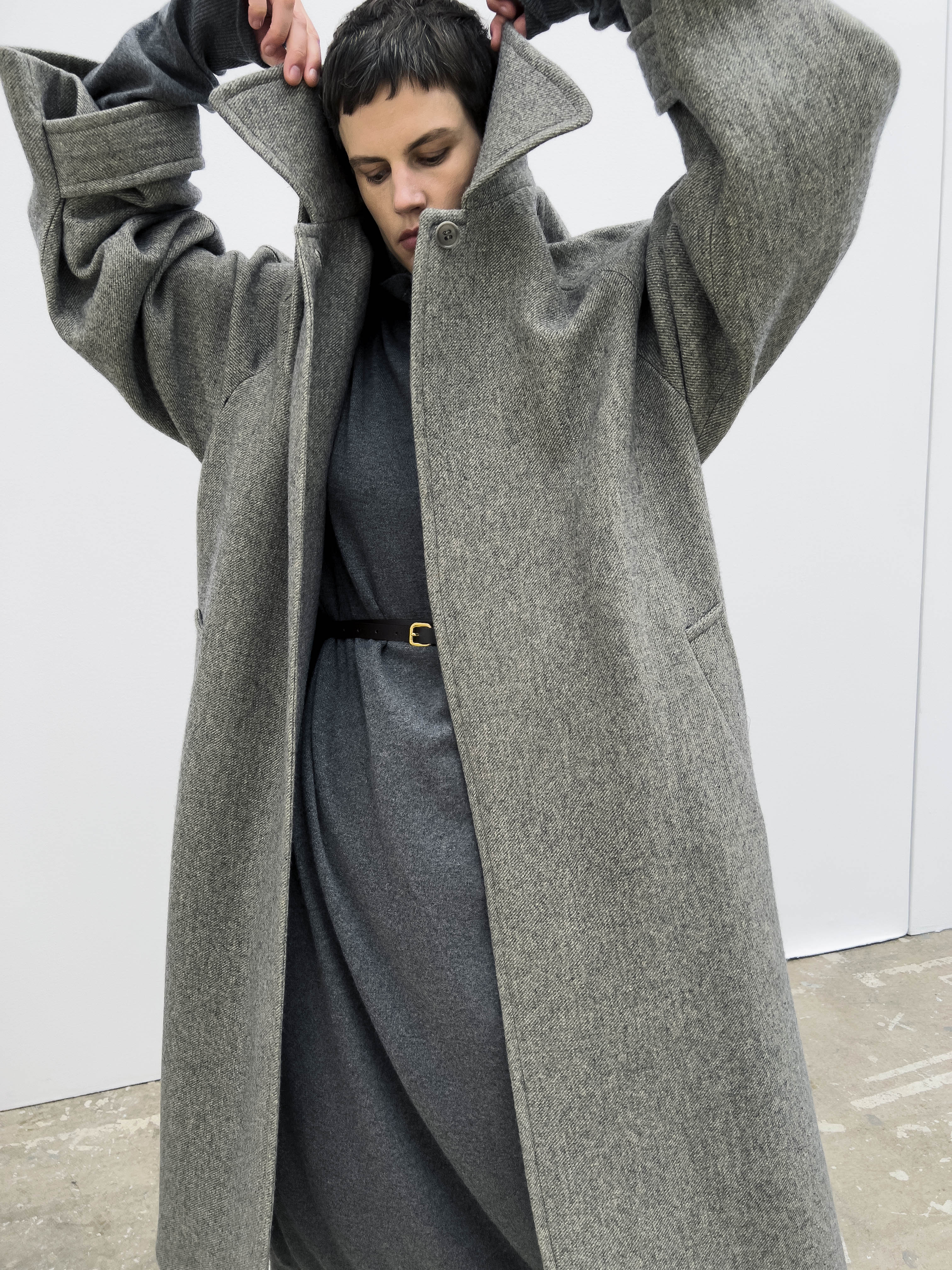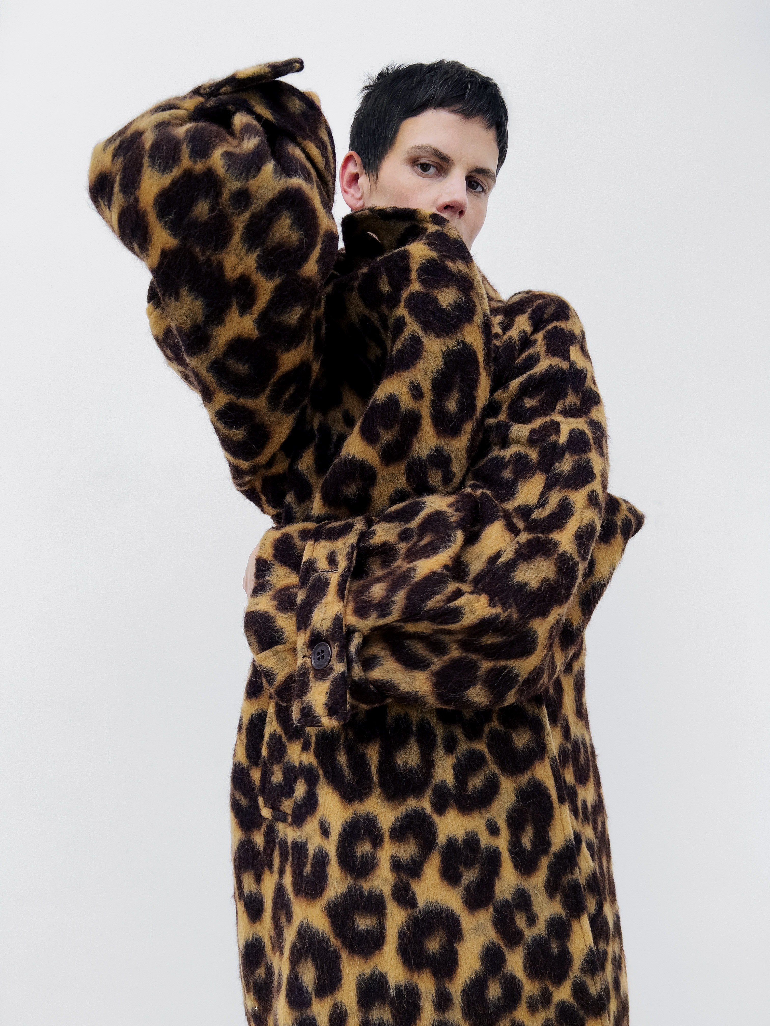 Raey’s staple leopard-print returns on a larger scale on wide-sleeve raglan coats and in a jacquard mini version featured on trench coats and an alpaca oversized raglan knit. Dresses come in new, bold shapes in mid-calf and maxi lengths styled with washed leather biker jackets and recycled cashmere jumpers around the waist.