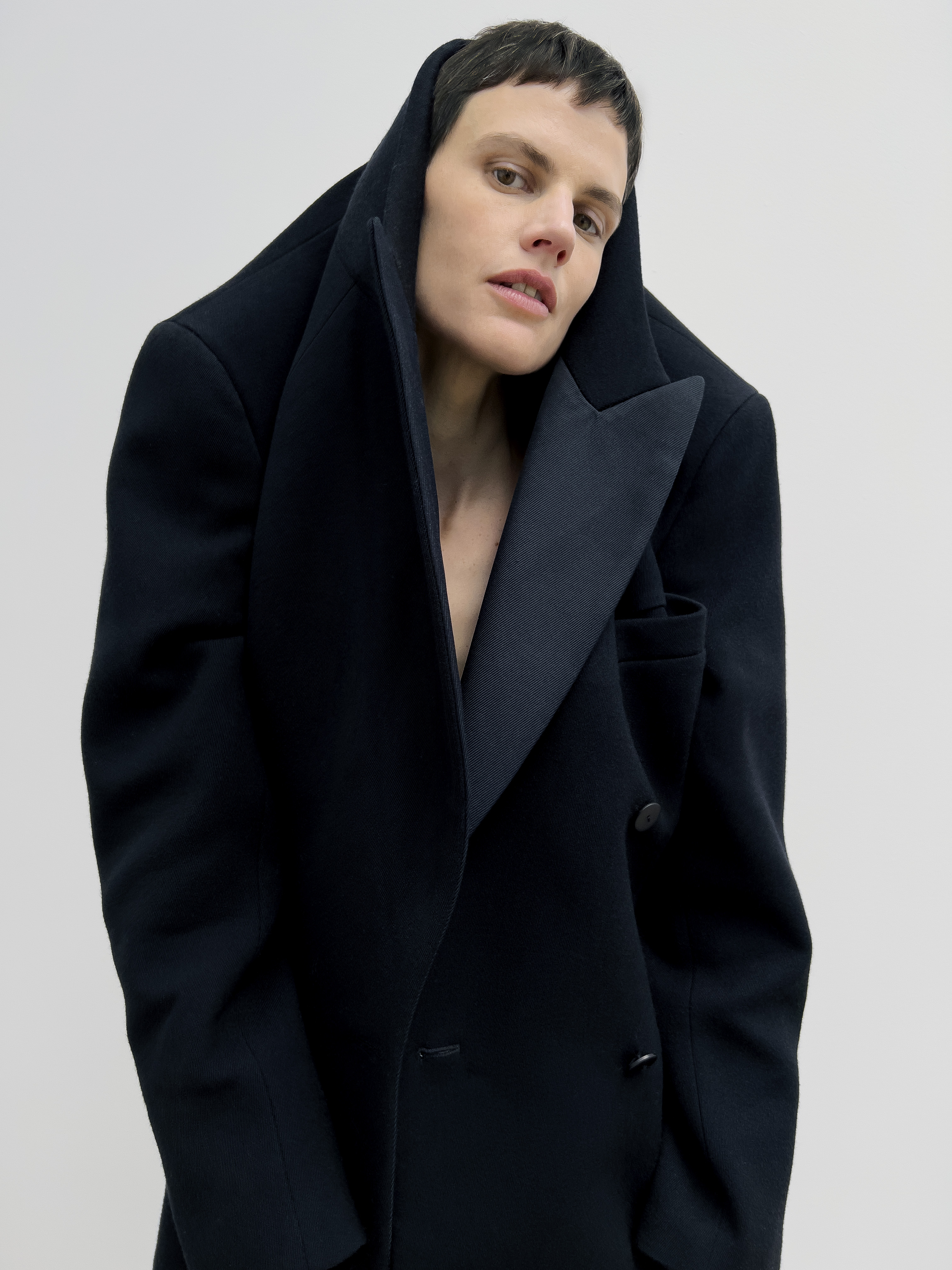 The AW22 drop consists of the signature exaggerated-shoulder tux in ‘Raey navy’, dogtooth and tweed suiting, all with trouser or skirt options, organic cashmere corduroy co-ords and strong outerwear in bold colourways and batwing shearling aviator jackets.