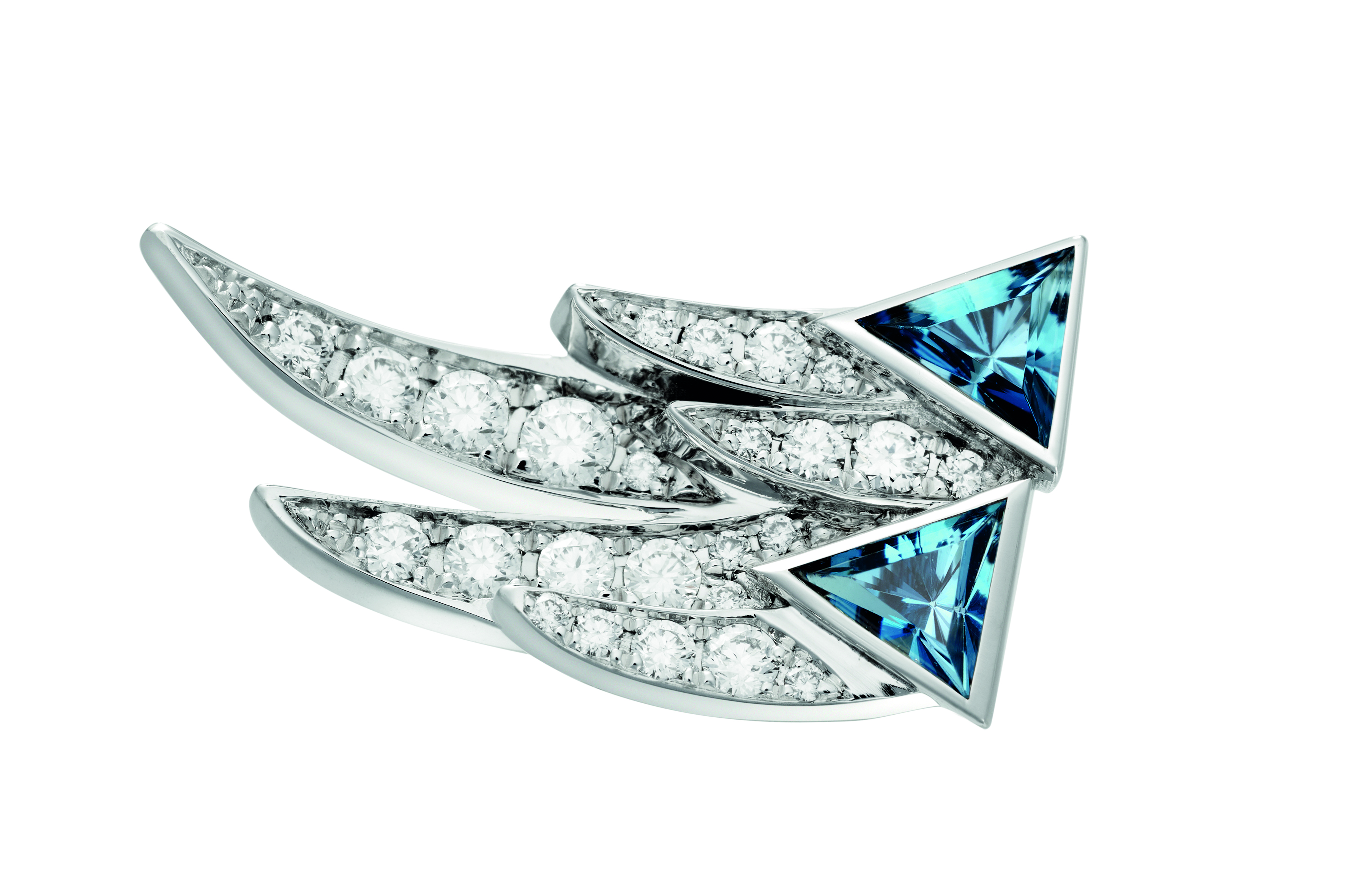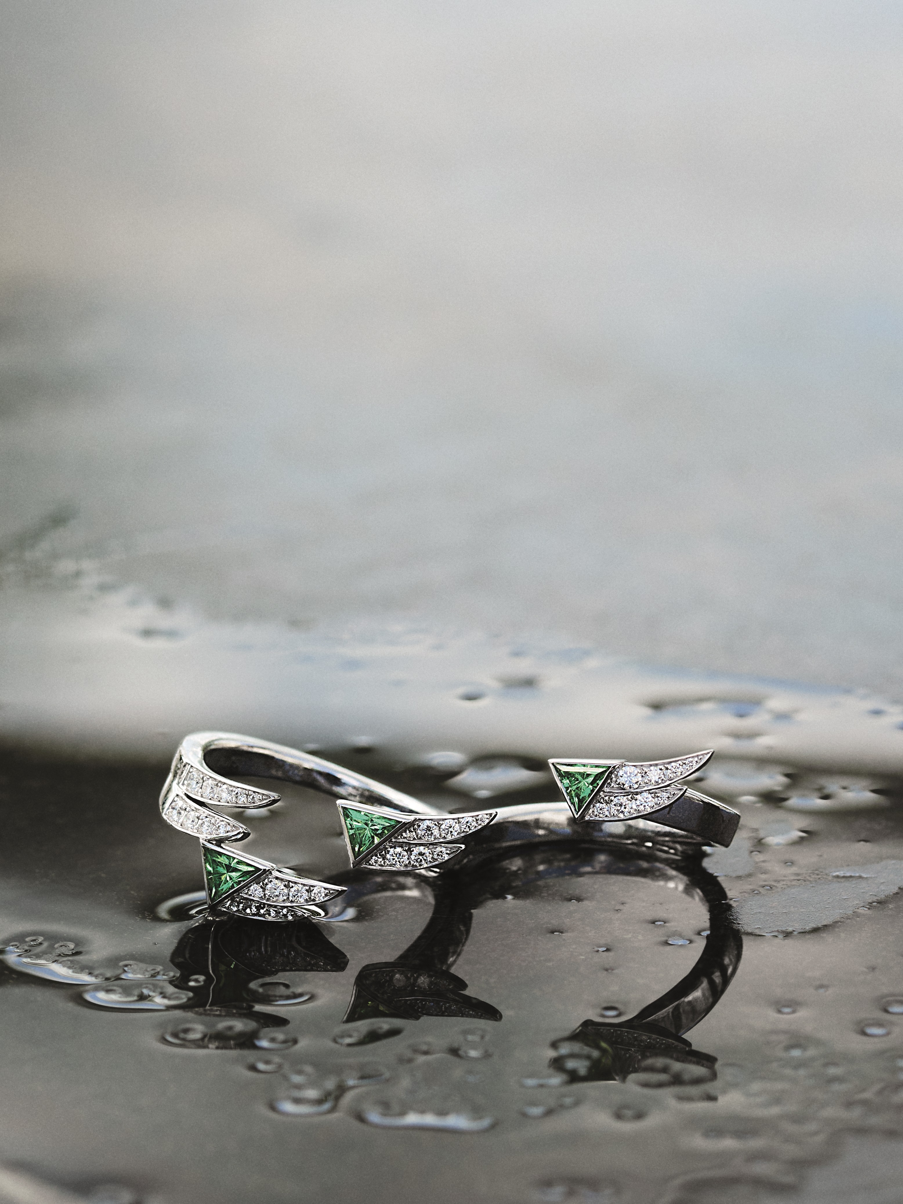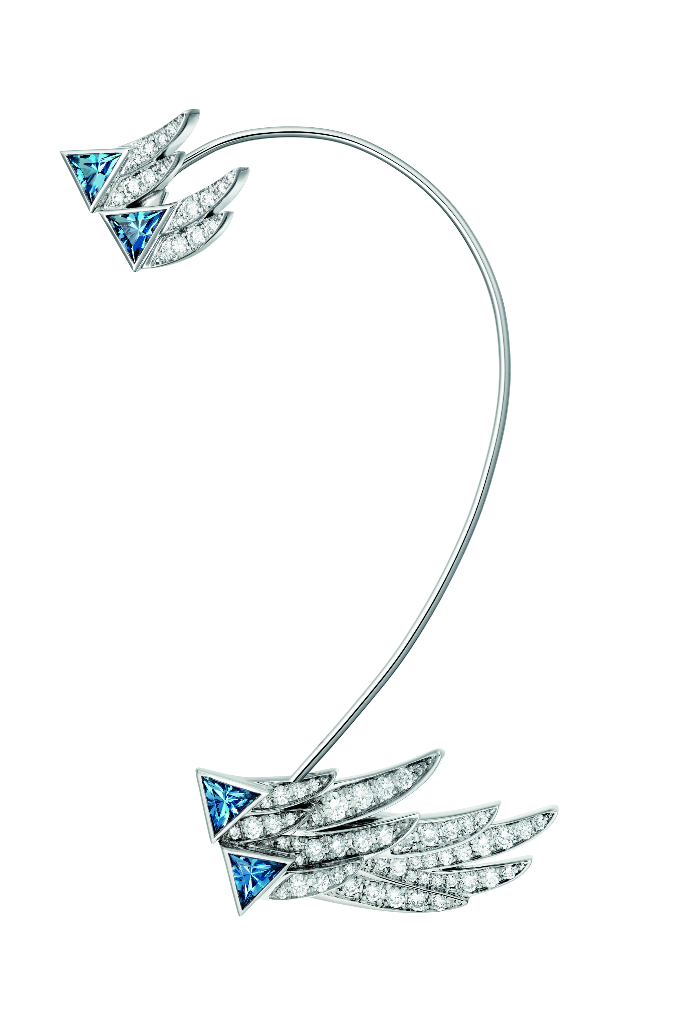The double rings can be worn alone or together with a single ring model. They delicately adorn the hand, giving the fingers an air of elongated grace, and seem to be about to fly away. The various designs in triangular fine stones, reminiscent of as many species of birds, exalt these wings, set throughout with white diamonds. The earcuff model, sold as a single piece, perfectly envelops the auricle. It is mounted on a flexible white gold stem from which sprout sleek wings, while plumage on the back of the lobe further intensifies their mysterious presence.
