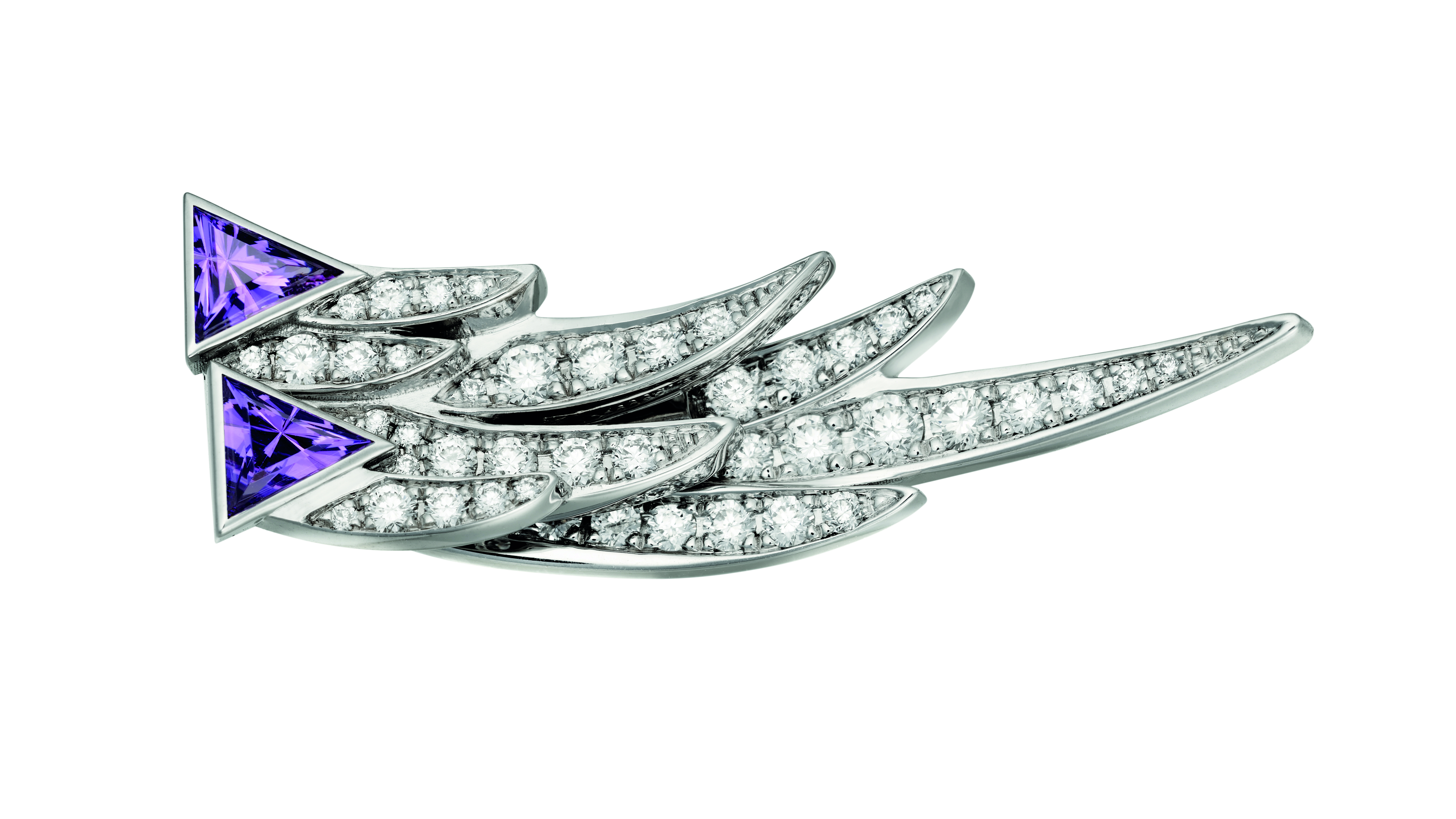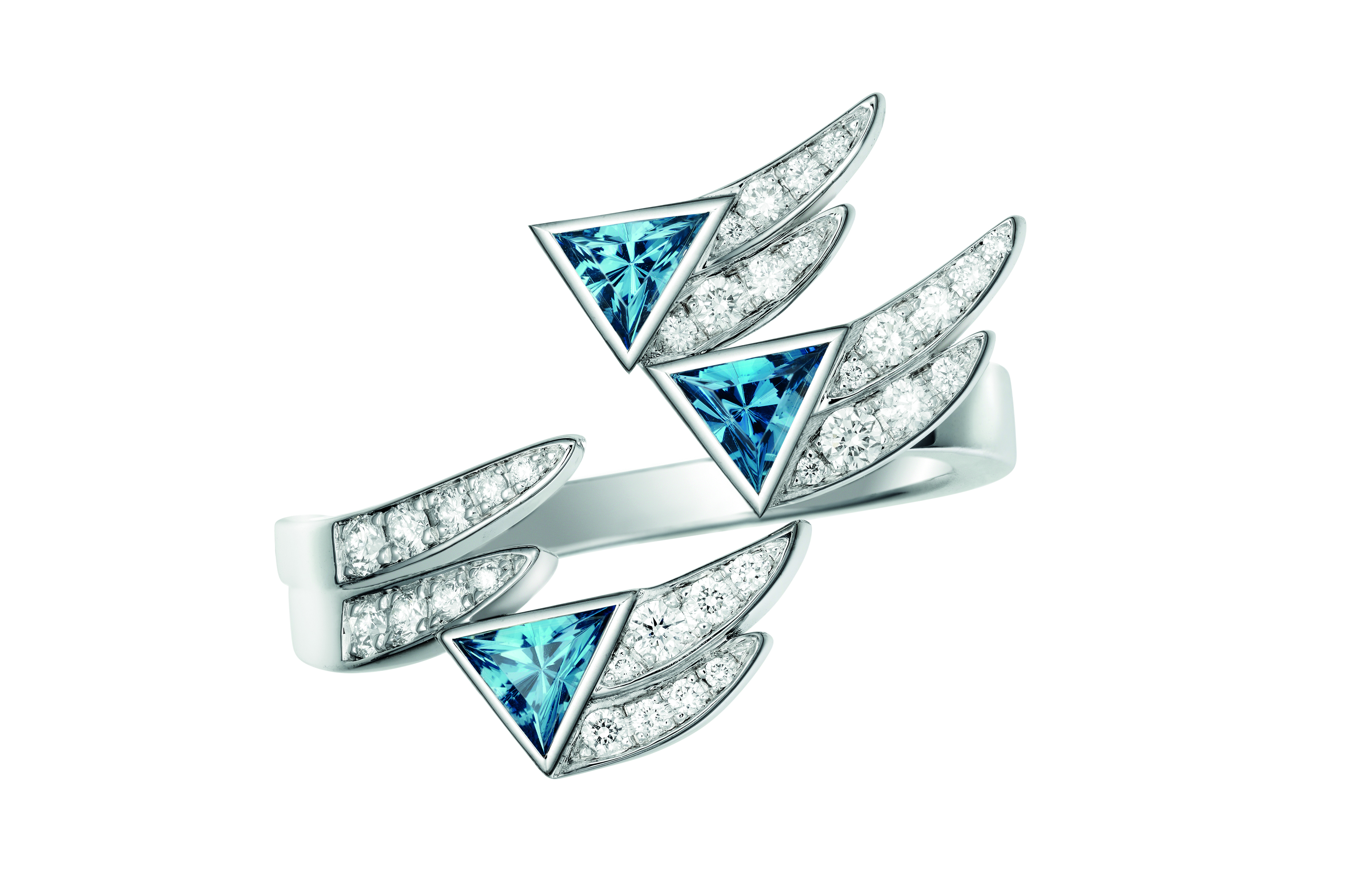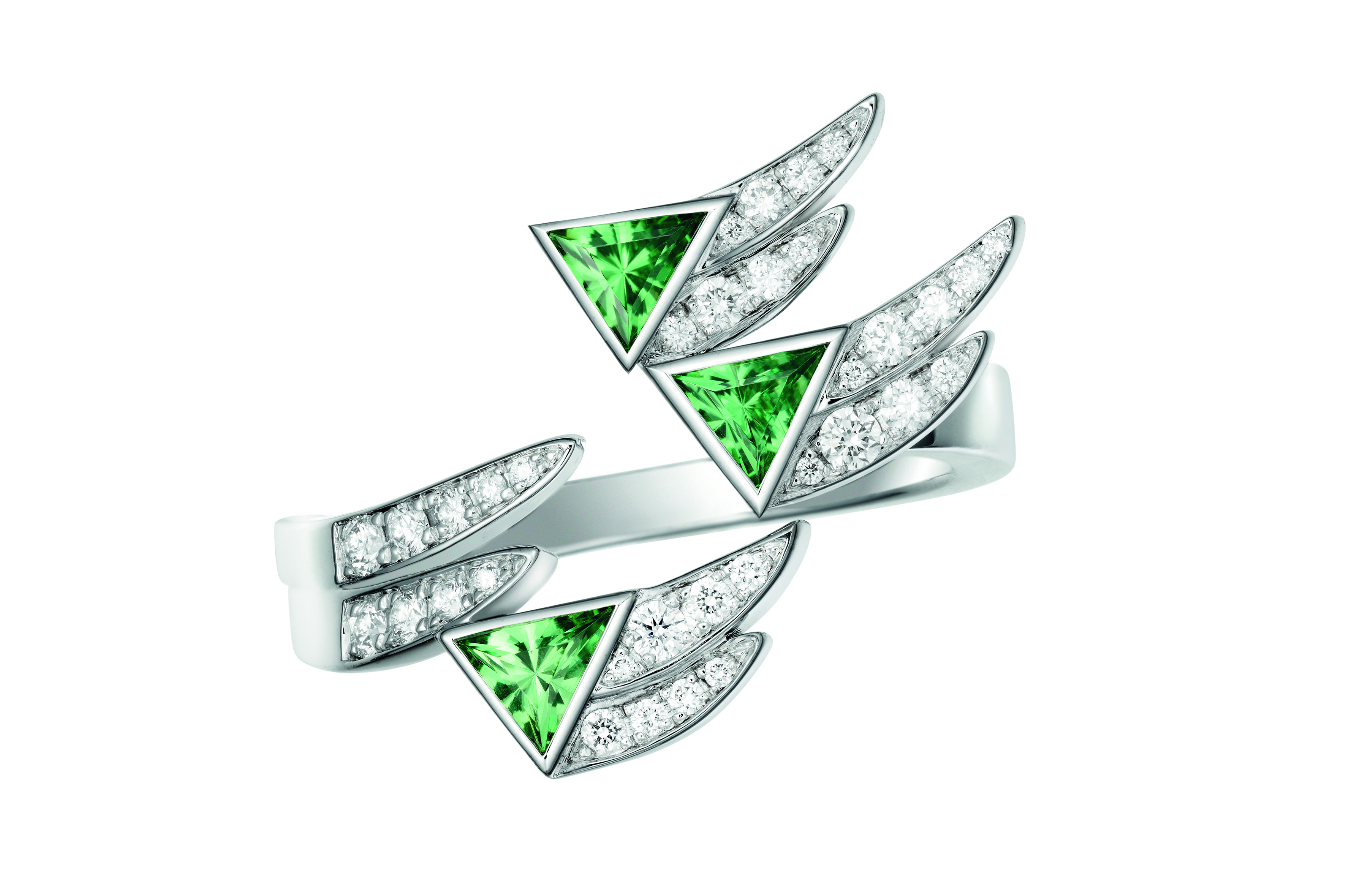 The double rings can be worn alone or together with a single ring model. They delicately adorn the hand, giving the fingers an air of elongated grace, and seem to be about to fly away. The various designs in triangular fine stones, reminiscent of as many species of birds, exalt these wings, set throughout with white diamonds. The earcuff model, sold as a single piece, perfectly envelops the auricle. It is mounted on a flexible white gold stem from which sprout sleek wings, while plumage on the back of the lobe further intensifies their mysterious presence.
