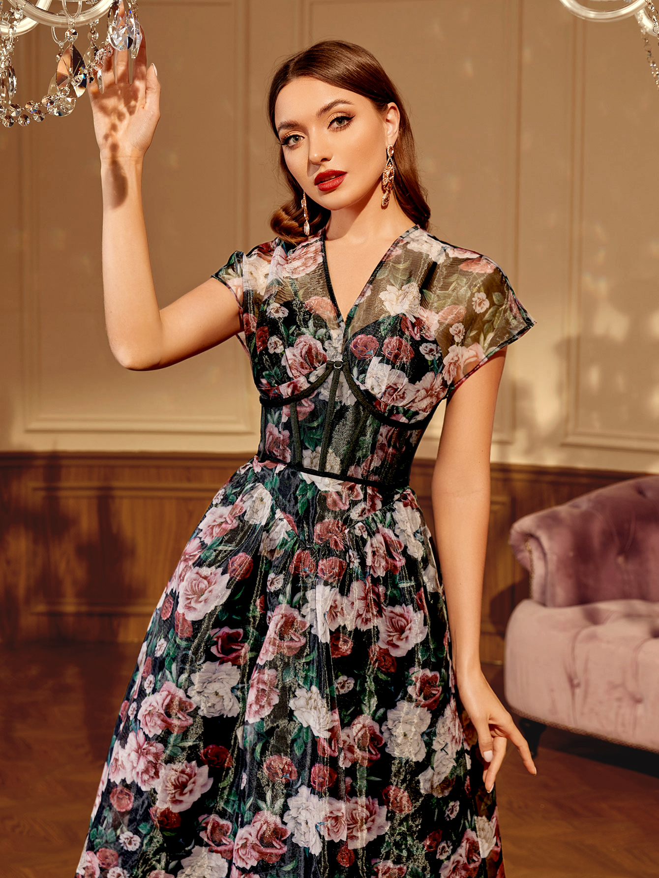 Draws inspiration from retro palace-printed fashion, while deconstructing it with a modern twist. Light satin fabrics, set in maxi skirts, halter necks, girdle seals, and other elements add to the retro tone.