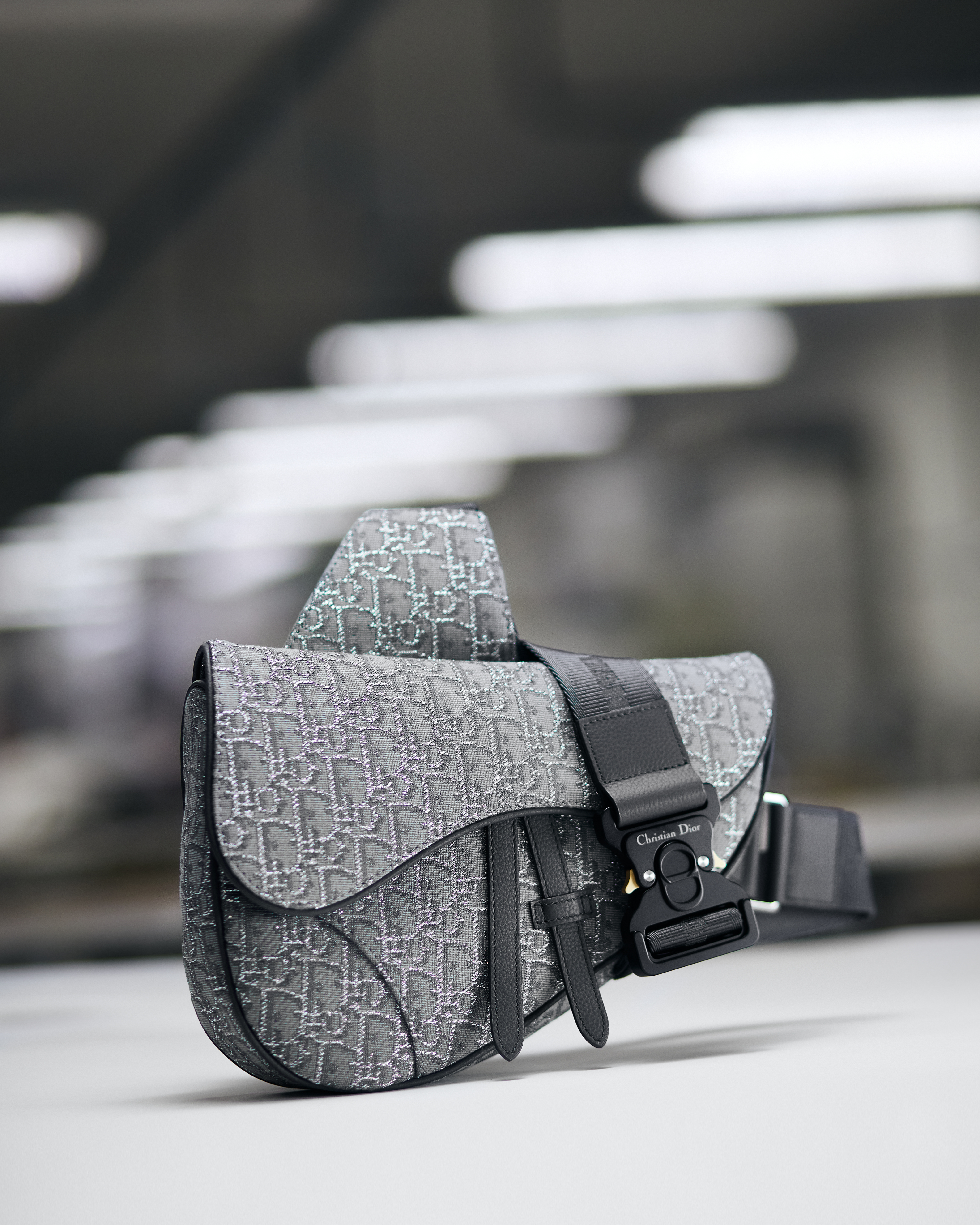 Dreamed up by Marc Bohan in 1967, the Dior Oblique Toile - which has become an unmistakable signature since its creation - has been reinvented this season as an iredescent variation. This timeless jacquard is enriched with Ruthenium-colored lurex threads and embellishes the Dior Spring 2023 Men's Collection. The result of exceptional craftsmanship, this new material is adorned with metallic highlights and illuminates the Saddle, Dior Lingot and Dior Gallop bags, as well as small leather goods and the iconic B23 and B27 sneakers. Striking a balance between heritage and audacity, this precious fabric underscores the spirirt of innovation cherished by the House of Dior. A tribute to the art of detail.