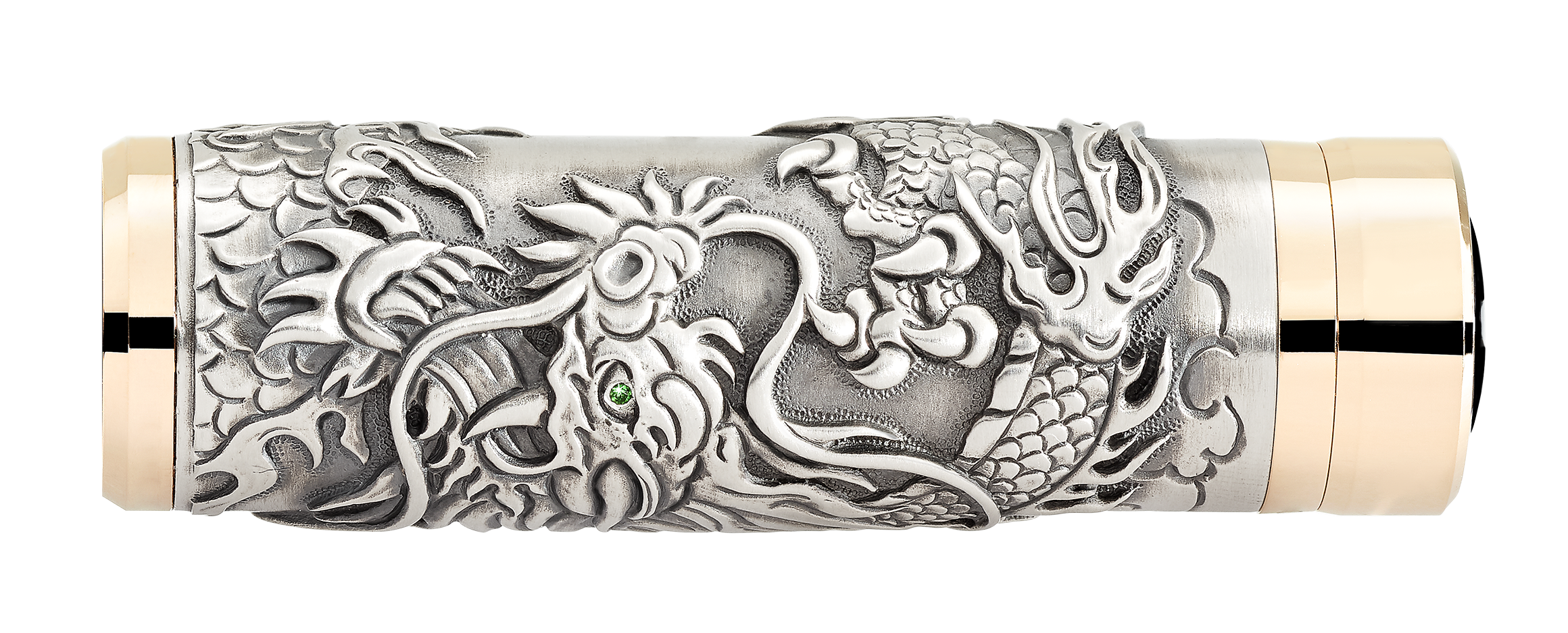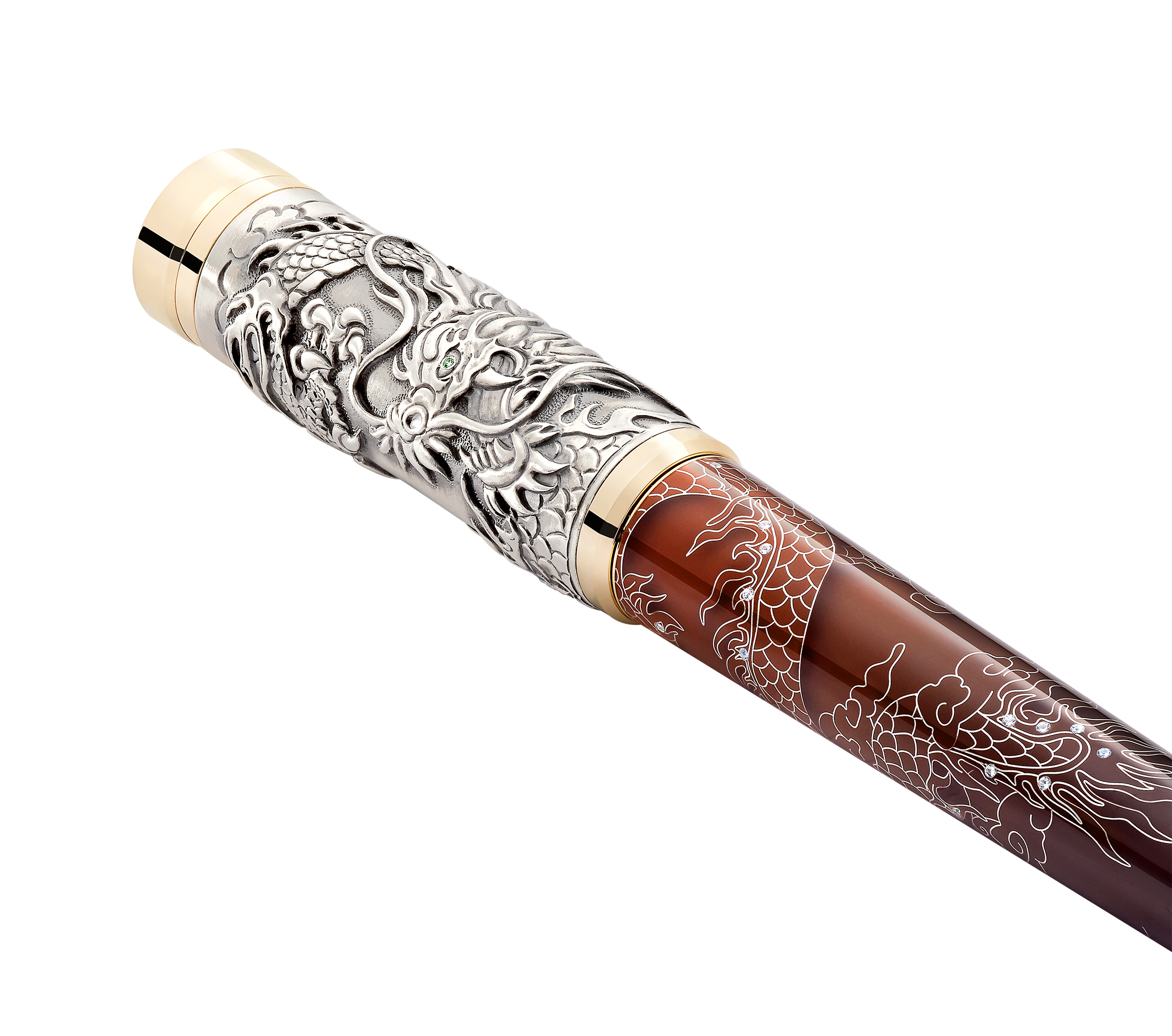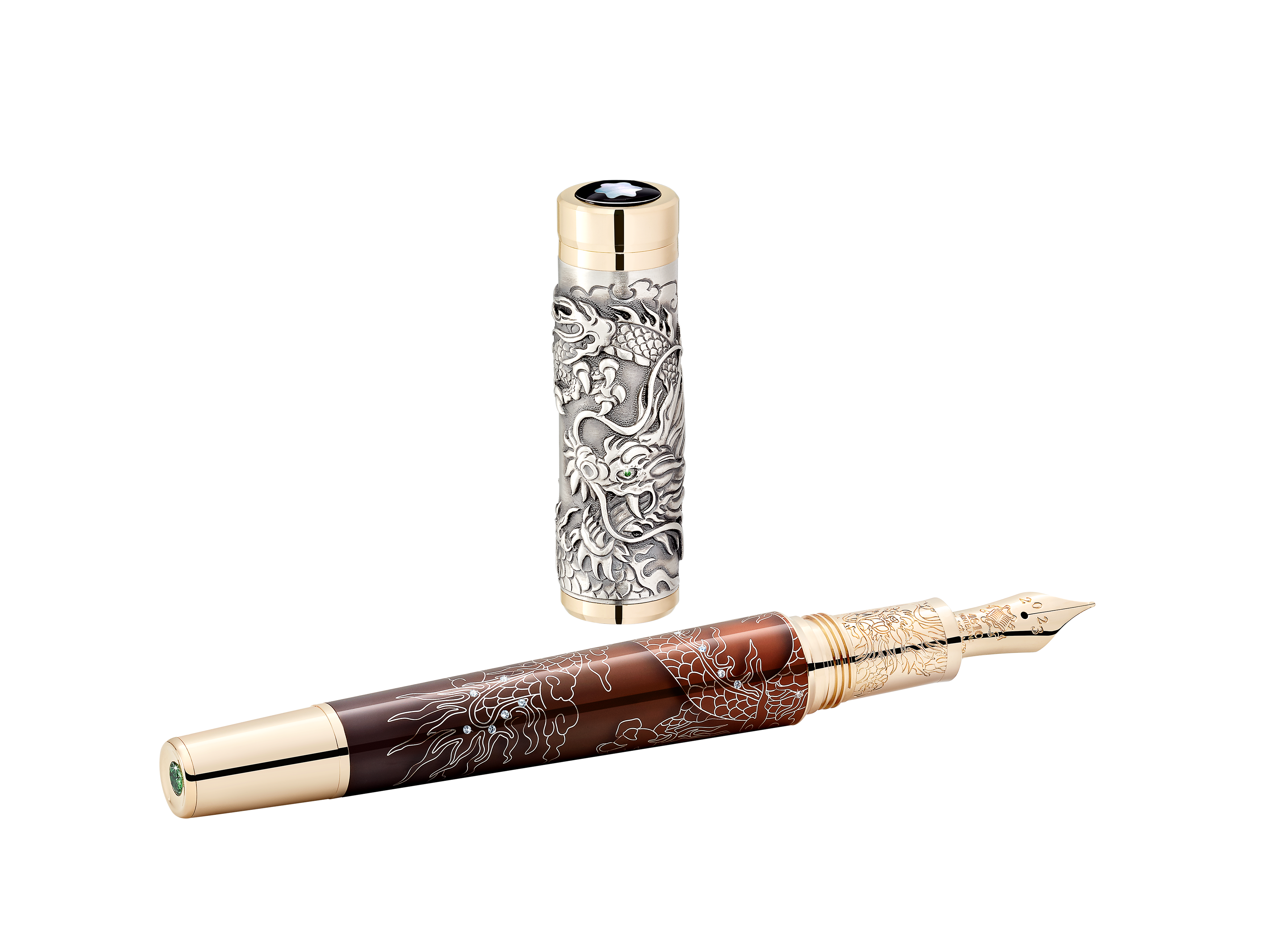 The majestic character of the Earthly Dragon (璃龙) winds around the barrel and cap of the Earthly Dragon Limited Edition 88, with green tsavorite garnets for its visible eye. While its artfully sculpted head decorates the handcrafted Ag 925 sterling silver cap as a relief, its body moulds itself to the barrel as a delicate engraving studded with diamonds, illustrating the meaning of 璃 as ‘crystal mineral’ or, originally, ‘coloured glaze’. The earthy brown-shaded colour gradient of the barrel’s lacquer surface refers to the underground habitat of the Li Long spirit. The design is further enriched with fittings made of Au 750 solid gold and a green tsavorite garnet set in the cone. The handcrafted nib, made of Au 750 solid gold, bears a delicate engraving of a book, as the eighth son of the dragon, Fu Xi, loves literature and stands as a symbol of knowledge and education. The cap top is crowned with the Montblanc emblem inlaid in black onyx and covered with sapphire glass.