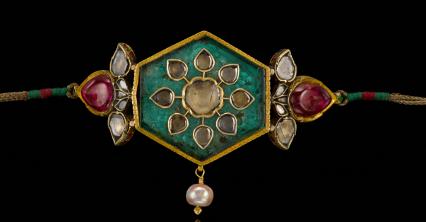 This beautifully carved emerald and diamond-set gold bazuband (est. £120,000-150,000) and gem-set and enamelled belt buckle (est. £40,000-60,000) both from North India in the 19th century, were both reputedly in the collection of Maharani Jindan Kaur (1817-63), wife of Maharaja Ranjit Singh (1780-1839).