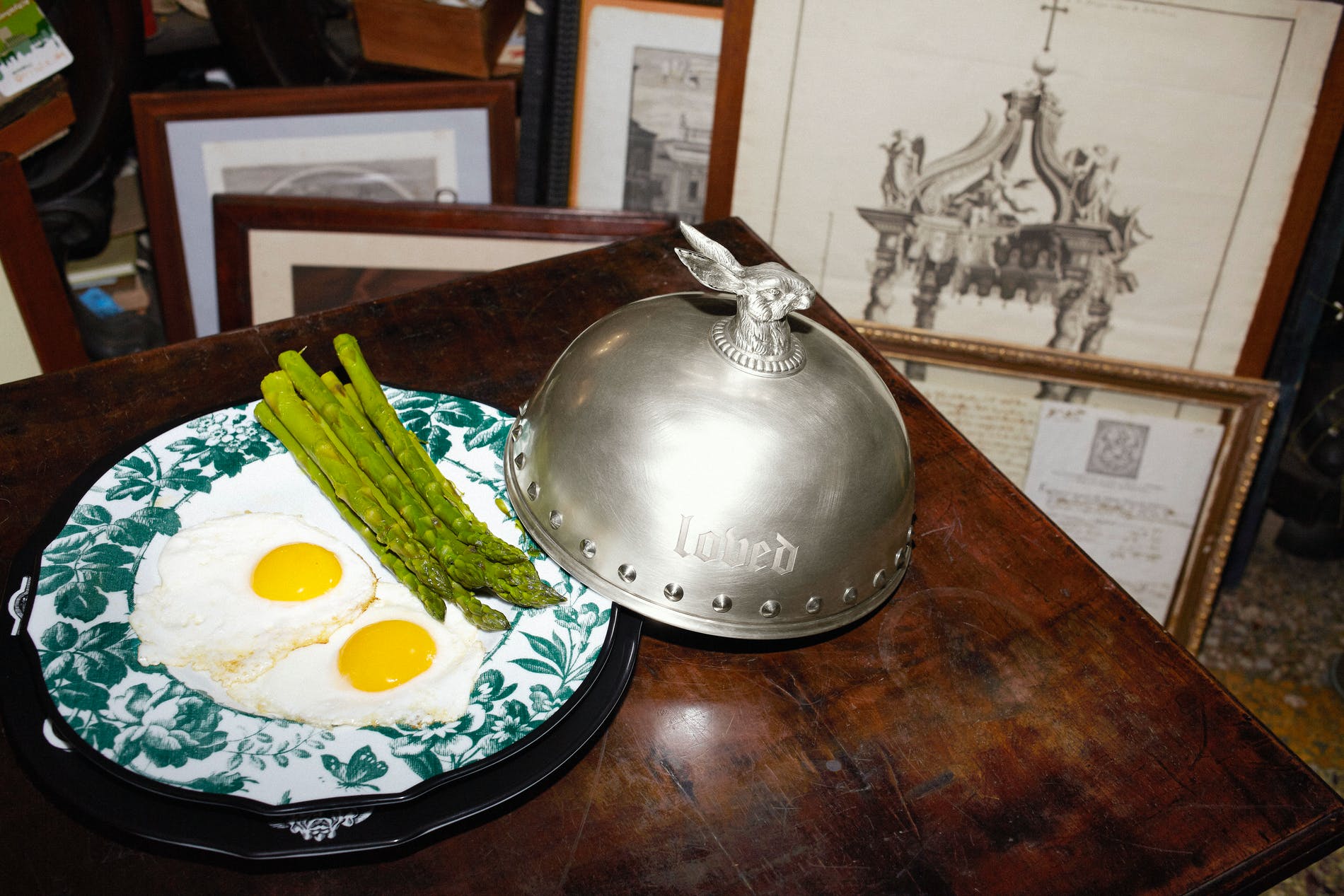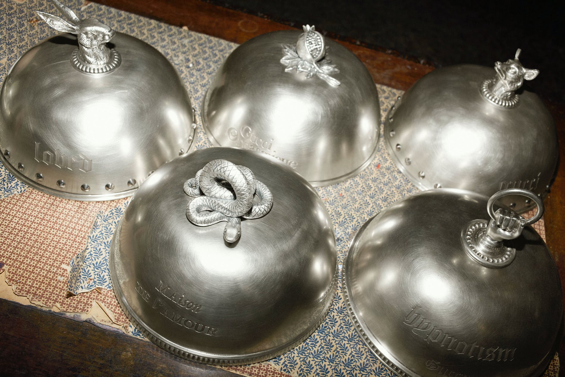 The communal table is of course the heart of many homes and to introduce daily luxury to the ritual of dining, Gucci Décor has developed a group of distinctive cloches made from silver-plated brass with an antique effect. Cloches reference meal times at the great houses of the past, and in the context of contemporary life make an eccentric impact. Each of these domed plate covers displays an engraving of a different word or phrase: for example, “Maison de l’Amour”. They can also be personalised with the addition of initials. Every cloche requires a production process of 10 different phases and laser engraving for the script; the vintage finishing is done by hand. The cloches come with five different handles featuring animals and designs taken from the House archive: a hare, hand, snake, wolf and pomegranate. The hare and wolf heads reference 18th and 19th century English and Scottish decorative silver stirrup cups that were used to offer drinks to horseback riders.