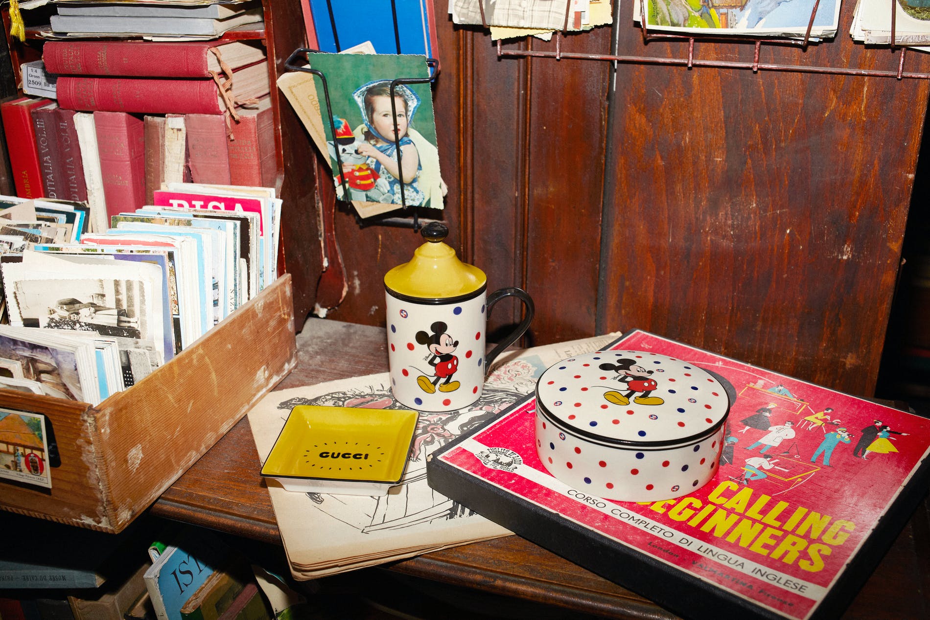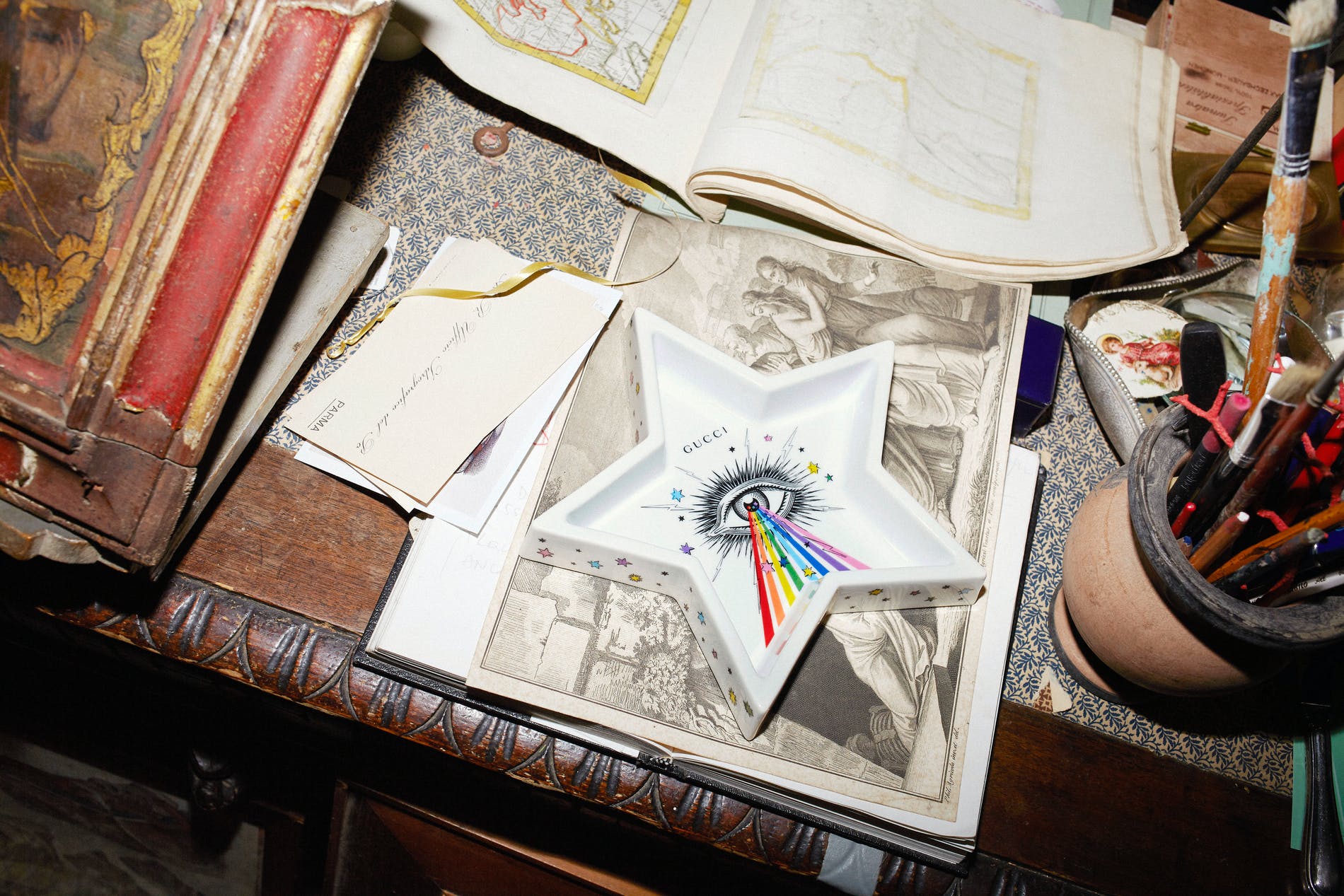 Another recurring theme for Gucci Décor is the star and eye print. Now the black and white version has been reworked and enriched by incorporating a bright, multicolour rainbow surrounded by colourful stars for a porcelain star-shaped ashtray and three different porcelain mug designs with black snake handles (these handles are inspired by similar forms in the Richard Ginori archive in Florence). For the celebration of the Chinese New Year 2020 – the year of the rat – Disney’s legendary character Mickey Mouse makes an appearance on