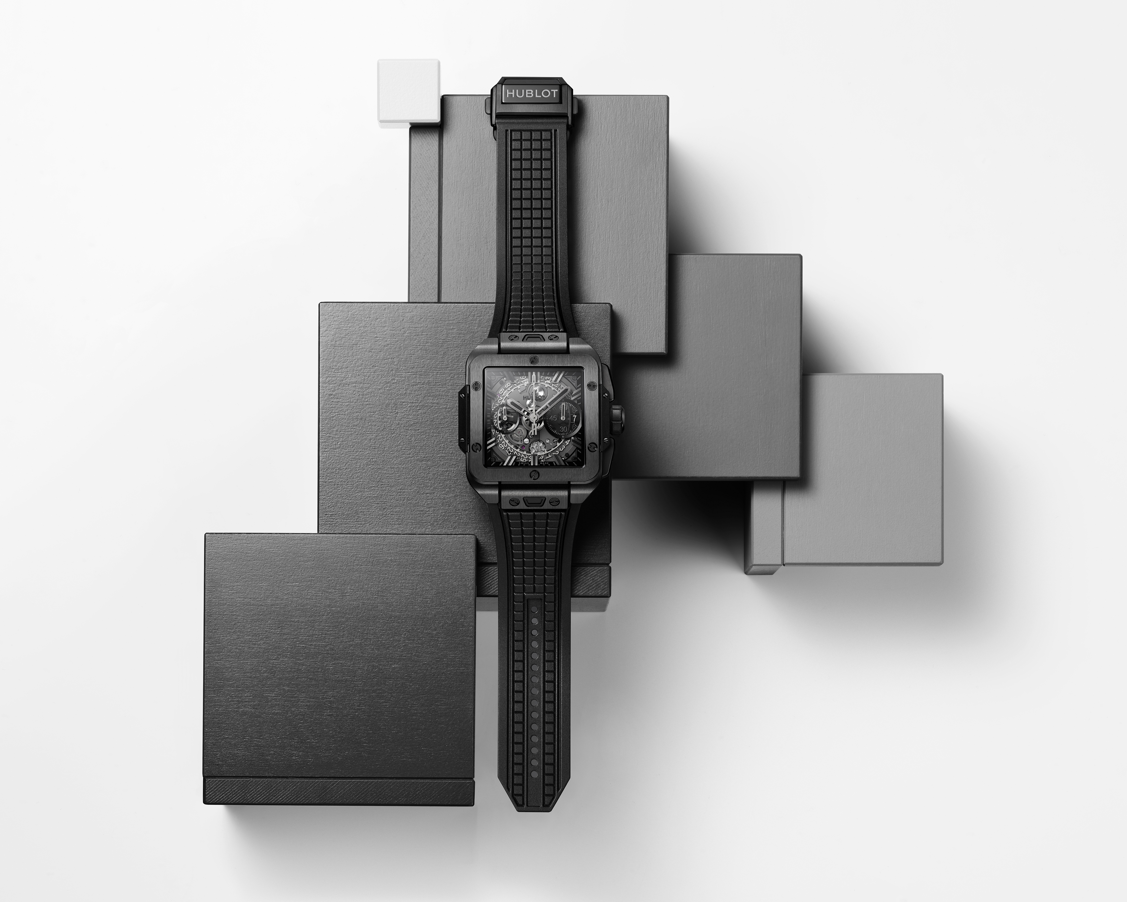 More than 15 years after its invention, the All Black livery once again proves its versatility and power. This is clearly showcased in its new incarnation as Square Bang Unico. Whether it is the case, bezel, push-pieces, strap, plate or hour markers: black is present on all the surfaces while polished or satin-finishes alternate to reveal subtle shades which are for the owner’s eyes only. Ceramic and titanium meet, harmonise and merge. A rare design, for collectors who prefer to take the path less travelled.