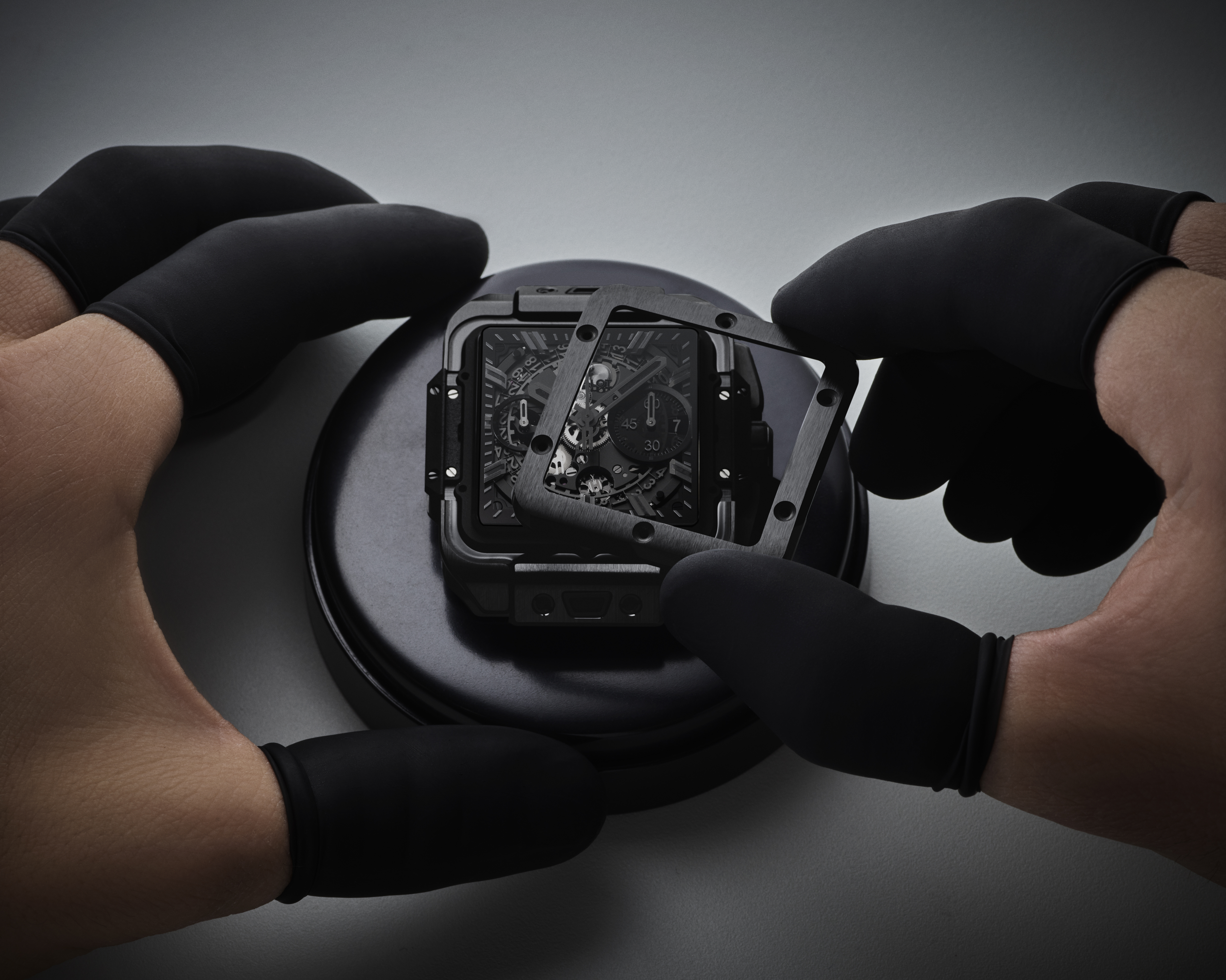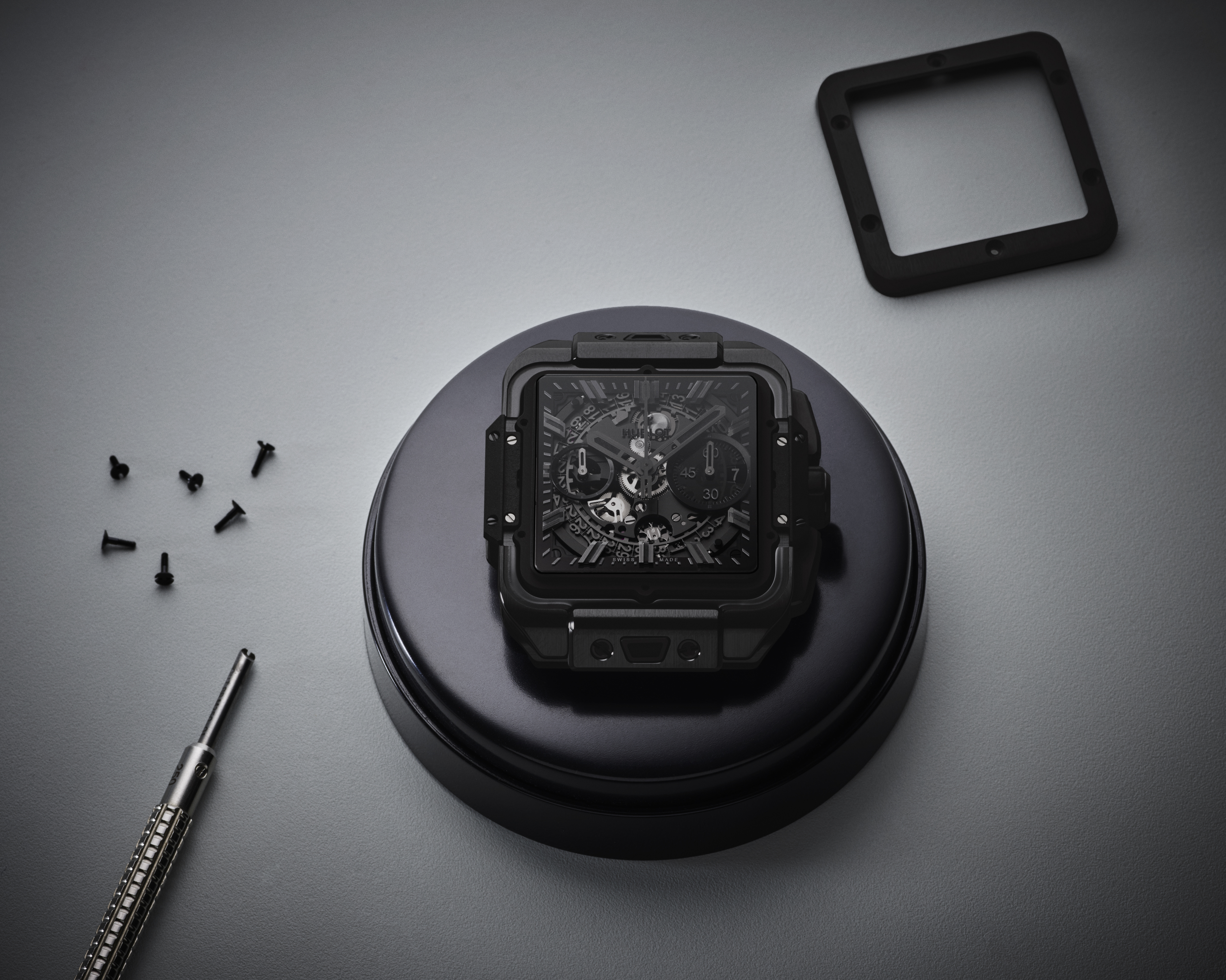 The second challenge was the modular construction of the case, designed in line with Hublot's DNA, with a central housing dressed with an upper and lower plate to enable a myriad of combinations and transformations. But this time, it is square in shape, and therefore much more difficult to make water resistant - Hublot pulls off the challenge with a guaranteed water resistance to 100 metres. The size of the case is also an important factor to ensure this model is perfectly ergonomic, providing comfort on the wrist very similar to that of the 42 mm Big Bang. Its pedigree from the brand's icon can be seen in countless details.