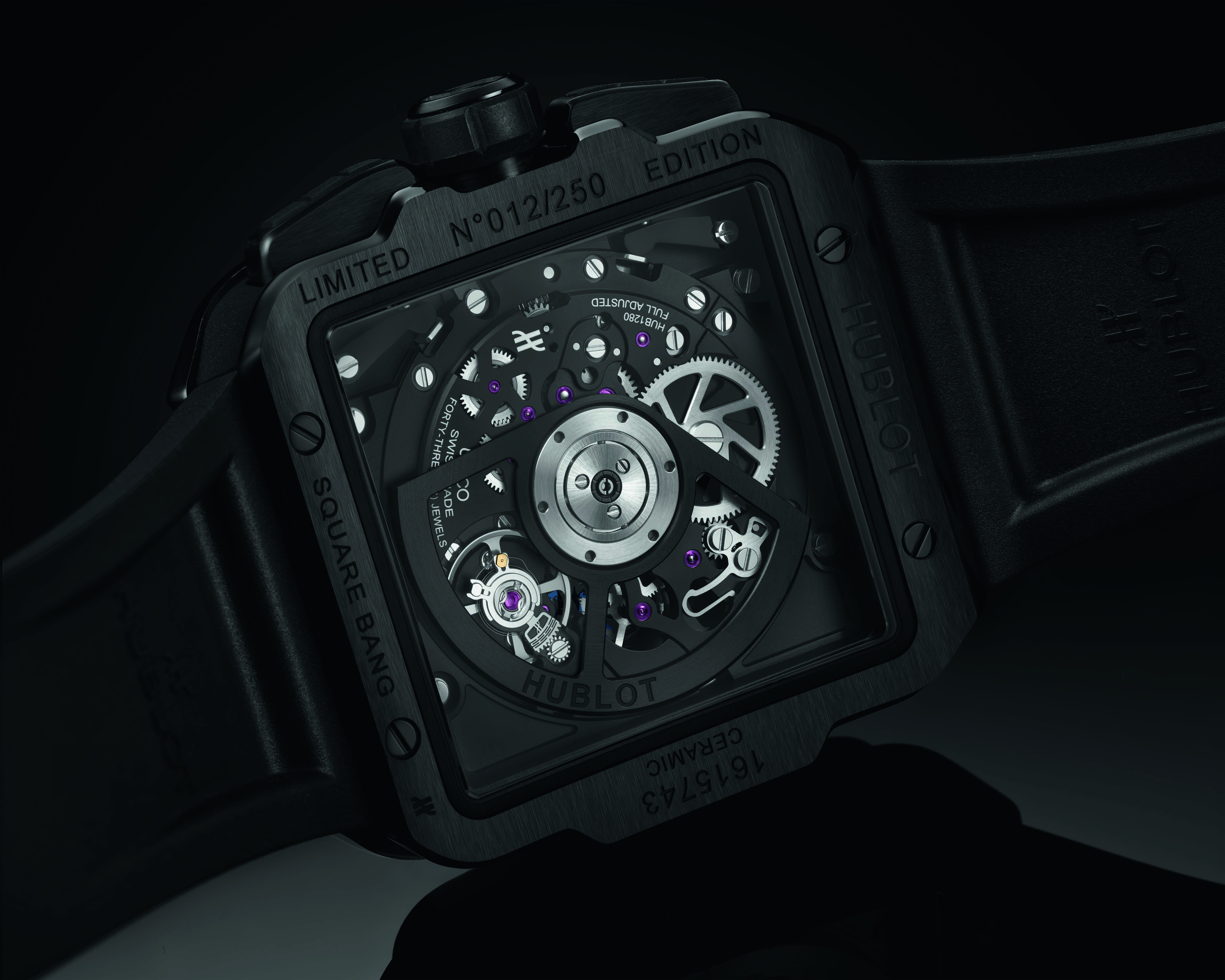 Today, a fourth shape has been created: the square. Its geometry bewitched Hublot because of the challenges it sets. First, the movement. Since every calibre has the wheel as its basic component, it therefore needs a round movement. If you are to place a round movement harmoniously in a square case, this requires a very specific style. This is why most watchmakers hide their movement, to give the illusion of using a shaped movement or because they have failed to find a consistent aesthetic style.