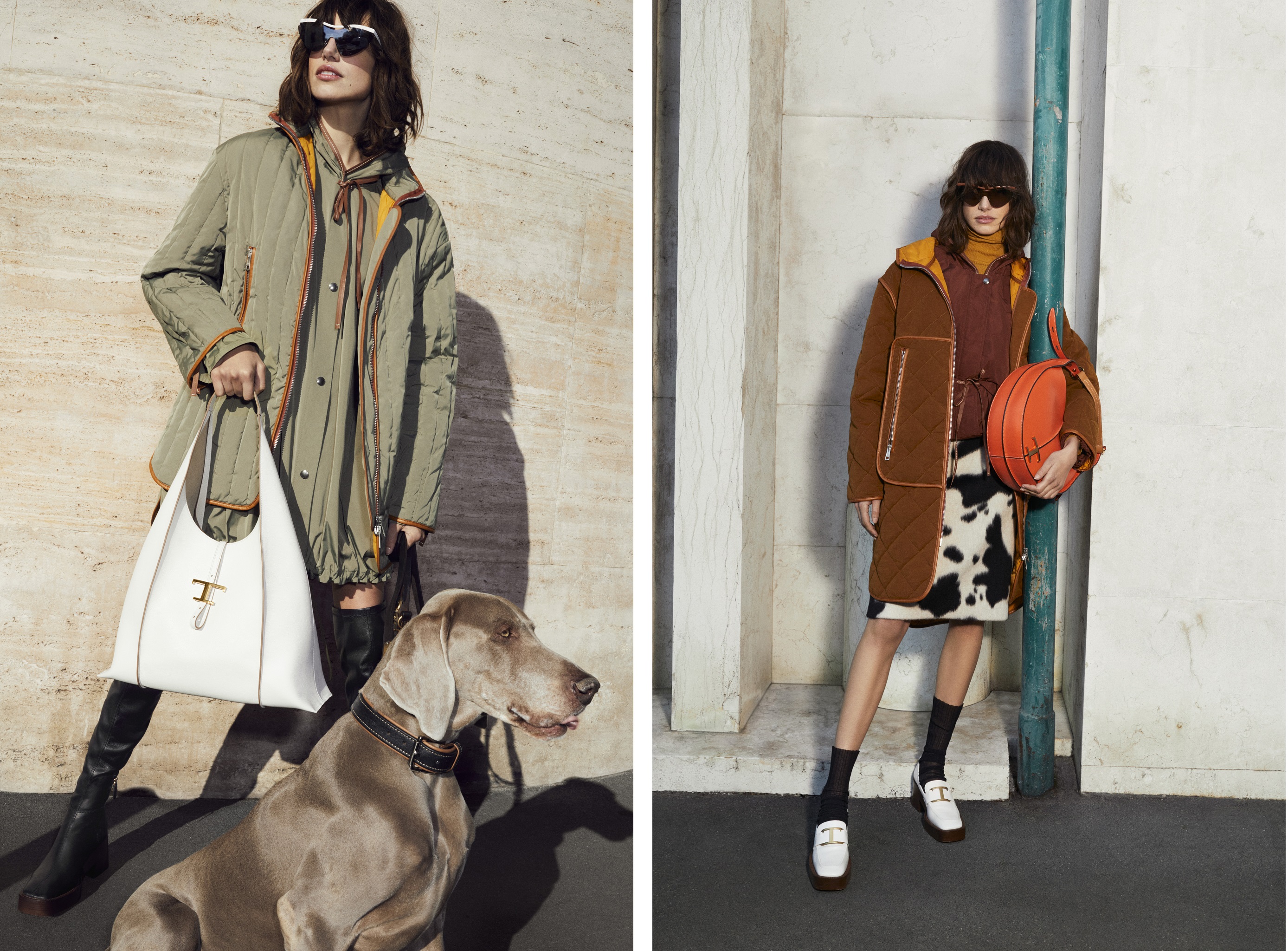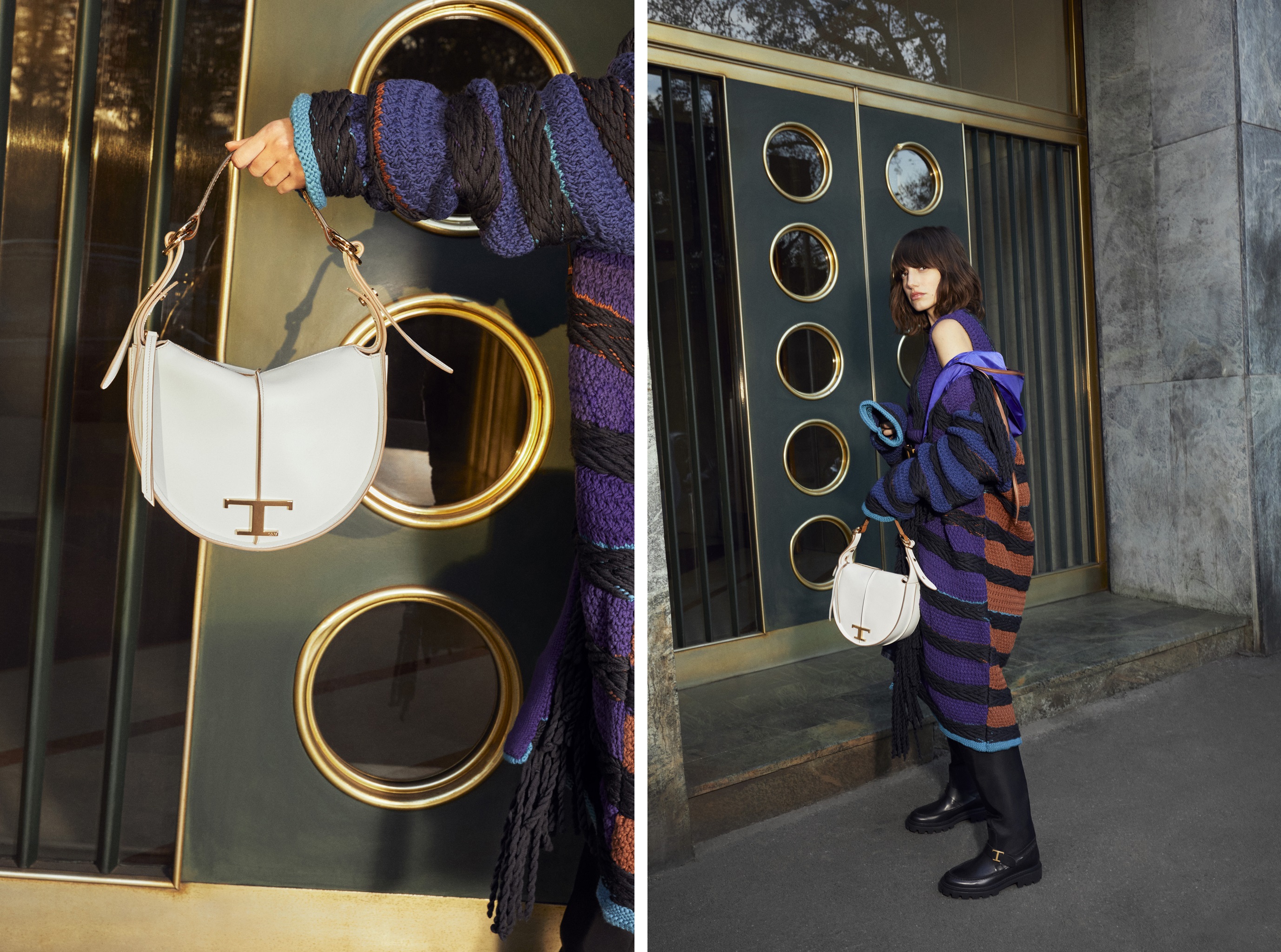 The giant Tod's Kate chain, a detail that has become iconic for Tod's, is flanked by Gommino pebble details on the key pieces of RTW, such as the bomber jacket, enriching the elbows of jackets and the sides of bags. The T Timeless stands out on the edges of the bags, including the new half-moon version and clutch, and on the metalwork of the belts.