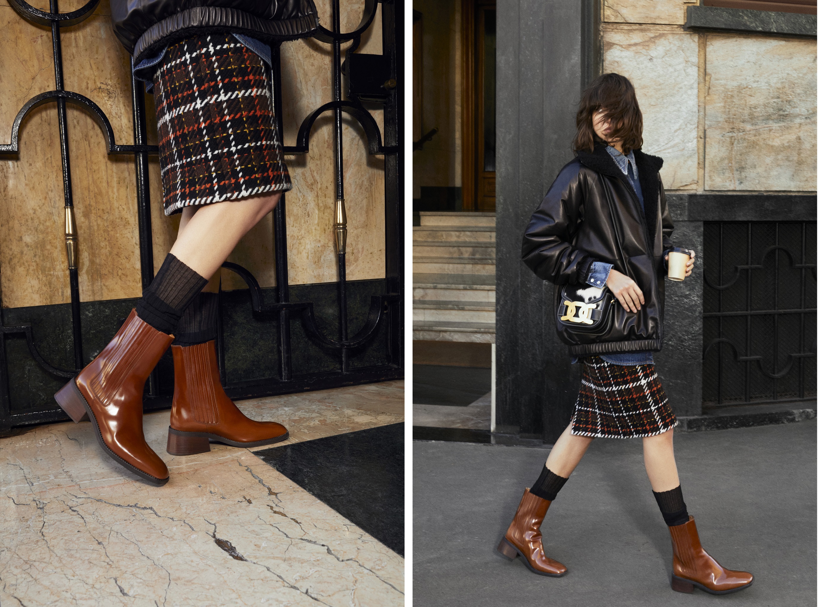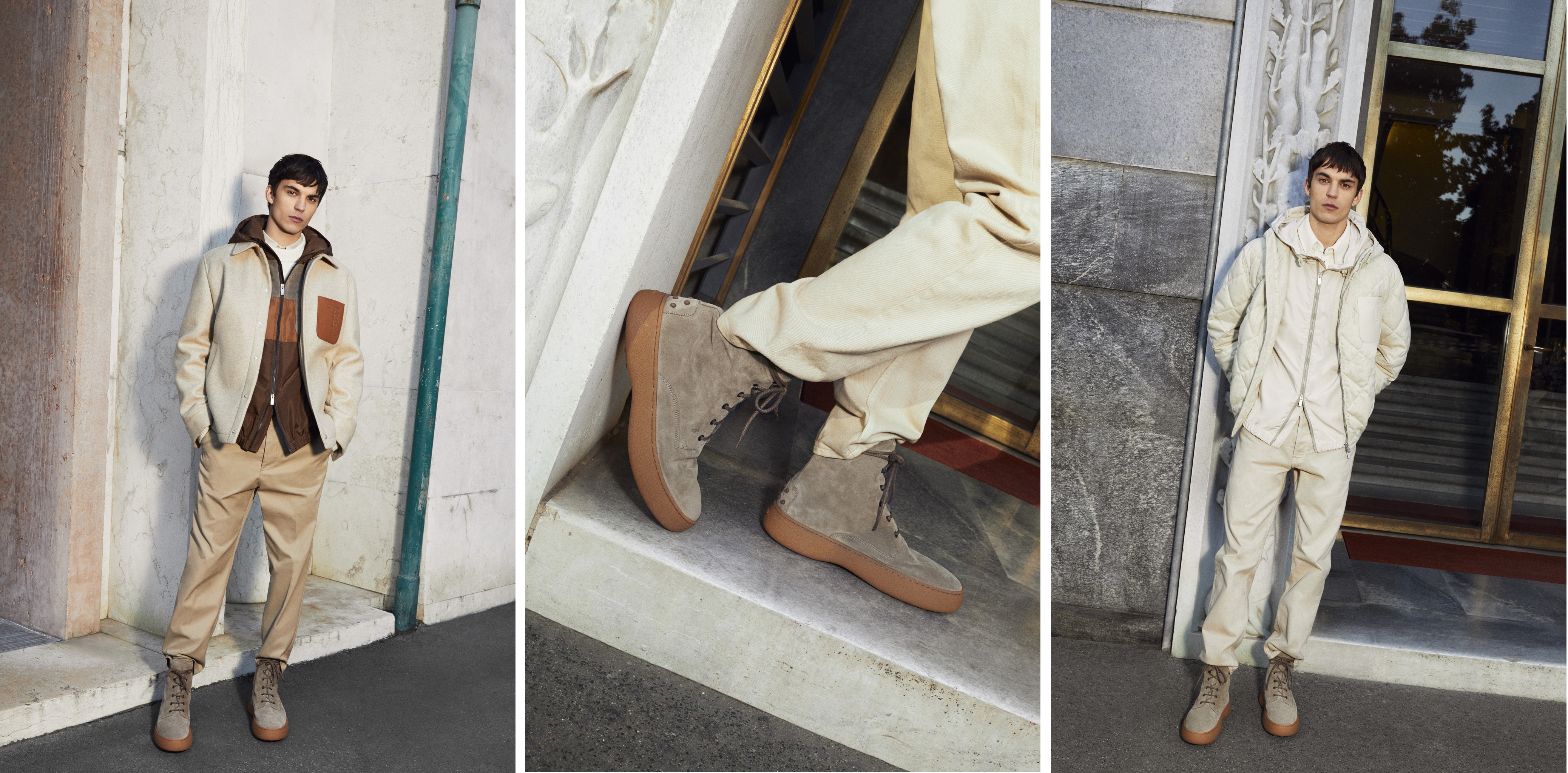 Footwear is the hero product in square, decisive shapes and brushed leathers.