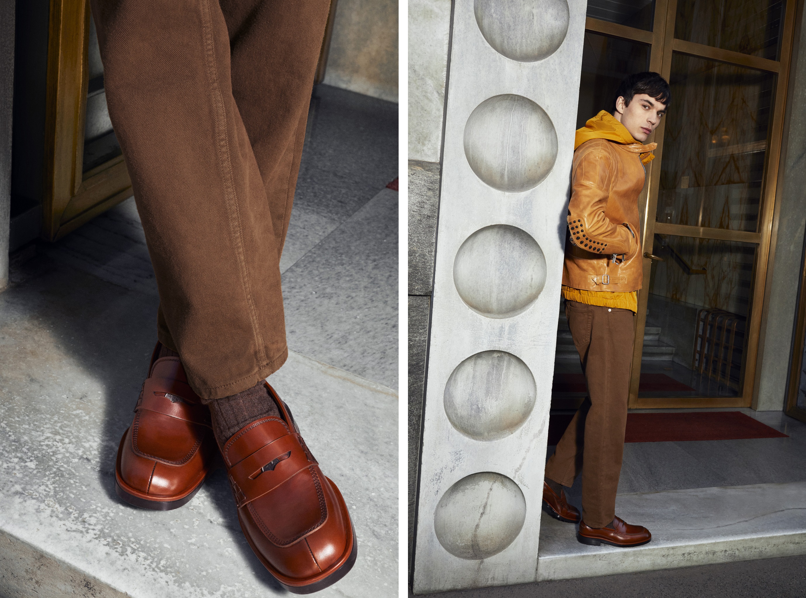 The shoes have a wide, bold bottom with a strong nineties’ inspiration, shapes that are also found in the stylistic evolution of the Winter Gommino which take on a more massive and contemporary image. In contrast, the formalwear has a more defined shape, with reference to the military world, shiny boots with contrasting laces and square penny loafers.