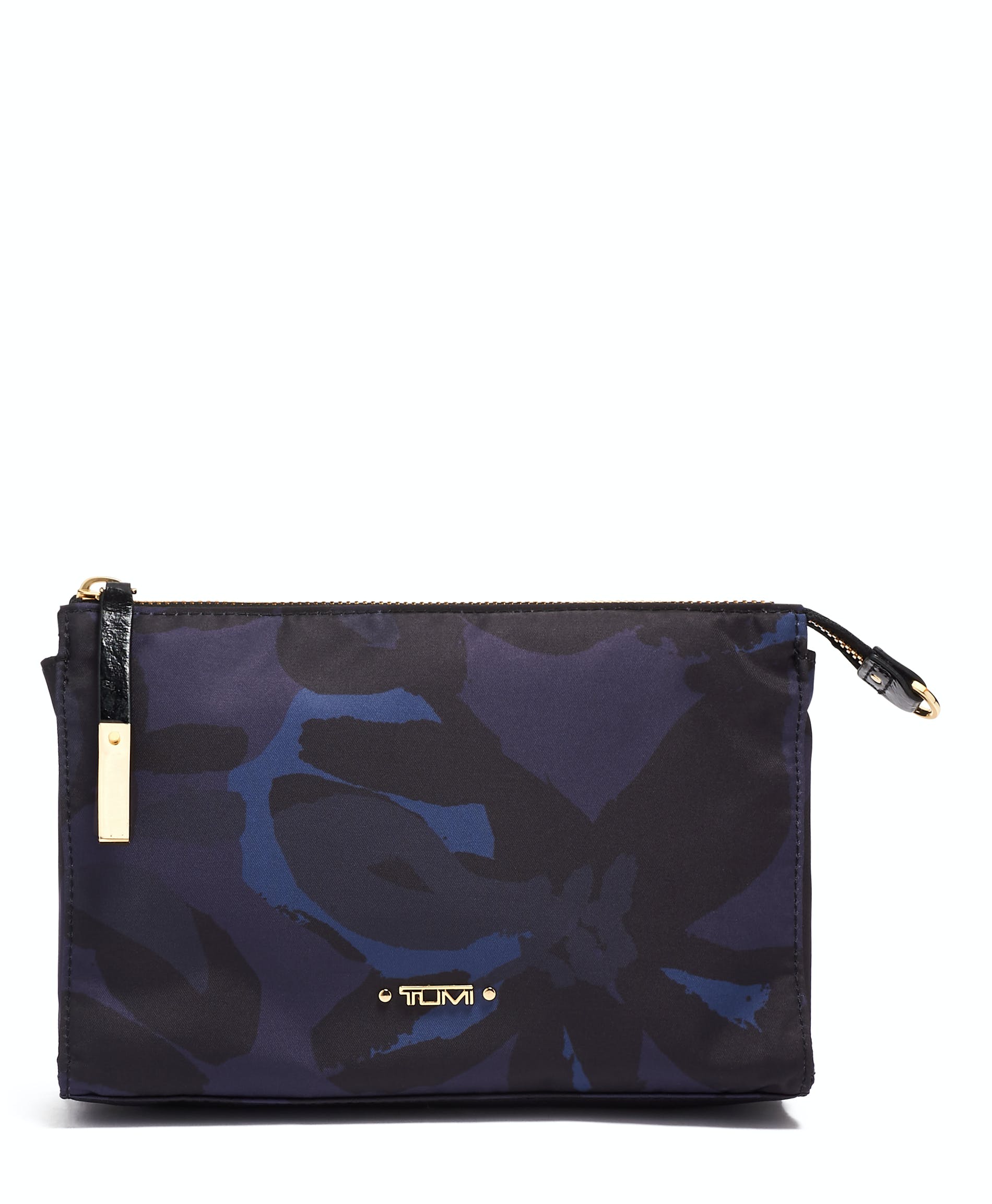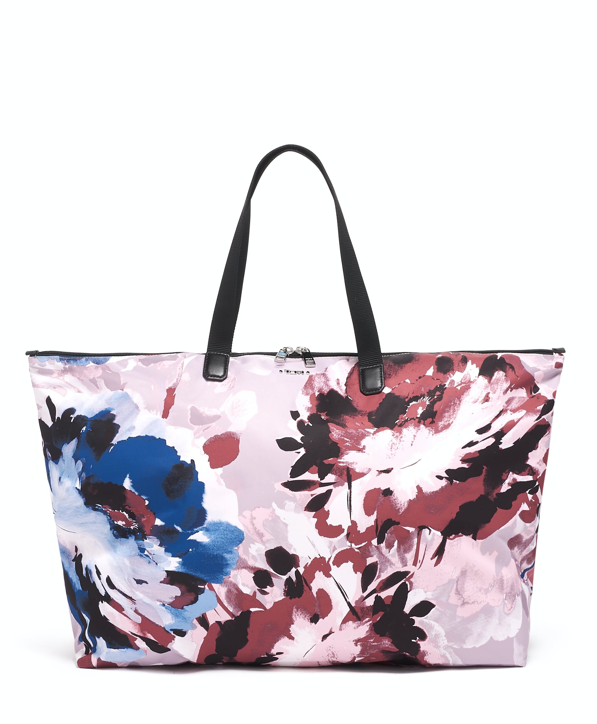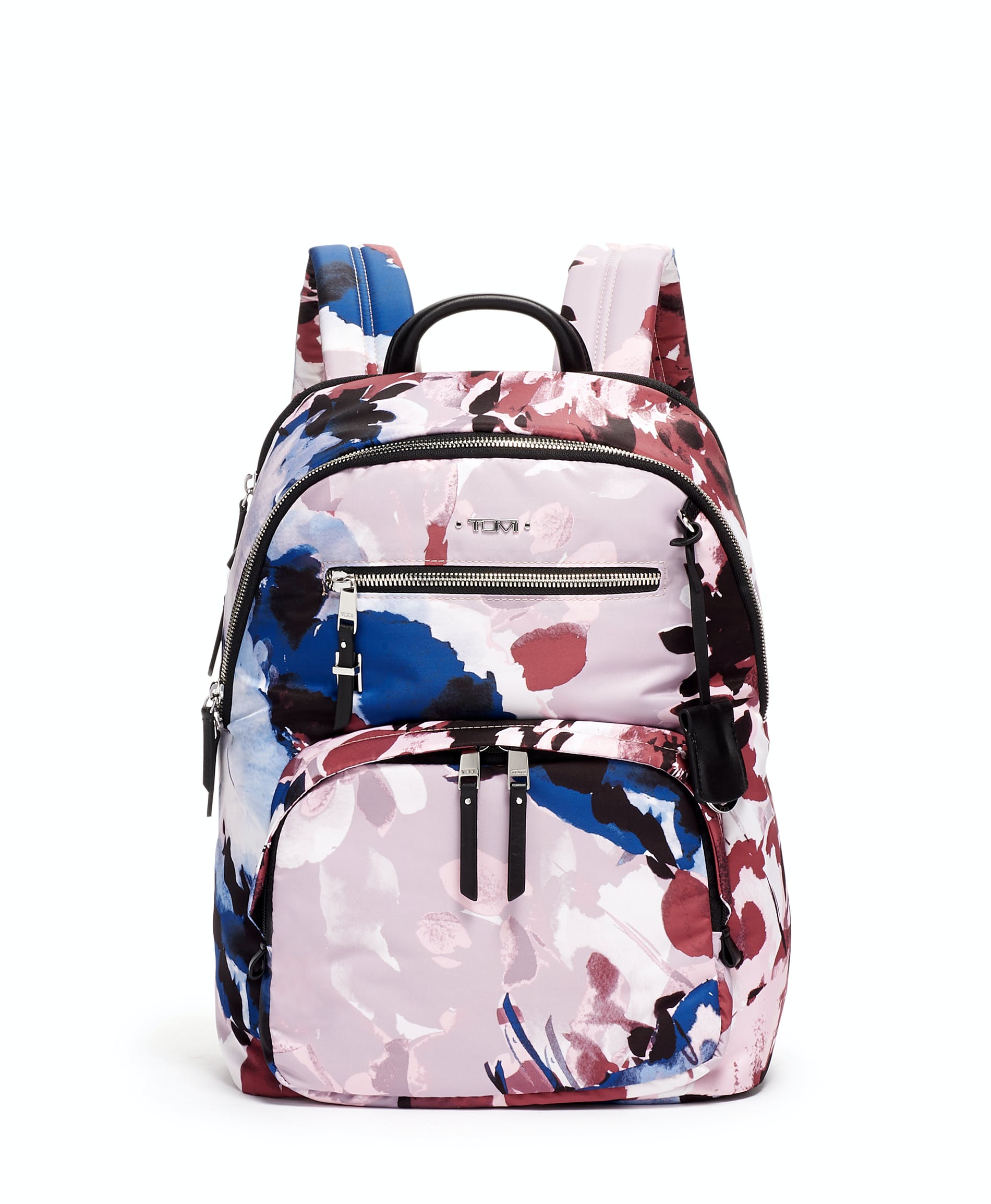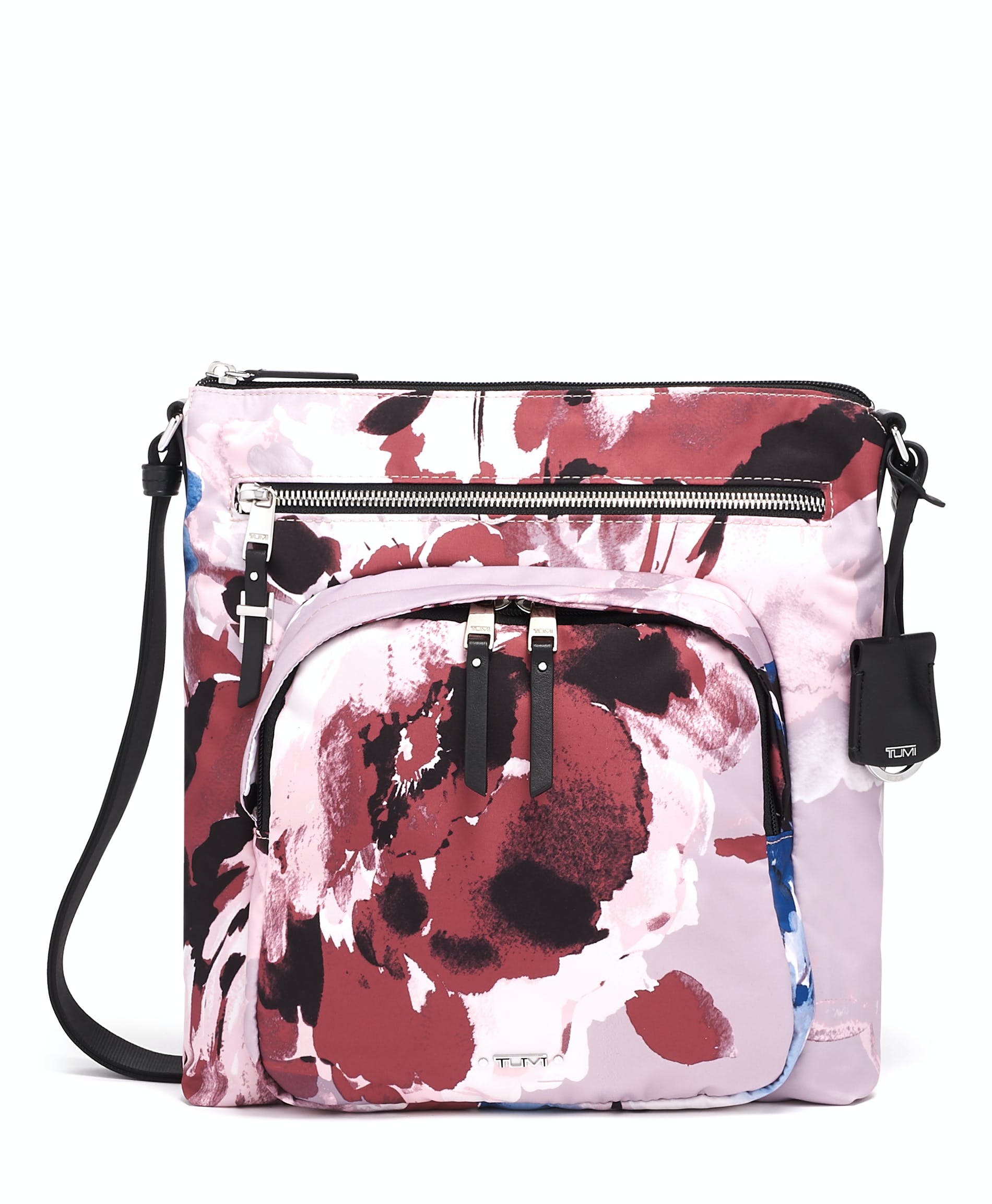 Seasonal colors for Voyageur include Blackberry and Gold with seasonal prints Blush Floral and Lily Abstract. The new Voyageur Novelty offering features Lily Indigo with patent leather and gold rivet detailing, elegant long zipper pulls, and a floral charm, while Black, Mink, Midnight, and Black Leather colorways continue.