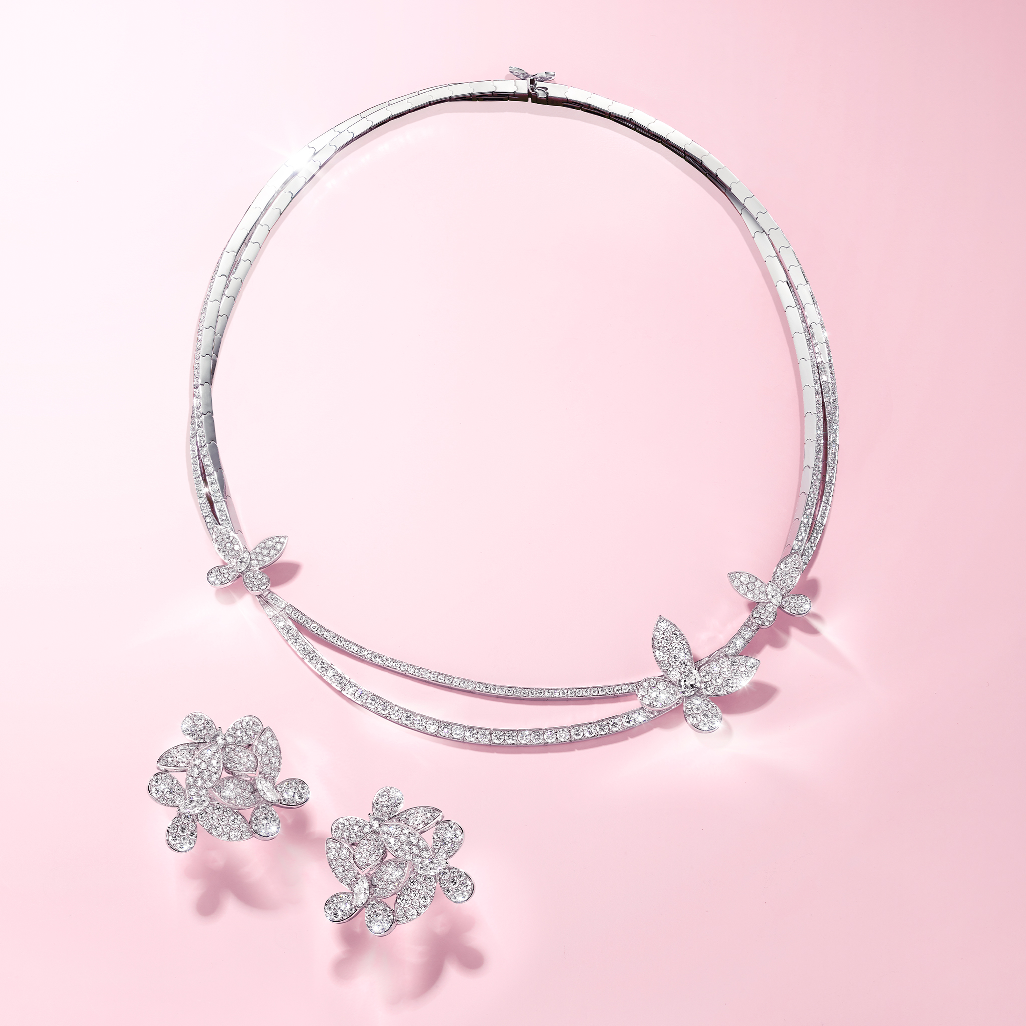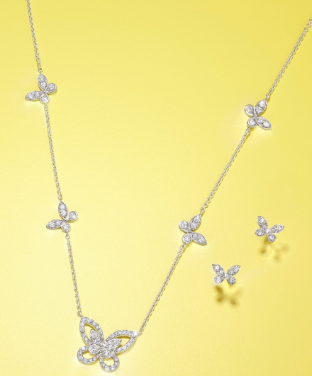 Bringing a very precious brilliance to the collection, pavé yellow and pink diamonds have been set to appear as if butterflies have come to rest, for a brief moment, upon exquisitely feminine necklaces, earrings and rings.
