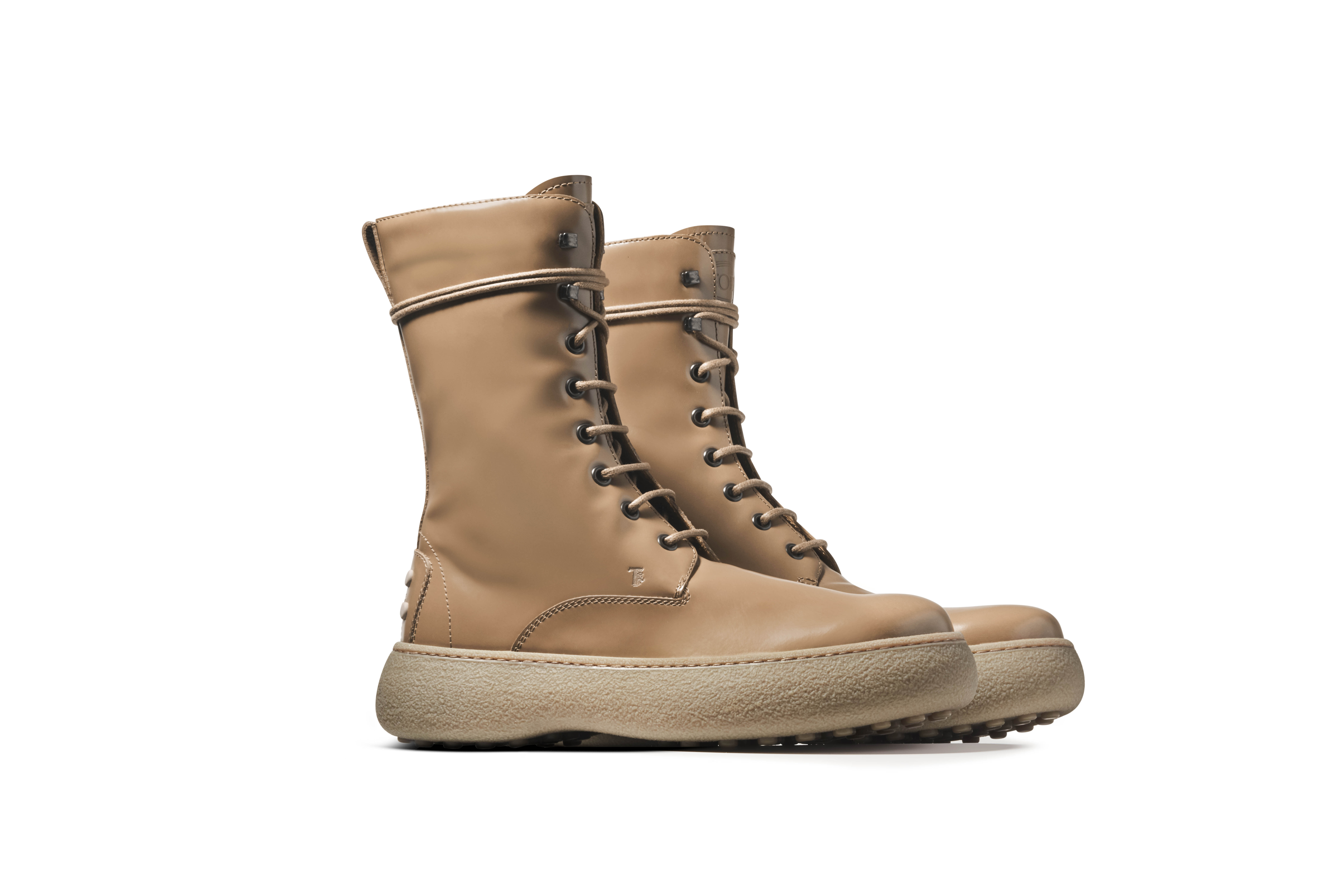 The laced W.G. ankle boot with rubber sole, has been updated this winter season, revealing new proportions and suede elements in warm, natural hues, for a masculine-inspired style that features high, voluminous soles reminiscent of combat boots and winter sports.