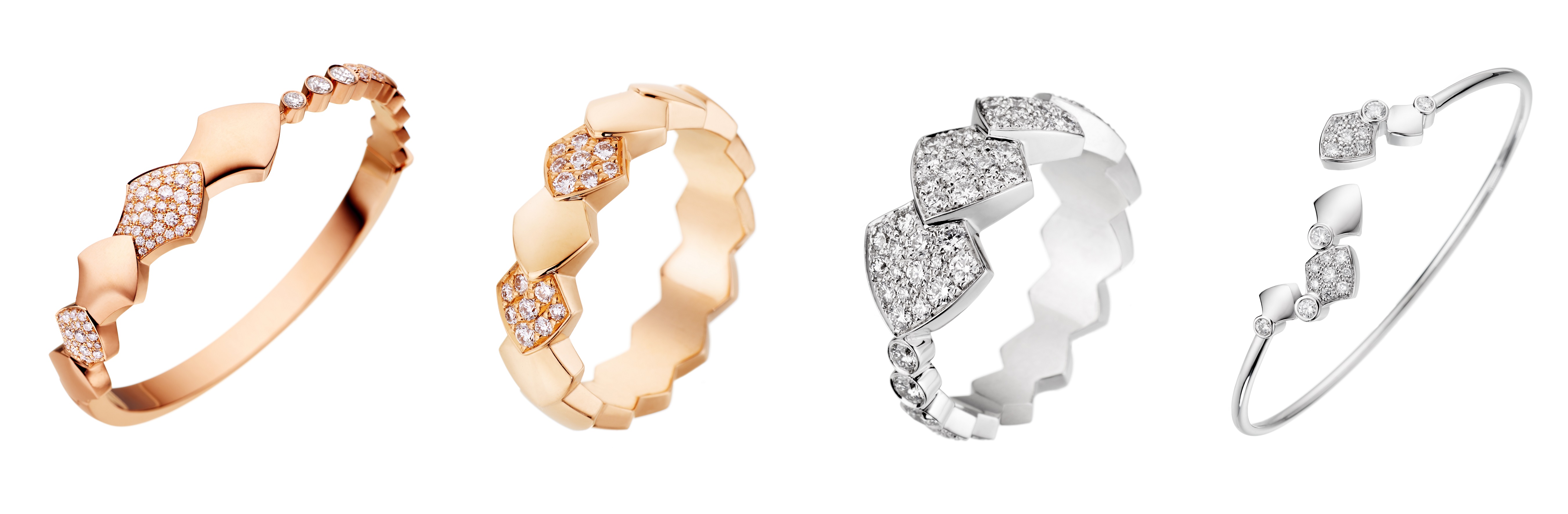 The collection, named PYTHON, conveys the warmth of the yellow gold and pink gold, and the coolness of the white gold and diamonds.