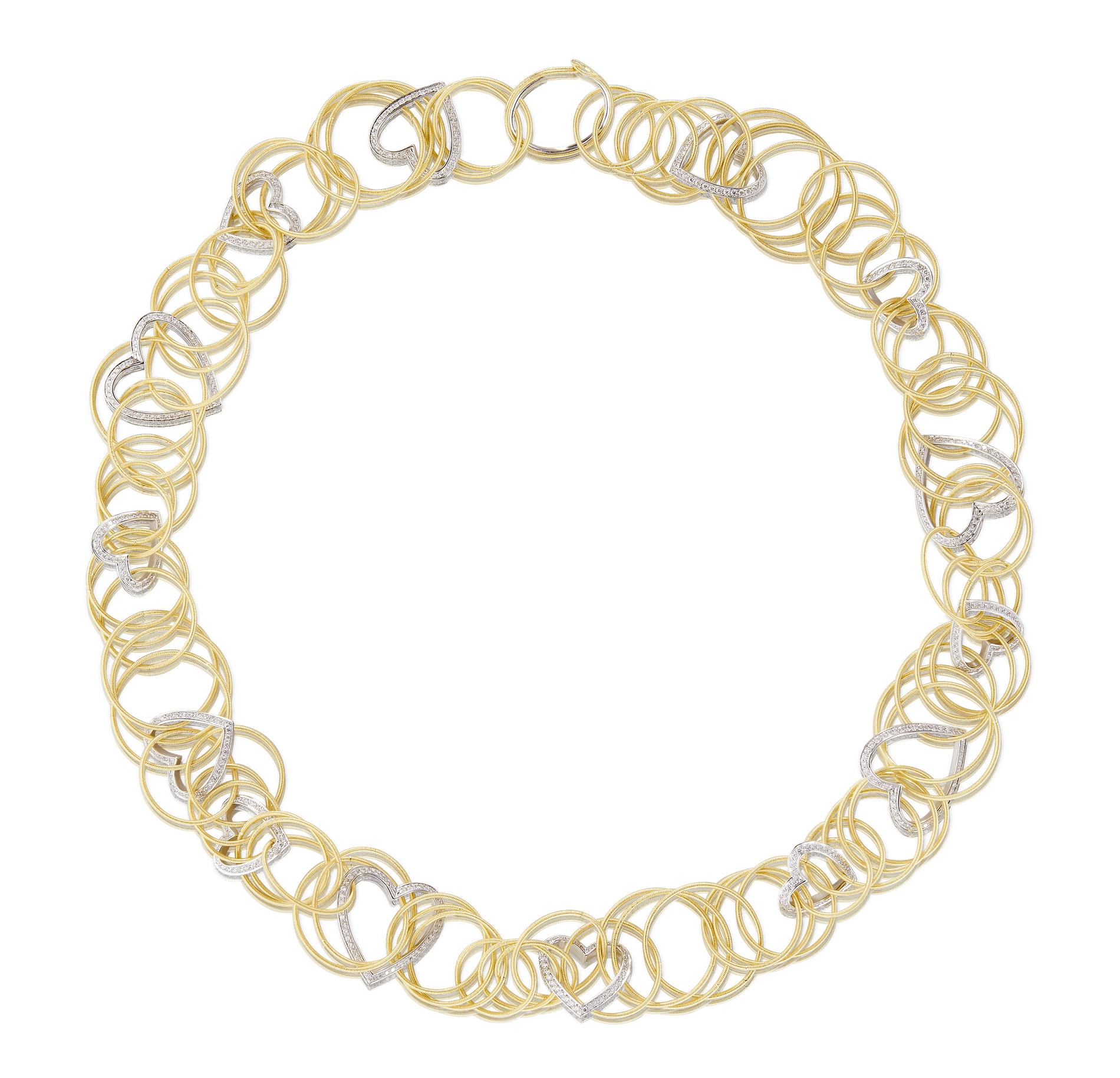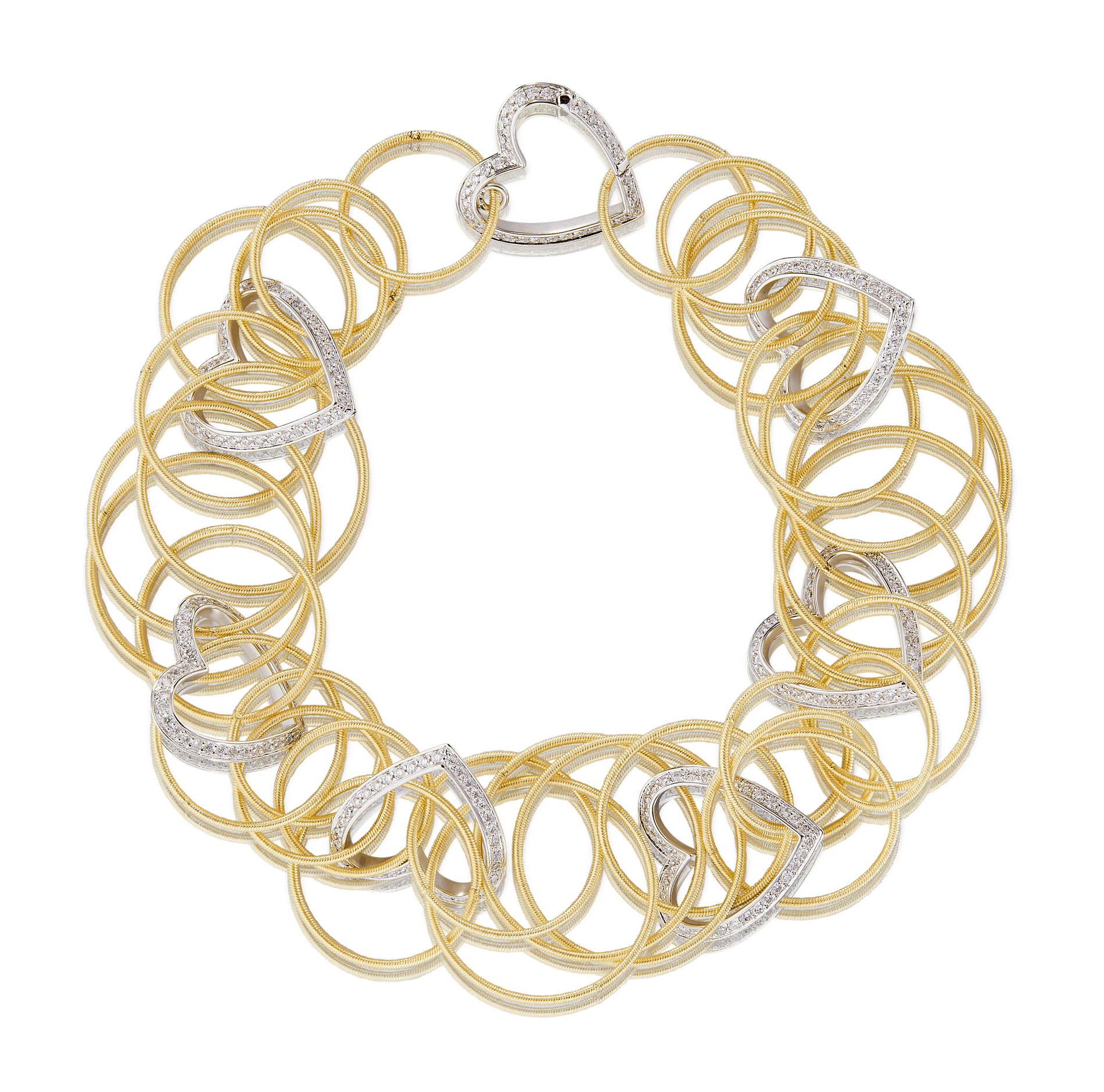 The yellow gold small circles in twisted thread composing these creations are enchained with lightness to one another, so to create a delicate cascade dotted with white gold hearts set with diamonds recalling the meaning of the feast.
