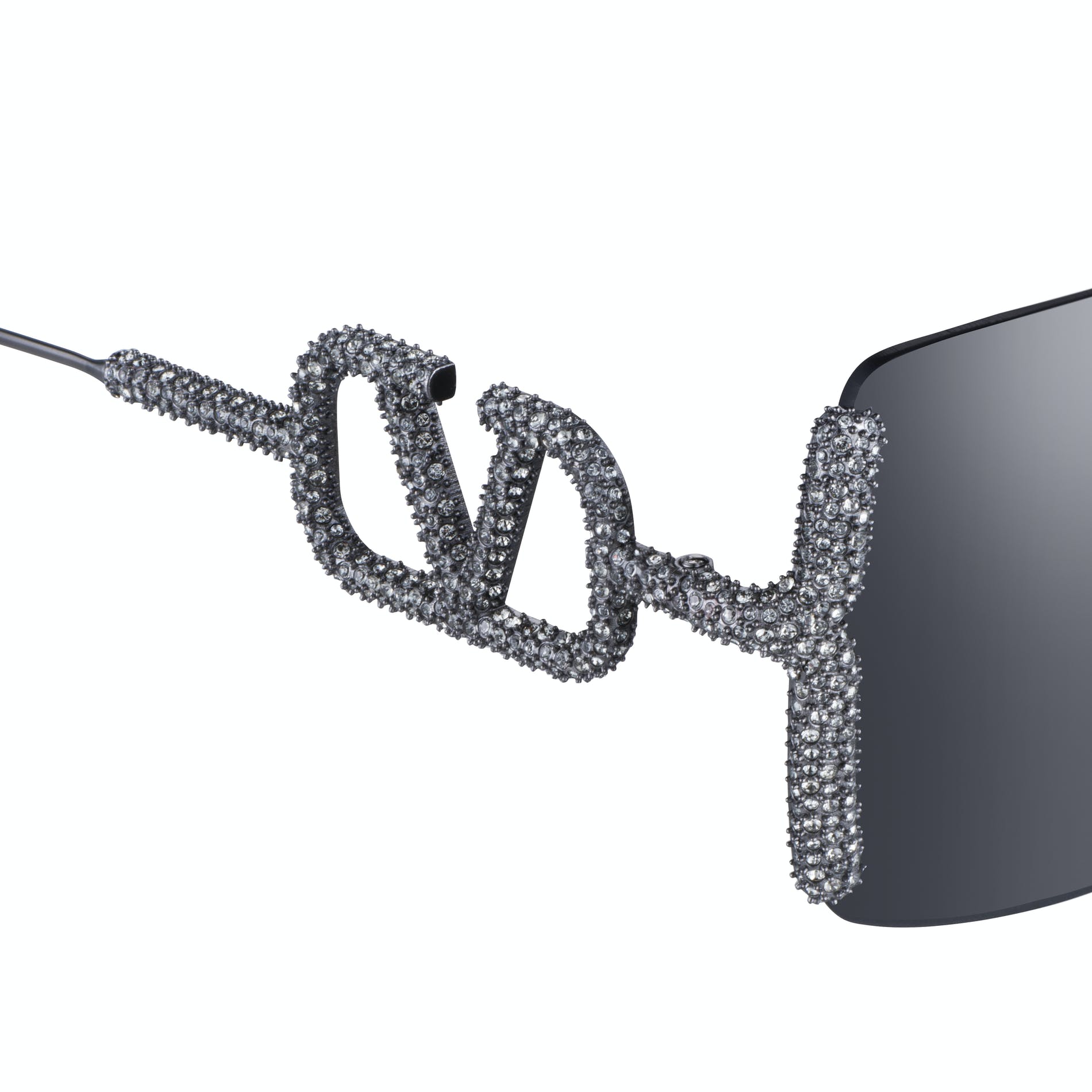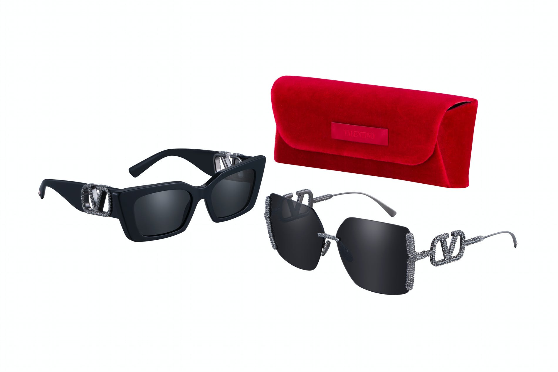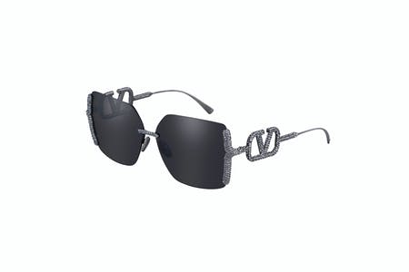 These ’70s-style jewel glasses have large grey gradient lenses and temples featuring a prominent V logo. The exquisite, slim ruthenium frame is covered – including the bridge and side rims – with a full pavé composed of Swarovski crystals and very small round studs that amplify its brightness. The model’s elegance, combined with its fine craftsmanship, lend it a charm that perfectly combines heritage and modernity. As usual, the temple tips are completed by the brand’s iconic stud. The glasses come in a Valentino red velvet case.