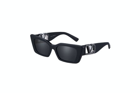 The focal point of these elegant rectangular sunglasses, which feature a bold profile with sculpted edges, is the temple, which is inset with an iconic full-size V logo. The monogram, a distinctly recognizable detail featured on many accessories in the SS2020 collection, is made of gunmetal metal and embellished by a sparkling pavé that mixes Swarovski crystals and tiny round studs that enhance its brightness. The exclusive craftsmanship also lightens the frame, giving the fit a perfect balance. Finished with the brand’s classic stud on the temple tip, the model comes in black or havana acetate with matching lenses, and is enclosed in a Valentino red velvet case.