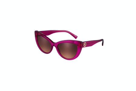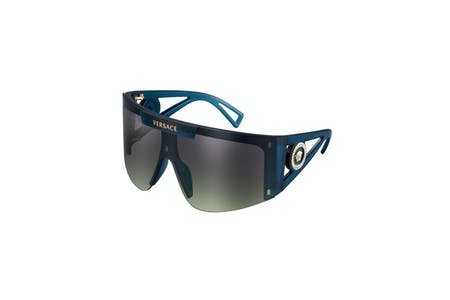 Seen on the Spring-Summer 2020 runway, this wrapped semi-rim shield style features wide and hollow tapered temples. The frame features a gold- tone logo, while the temples are enriched with a signature Medusa emblem. The sunglasses are available in transparent fuchsia or black with gradient orange to purple lens, in transparent petroleum or white with gradient petrol to yellow lens and in Havana with trigradient brown lens.