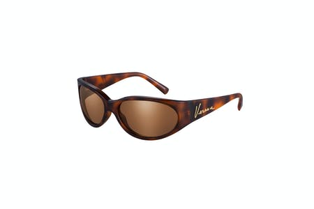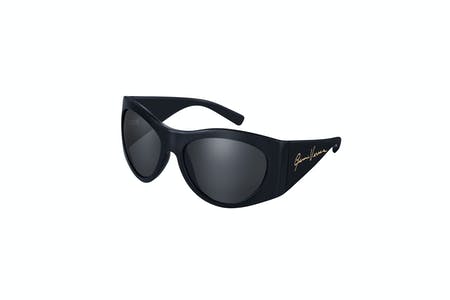 Futuristic oval sunglasses with a thin nylon fibre frame. The wide tapered temples are embellished with a handwritten autograph of Gianni Versace. The style is available in an array of shades, including Havana with bronze lenses and black with grey lenses.
