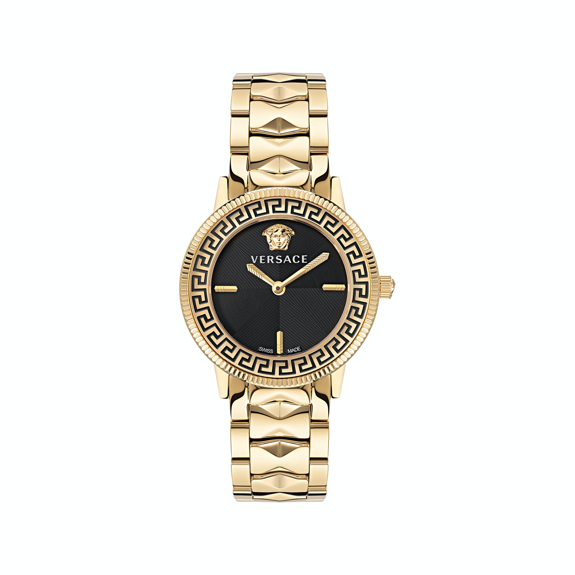 The strong personality of these watches is underscored by an enameled Greek key running around the top ring: not a simple decorative motif. With this geometric pattern, deeply rooted in the brand’s historical DNA, Versace underscores its ability to draw on the past to find new creative inspirations.