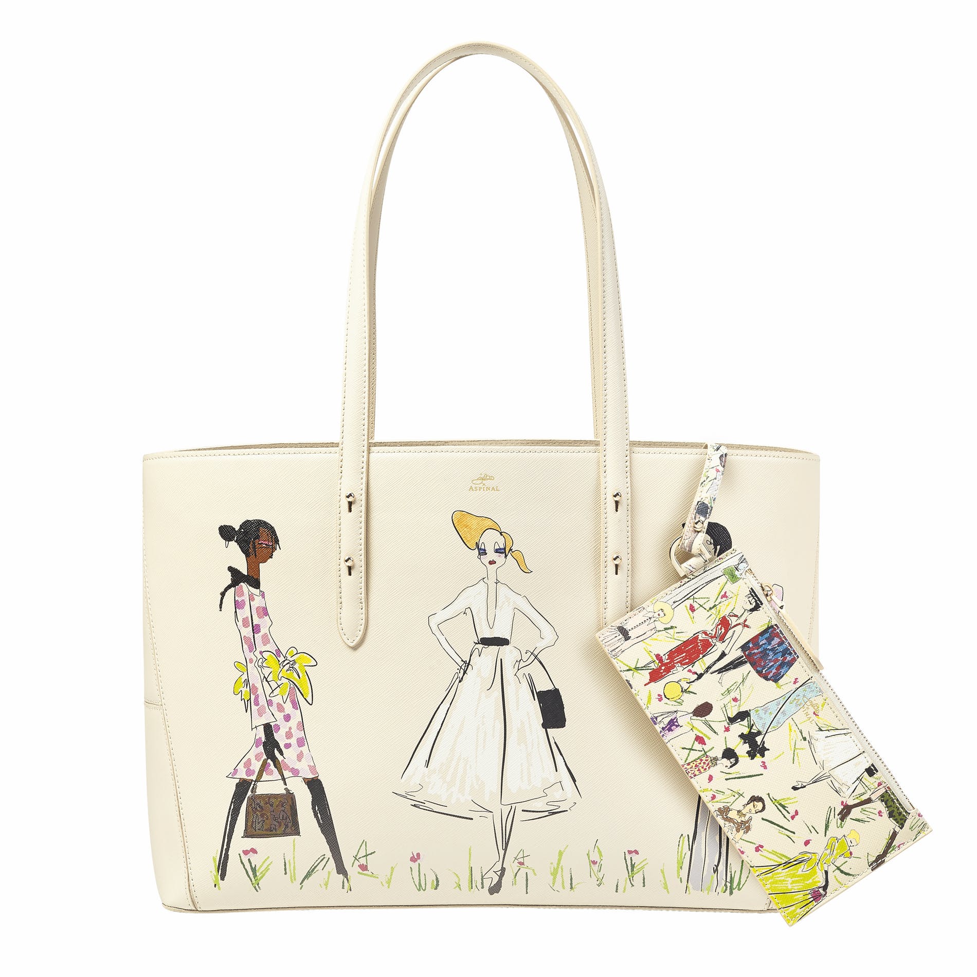 'Being a prolific illustrator, I thought it would be the perfect place to create some Giles/Aspinal, globally-inclusive, cosmopolitan girls and women and get them wearing and carrying my designs. The design process for me always begins with the character – it’s who’s going to be wearing the piece and where she’s going. These are quintessential English girls, zooming around and having a good time in their frocks. They love the town and the countryside, they love fashion, quality and a bit of quintessentially English playfulness.’
