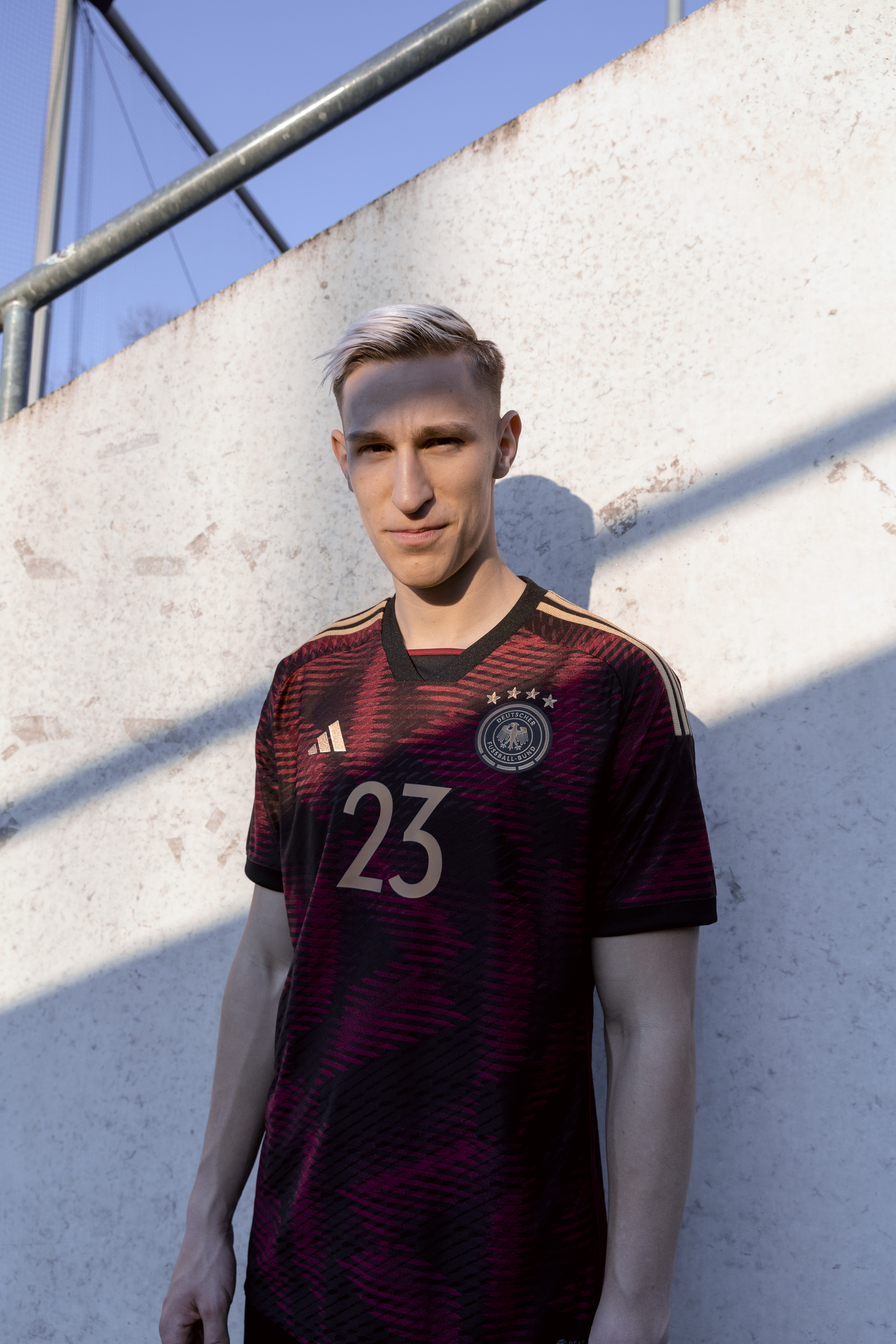 Placed over the heart and detailed in gold, a heat-applied team badge takes centre stage on Germany’s home jersey, whilst a bold vertical stripe inspired by the very first Germany shirt, elevates the classic clean aesthetic to new levels. Detailing on the collar and shirt bindings display the iconic colors of the nation’s flag. The away jersey captures the spirit of the team, using the colors of the national flag and blurring the ‘D’ of ‘Deutschland’ to reflect the dynamic football played by the squad.