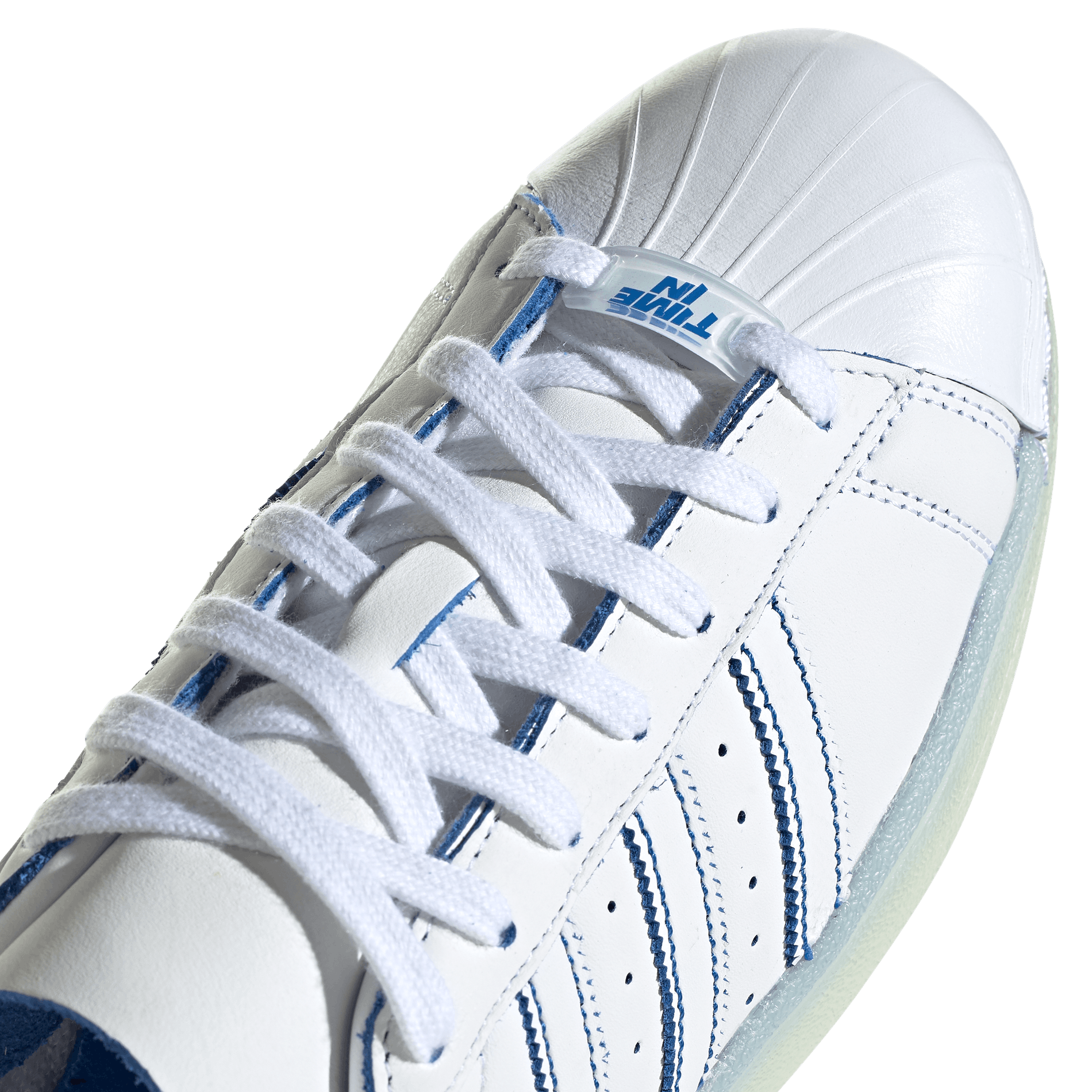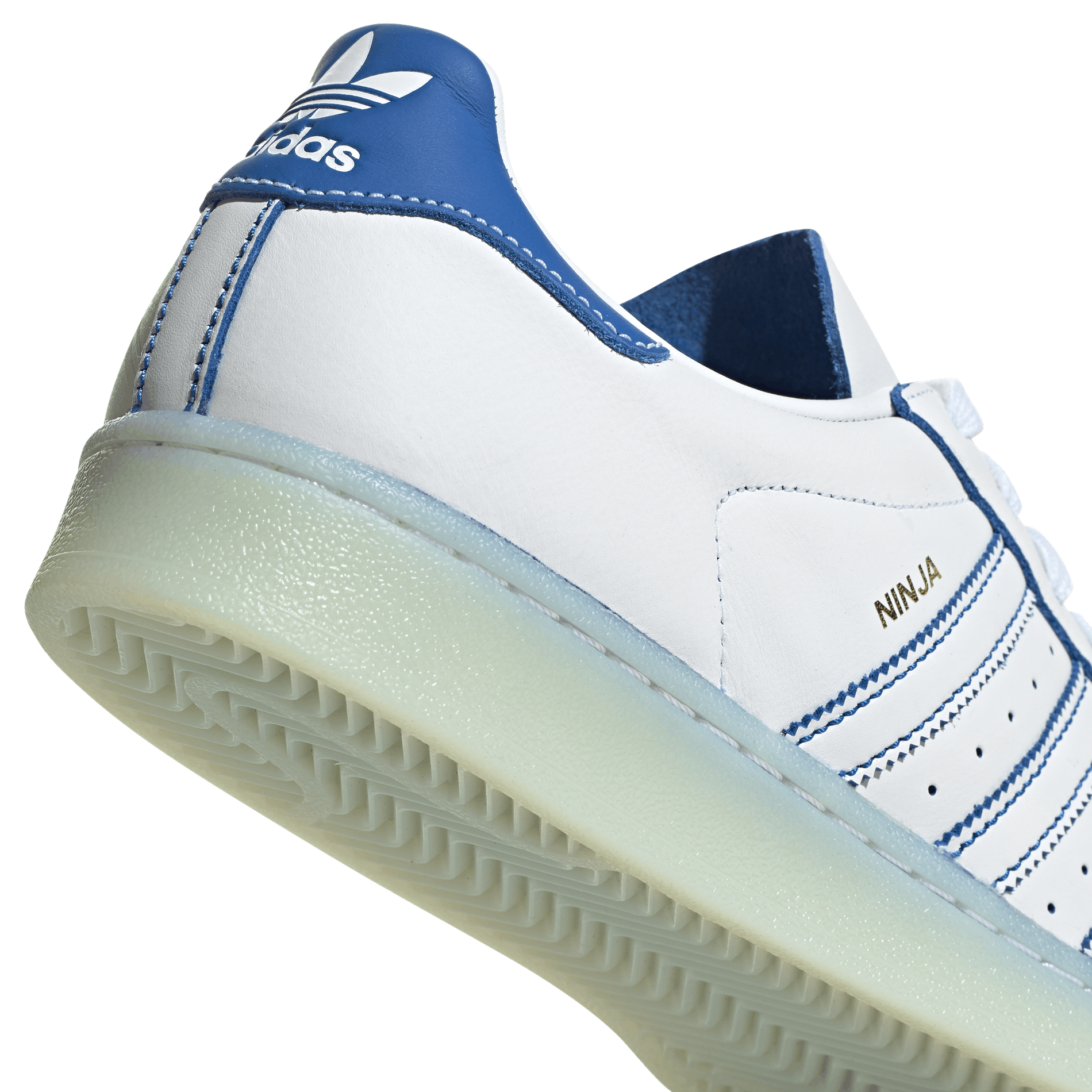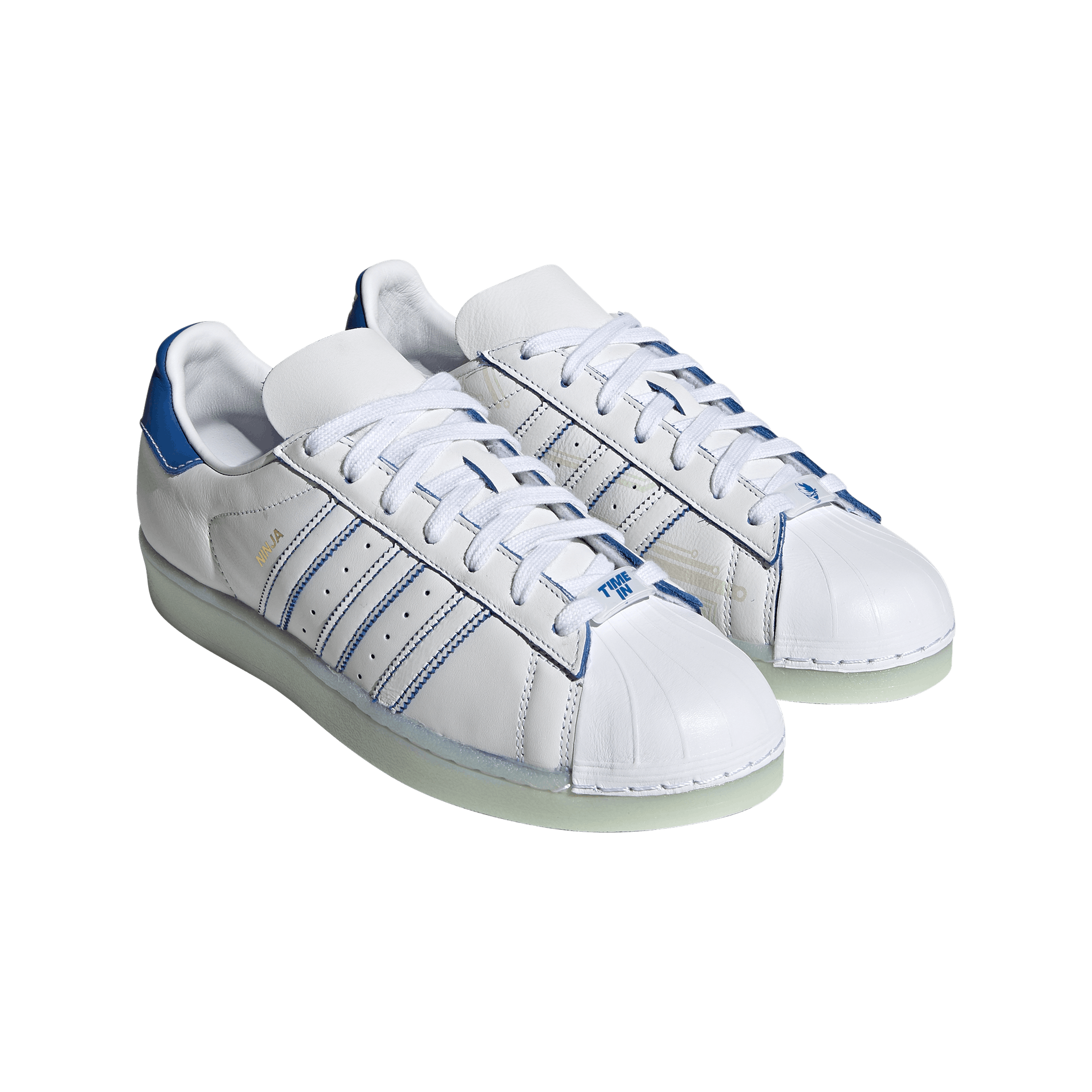 The Ninja Superstar 50 sneaker features a number of playful details. Made up in an all-white leather upper with a leather shell-toe, Ninja’s signature flair is brought to life through contrasting blue accents. Riffing on the idea that Ninja’s gameplay is so great that he must be powered by internal microchips, the medial side of the shoe features an embossed computer chip graphic. Finally, rounding out the look are co-branded lace jewels and sock liners.